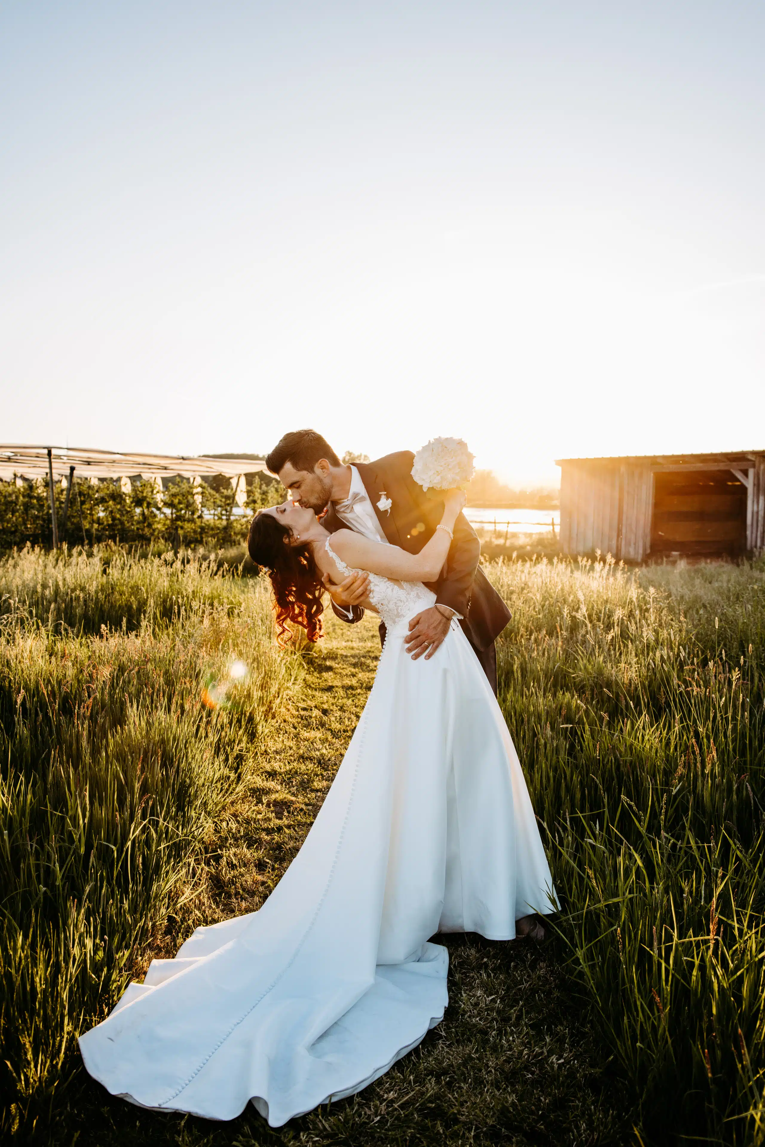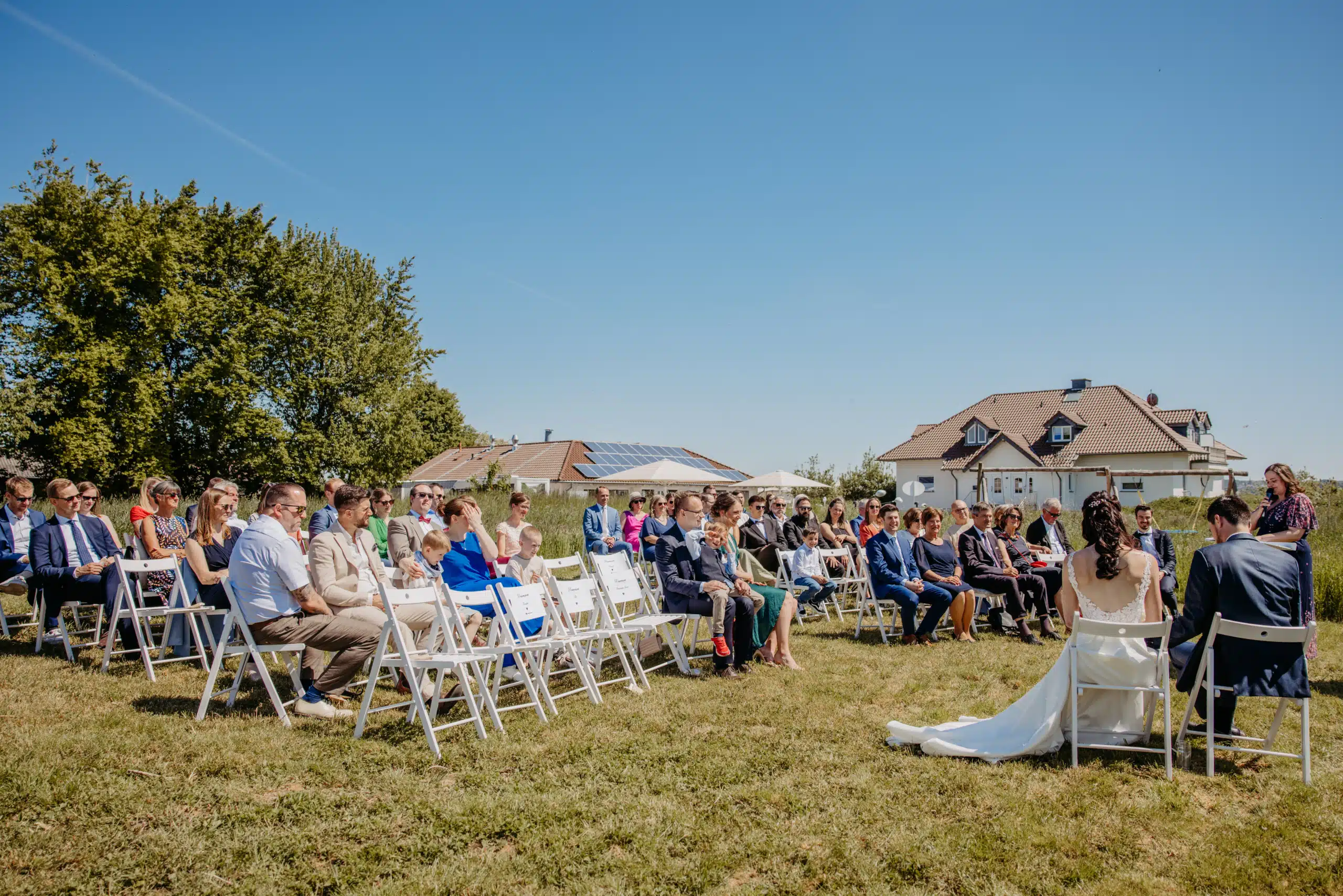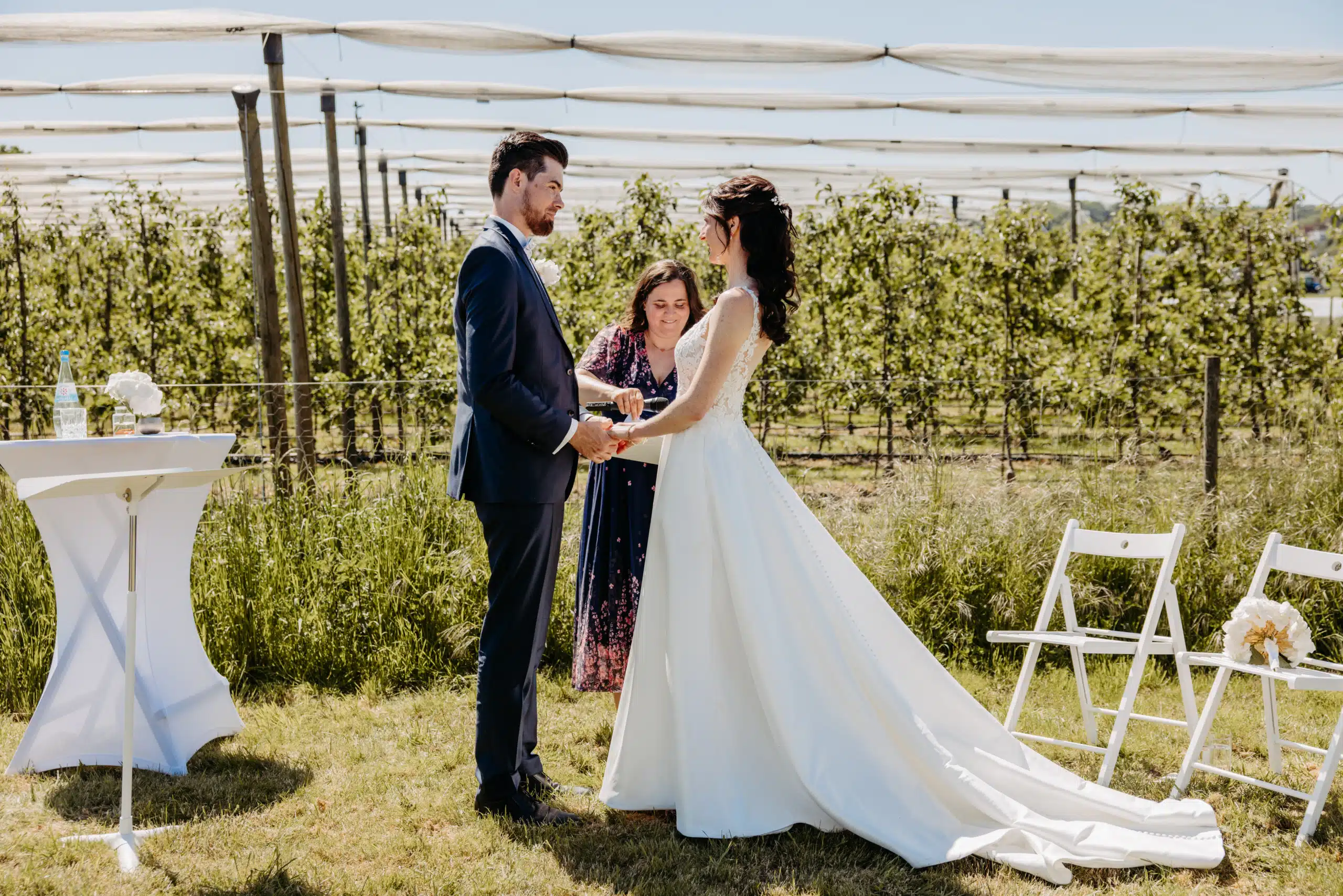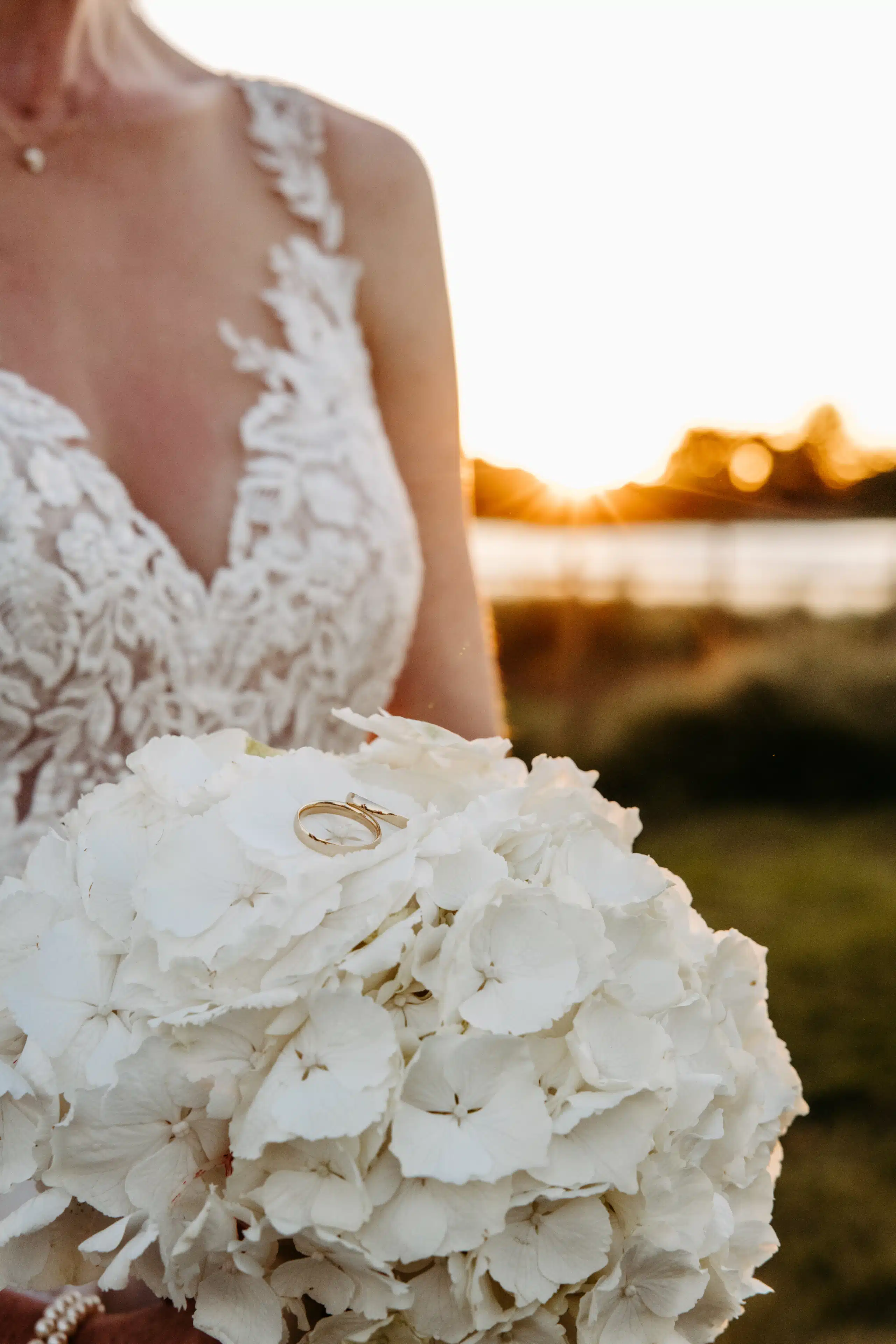 Pur. Modern. Authentisch: Zwischen blauem Himmel bei strahlendem Sonnenschein und Erde mitten auf dem Feld sind mein Mann und ich aufeinander getroffen: Meine Mama hat mich zu ihm geführt. Umgeben von hohem Gras haben wir unsere freie Trauung durchgeführt. Es gab nur Natur und unsere Herzensmenschen. Uns war das Gefühl wichtig und nicht die Inszenierung. In Schwarz, Gold und Weiß haben wir unsere Deko gehalten mit dekorativen weißen Bauernhortensien, wie auch mein Brautstrauß. Wir mögen es zeitlos, klar und reduziert. Der Sektempfang wurde von einer uns überraschenden musikalischen Saxophon-Einheit begleitet bevor der Nachmittag auf dem wunderbaren Gelände mit Wallabys seinen Lauf nahm. Neben vielen Fotos in allen Konstellationen, gab es herzhafte und süße Häppchen gepaart mit herzlichen Gesprächen und herzerwärmenden Wiedersehen. Unser magisches Fotoshooting dank eines traumhaften Sonnenunterganges haben wir sehr genossen zwischen sehr leckeren kulinarischen Genüssen.