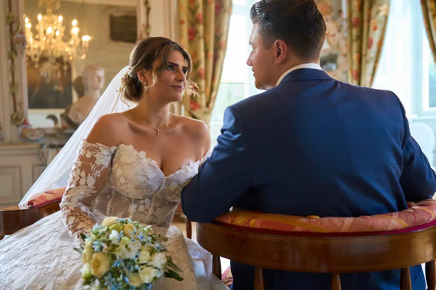 Unsere Vision für unsere Hochzeit war eine sinnliche Mischung aus der Leichtigkeit eines italienischen Abendspaziergangs durch historische Gassen und der zeitlosen Eleganz von Bridgerton. Wir wollten eine Atmosphäre schaffen, die zugleich mediterran, verträumt und aristokratisch anmutet – geprägt von zarten Blau-Weiß-Nuancen und üppigen Hortensienarrangements, die den Raum in romantisches Licht tauchten.