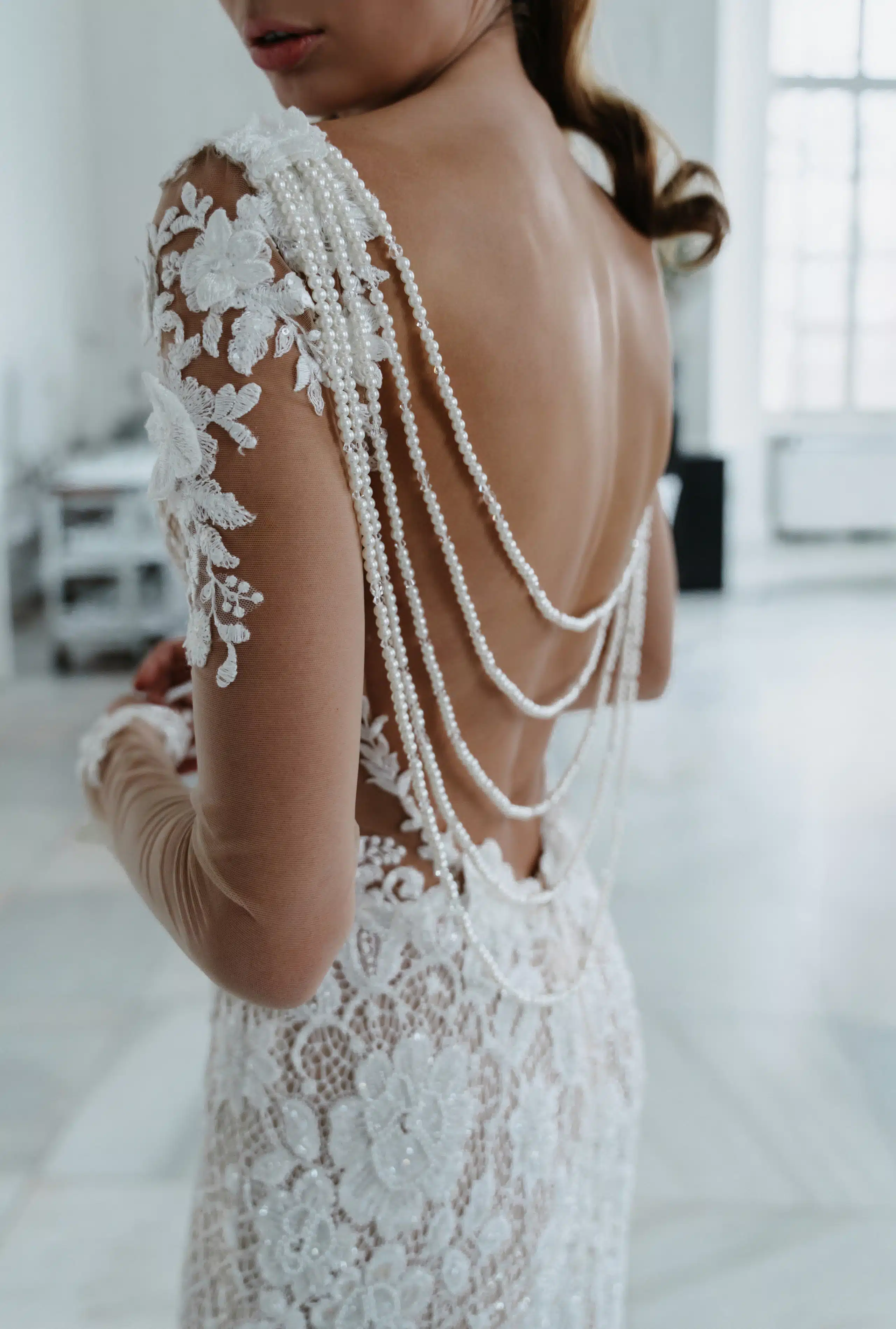 Es war Liebe auf den ersten Blick, ich habe mich lange mit Brautkleidern befasst und Rhiannon war es dann einfach sofort. Ich wollte ein luxuriöses Fit-and-Flair Kleid mit besonderen Details, Spitze und, dass die Silhouette durchschimmert. Die Perlenkette am offenen Rücken ist traumhaft. Ich wusste direkt, dass es mein Kleid werden würde.