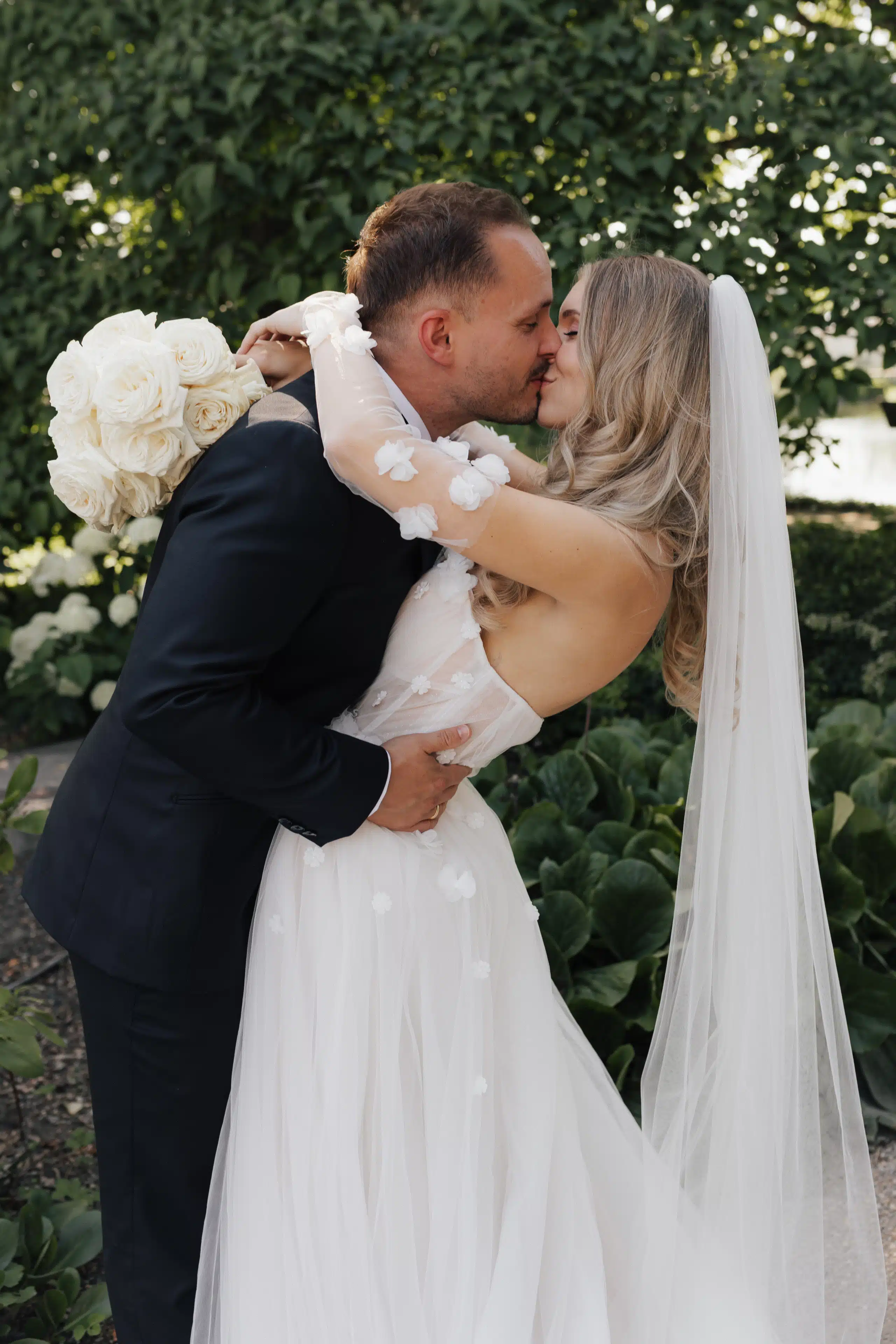 Unseren Hochzeitsstil würde ich als modern-elegant mit einer minimalistischen Linie beschreiben. Uns war es wichtig, eine dezente Atmosphäre zu schaffen, die pure Eleganz ausstrahlt. Einzelne weiße Rosen und Kerzen in schlichten Glasvasen, Wellentische mit fließenden Tischdecken und weiße Holzstühle haben unsere Location für unseren Geschmack auf eine stilvolle Weise ausgefüllt und den Charakter der Location perfekt unterstrichen.