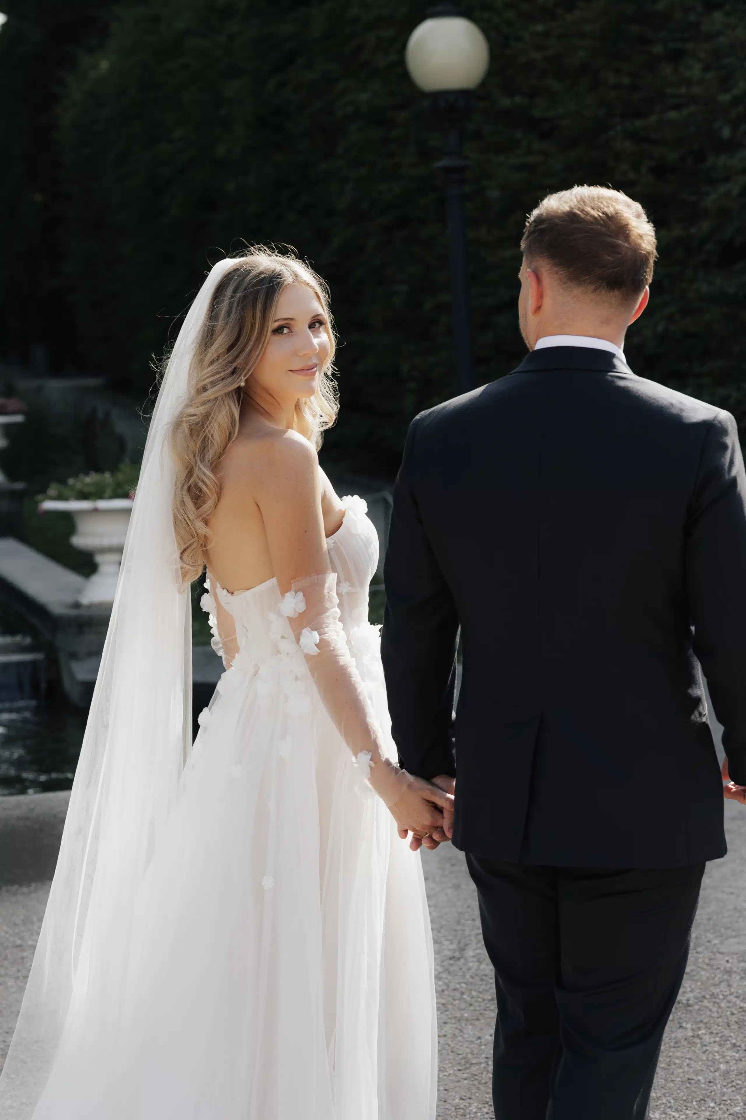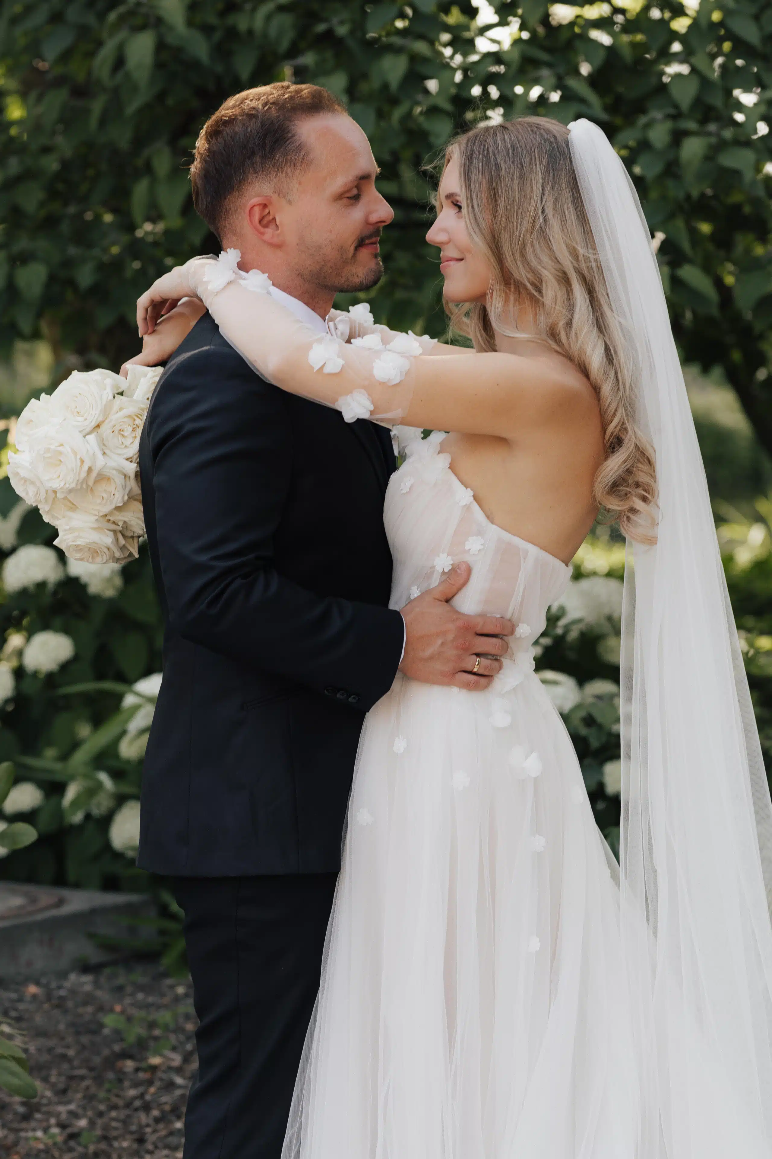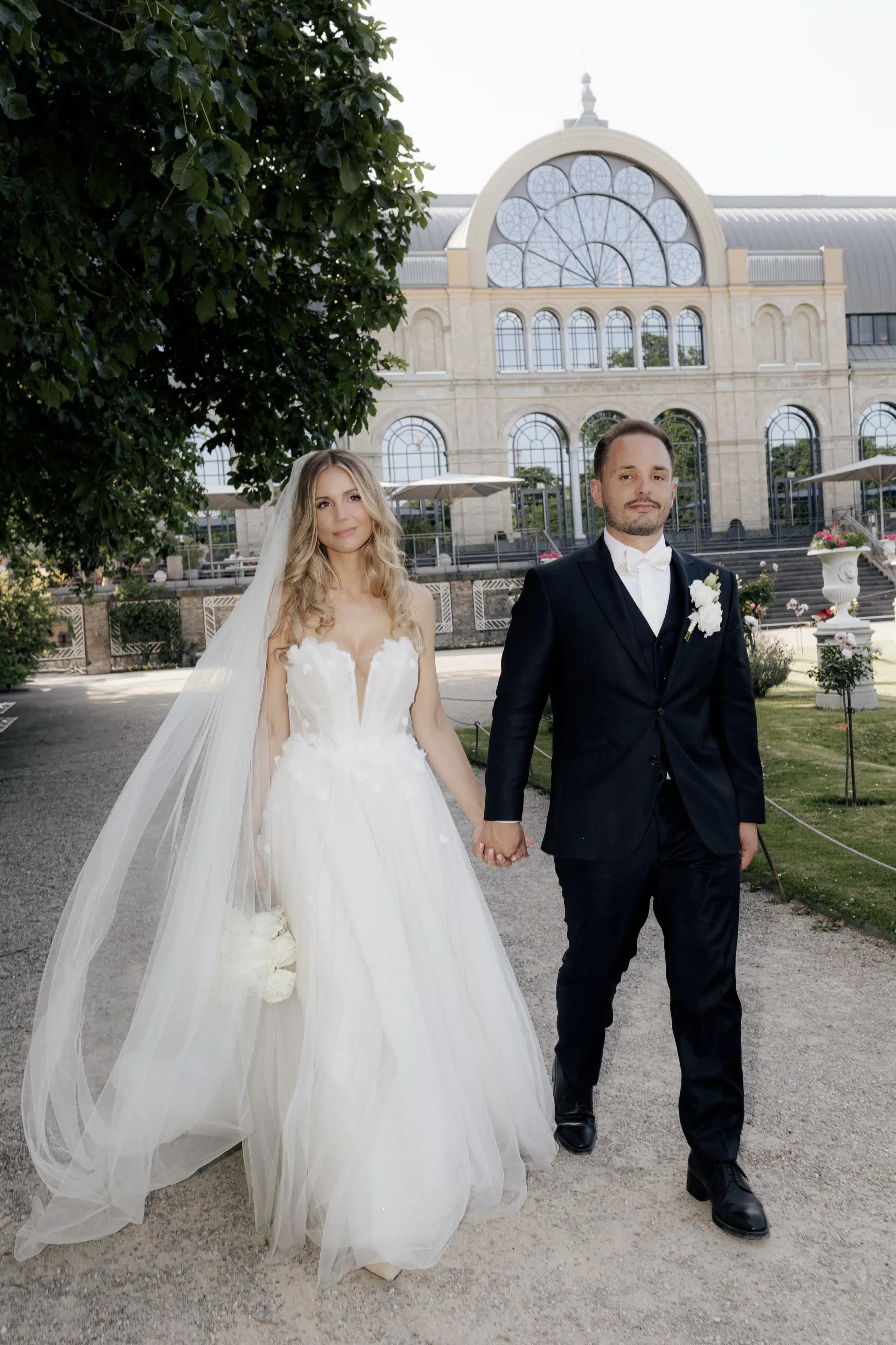 Ich hatte relativ früh den Wunsch, passende Ärmel im Stil des Kleides selbst zu gestalten, die ich im Laufe des Tages abnehmen kann, um so einen zweiten, wandelbaren Look zu schaffen. Meine Schneiderin hat diese Idee ganz nach meinen Vorstellungen umgesetzt. So hat das Kleid nicht nur perfekt zu mir gepasst, sondern auch meinen Stil in jeder Hinsicht verkörpert.