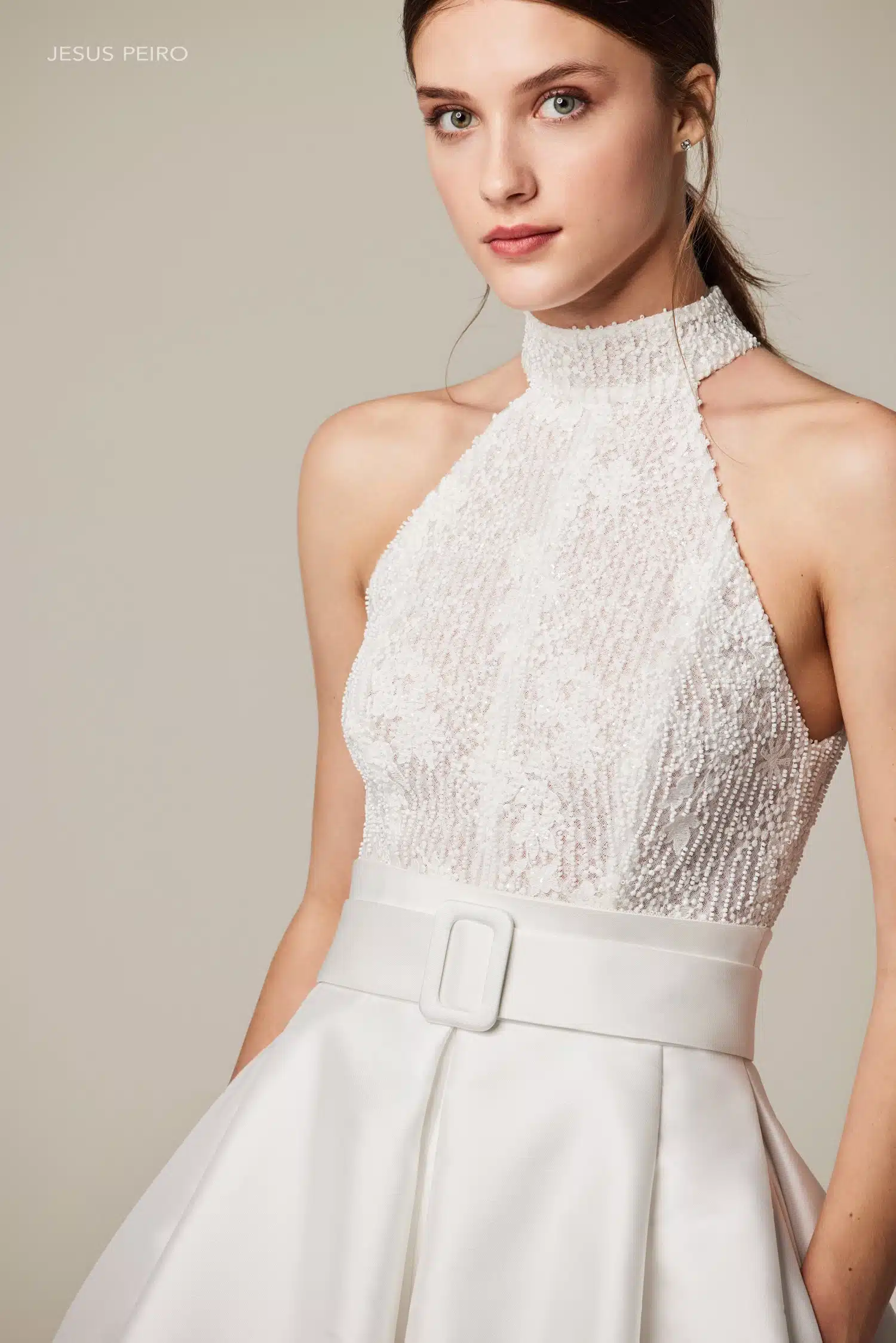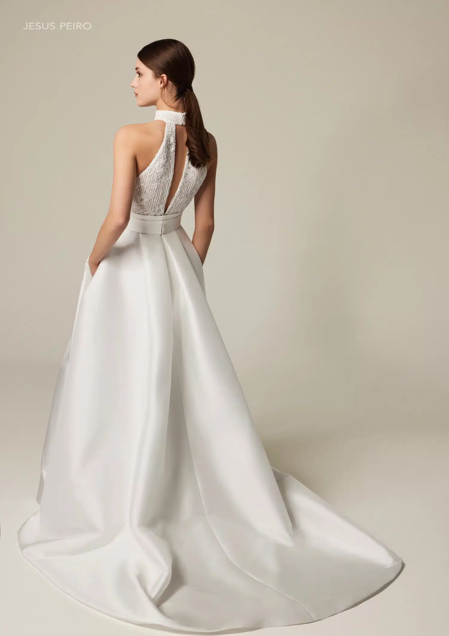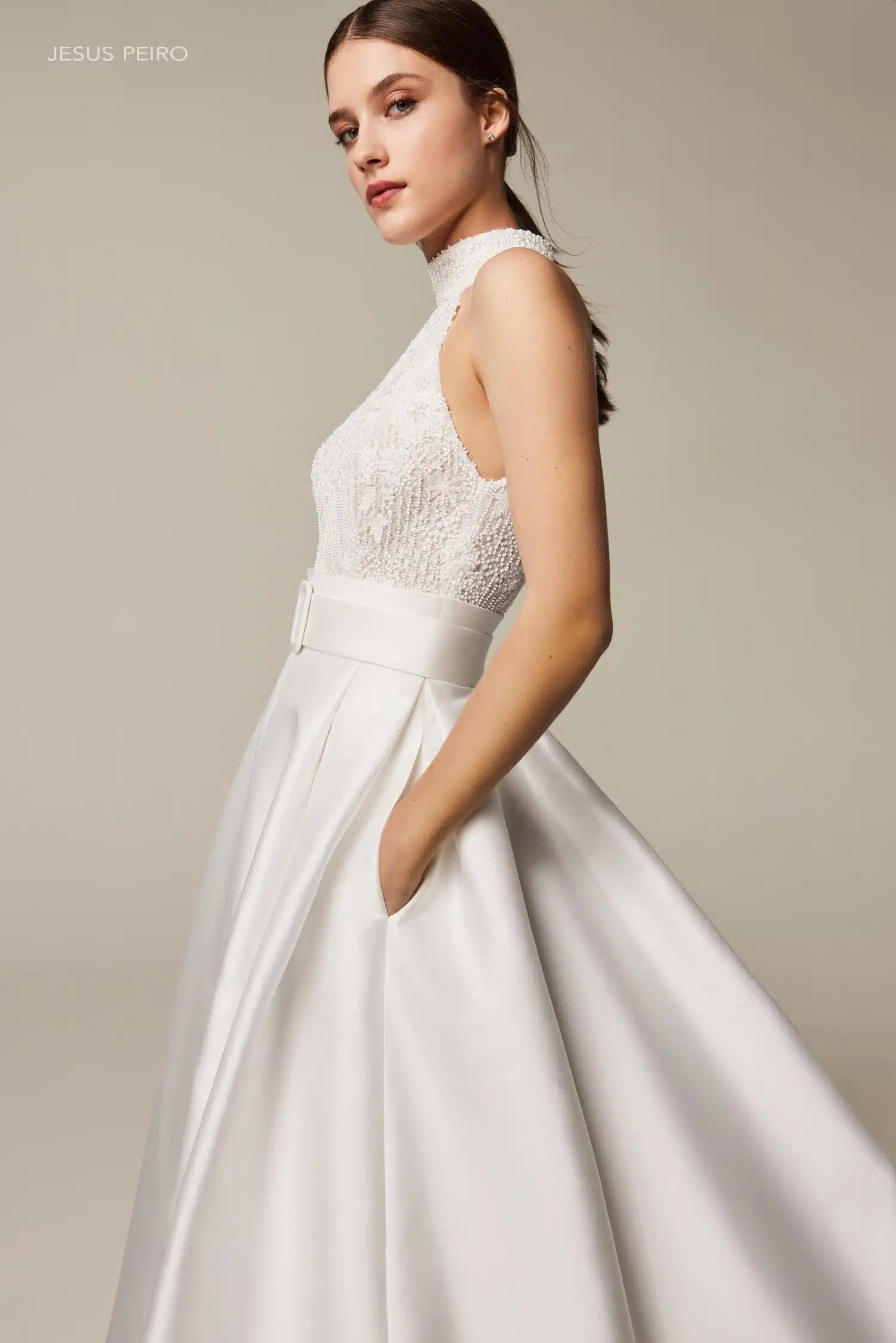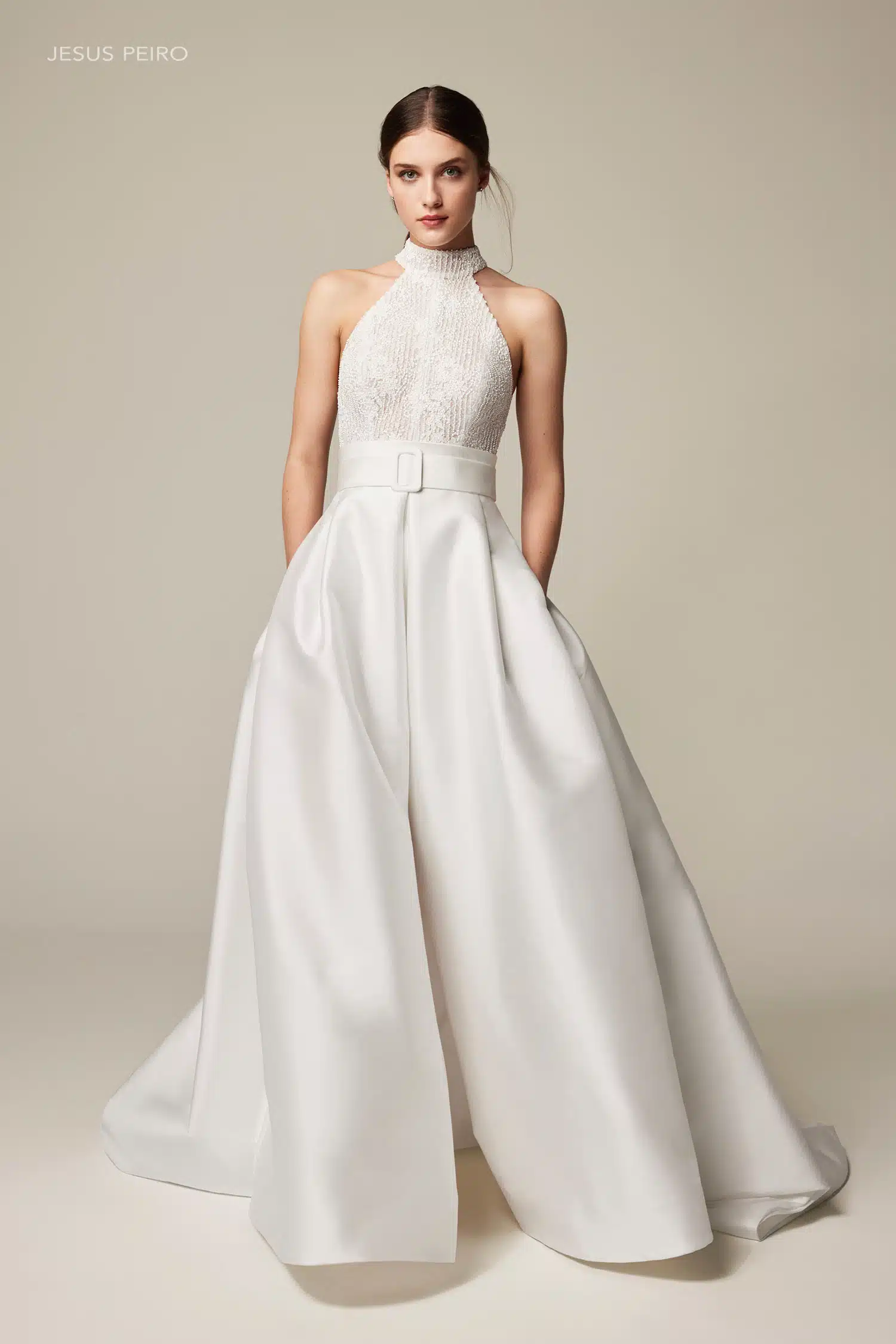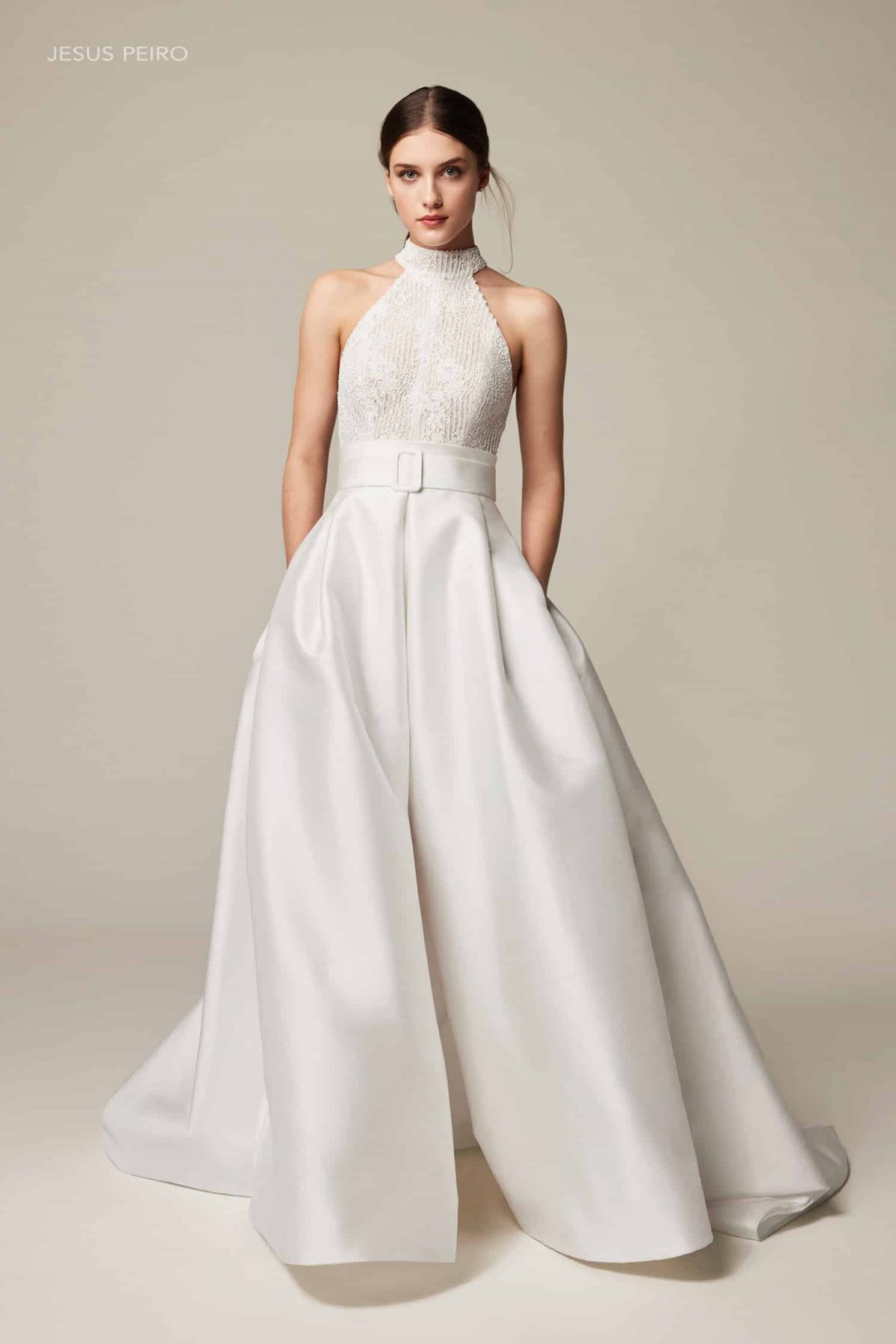 Dieses Brautkleid ist ein echtes Statement: Voluminös und gleichzeitig modern. Die Kombination aus fein besticktem Tüll und edlem Mikado-Taft verleiht dem Rock beeindruckende Fülle und eine luxuriöse Struktur. Das Dolce-Vita-Oberteil mit amerikanischem Armausschnitt und elegantem Neckholder setzt Schultern und Rücken stilvoll in Szene. Ein zentraler Schlitz im Rock sorgt für eine selbstbewusste, zeitgemäße Note, während der Gürtel die Taille klar definiert. Ein Look für Bräute, die klassische Eleganz lieben – mit einem modernen Twist.