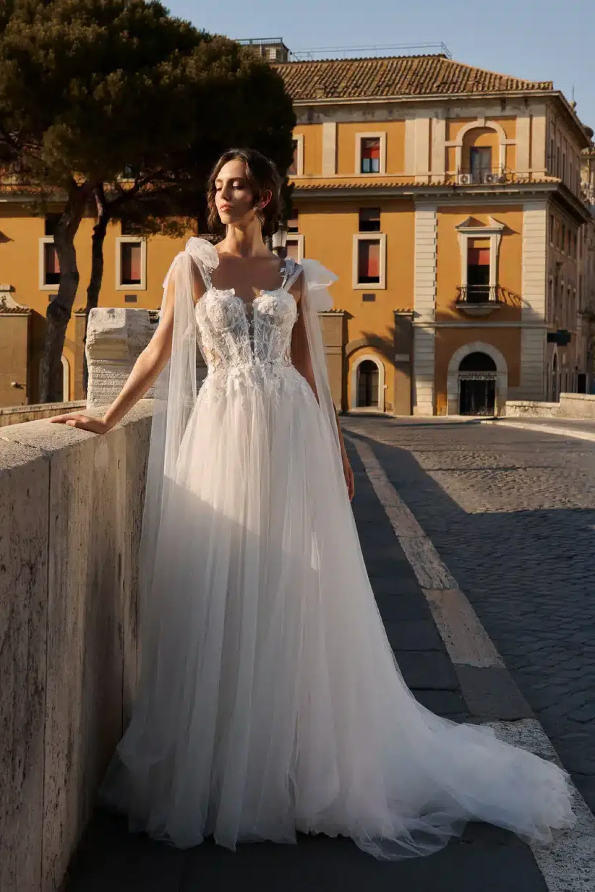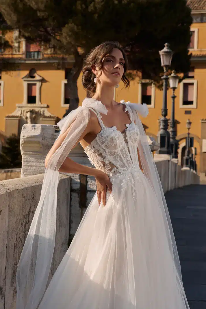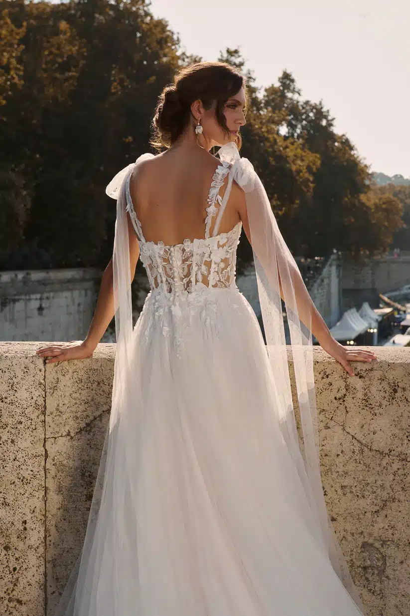 26011 begeistert mit einem kunstvoll bestickten, halbtransparenten Corsagen-Oberteil, das durch seine floralen 3D-Applikationen und zarten Tüll-Träger verführt. Die abnehmbaren, locker fallenden Tüllärmchen verleihen dem Look eine verspielte Note. Der fließende Tüllrock fällt leicht und umspielt die Silhouette auf sanfte Weise – ideal für moderne Romantikerinnen.