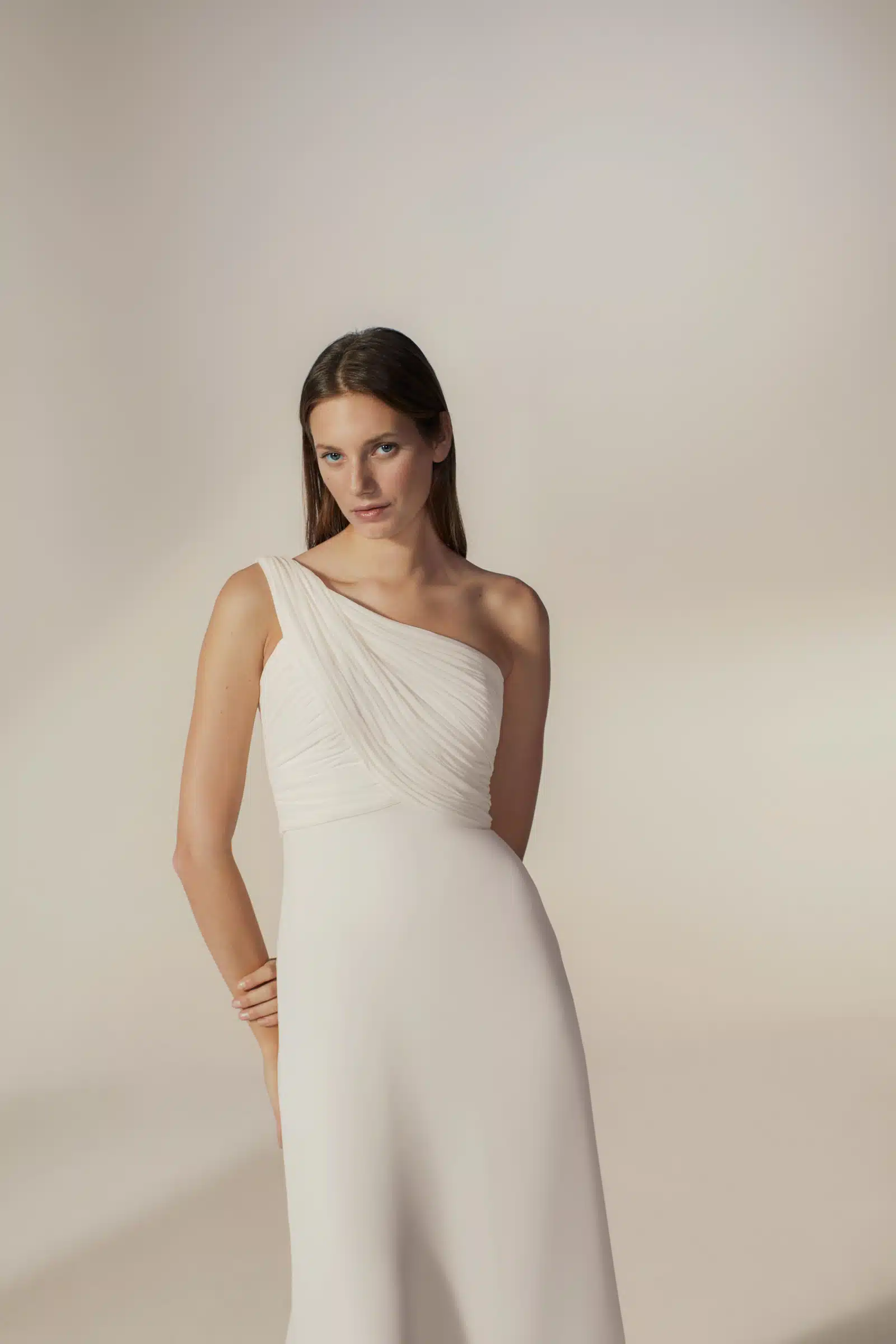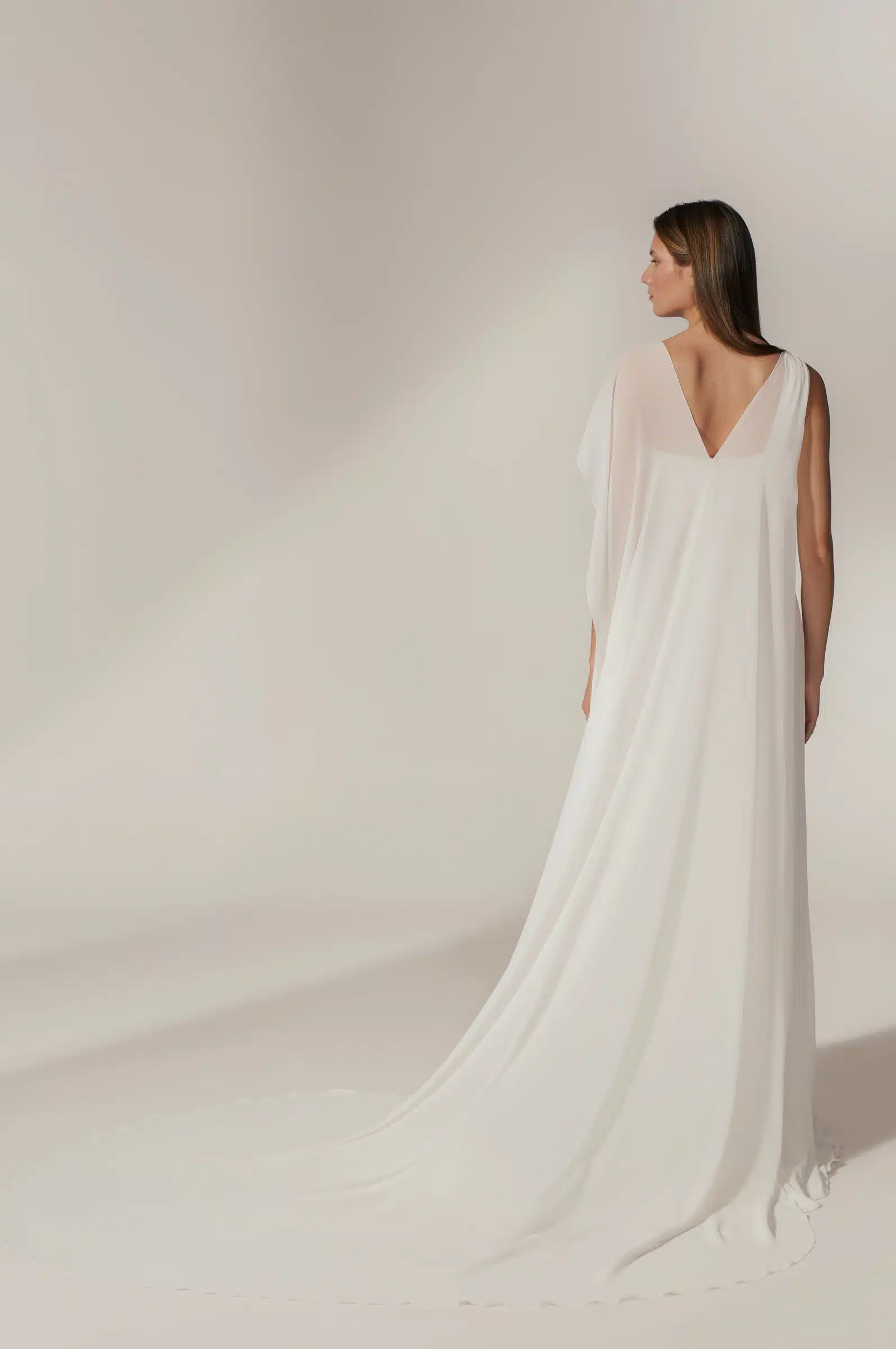 Dieses asymmetrisch drapierte Brautkleid aus fließendem Chiffon begeistert mit einer femininen A-Linie und einer schmeichelnden hohen Taille. Das abnehmbare Cape verleiht dem Look eine besondere Eleganz – wandelbar, stilvoll und perfekt für einen unvergesslichen Auftritt vom Ja-Wort bis zur Feier.