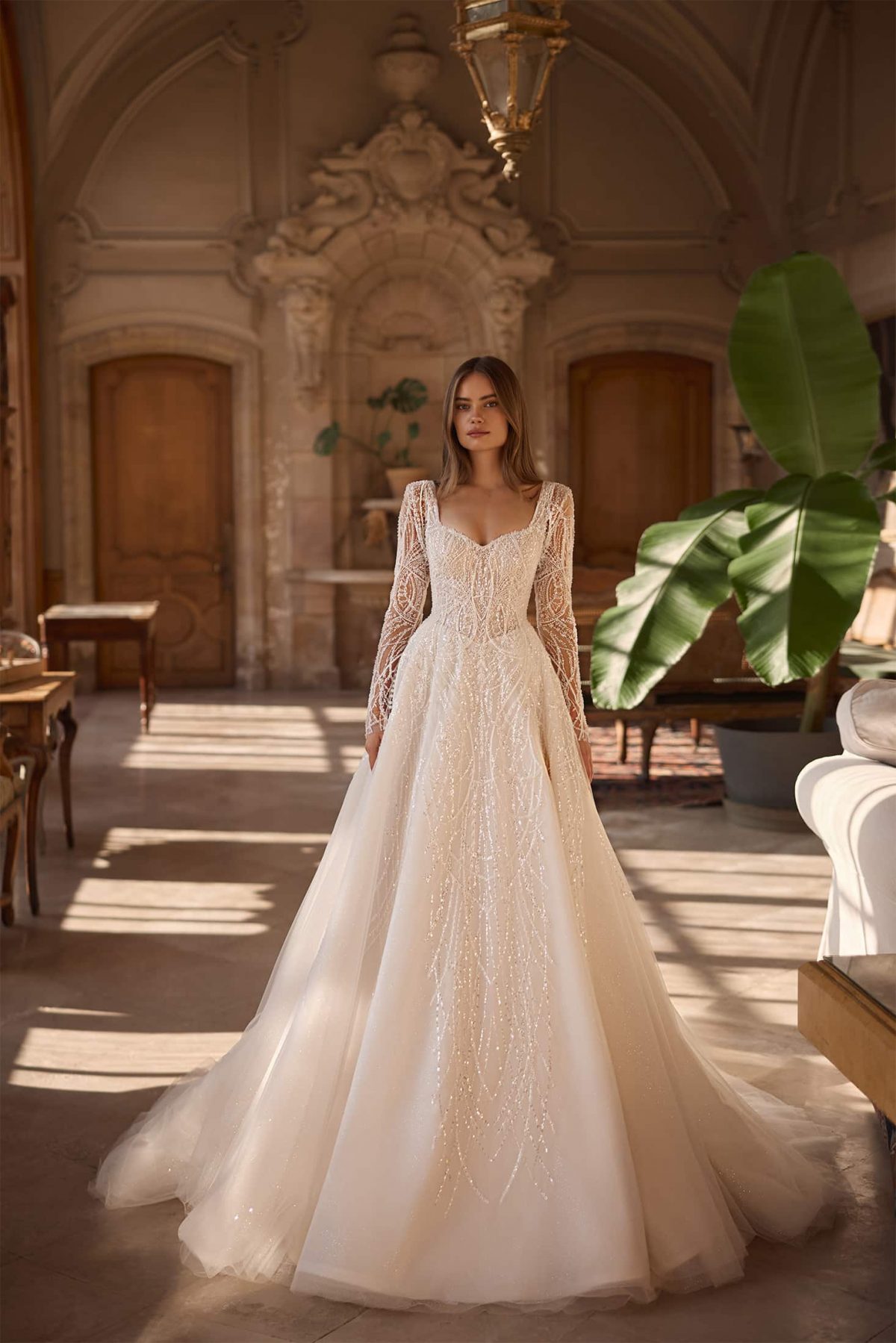 Das Brautkleid vereint luxuriösen Glitzer-Allover mit einem modernen, femininen Schnitt. Der edle Mix aus Herz- und V-Ausschnitt setzt dein Dekolleté perfekt in Szene, während die breiteren Träger für eleganten Halt und eine schmeichelnde Silhouette sorgen. Die figurbetonende Basque Waist betont deine Taille, bevor der ausladende Rock in funkelnder Opulenz erblüht – wie ein Sternenhimmel in Bewegung.