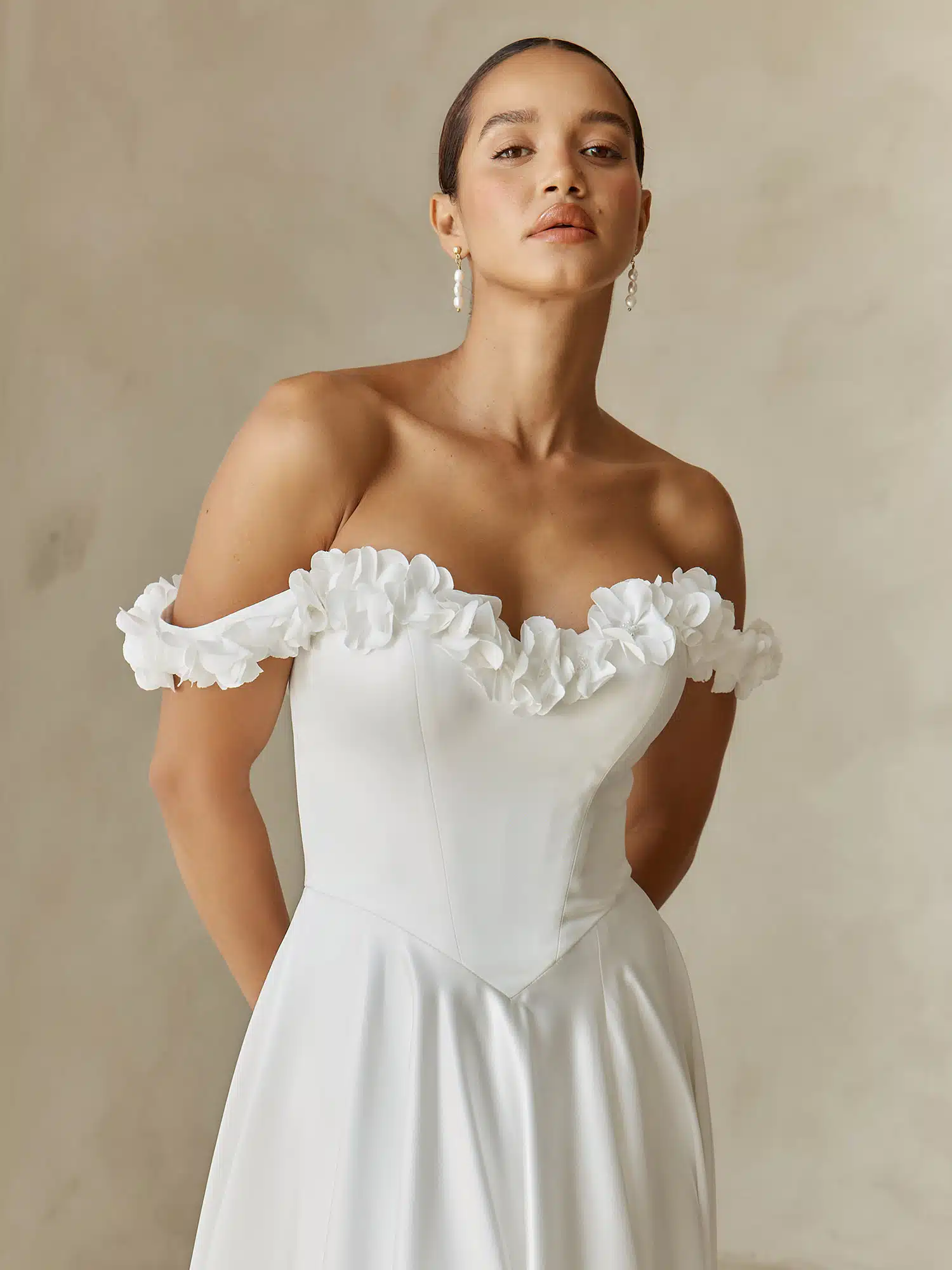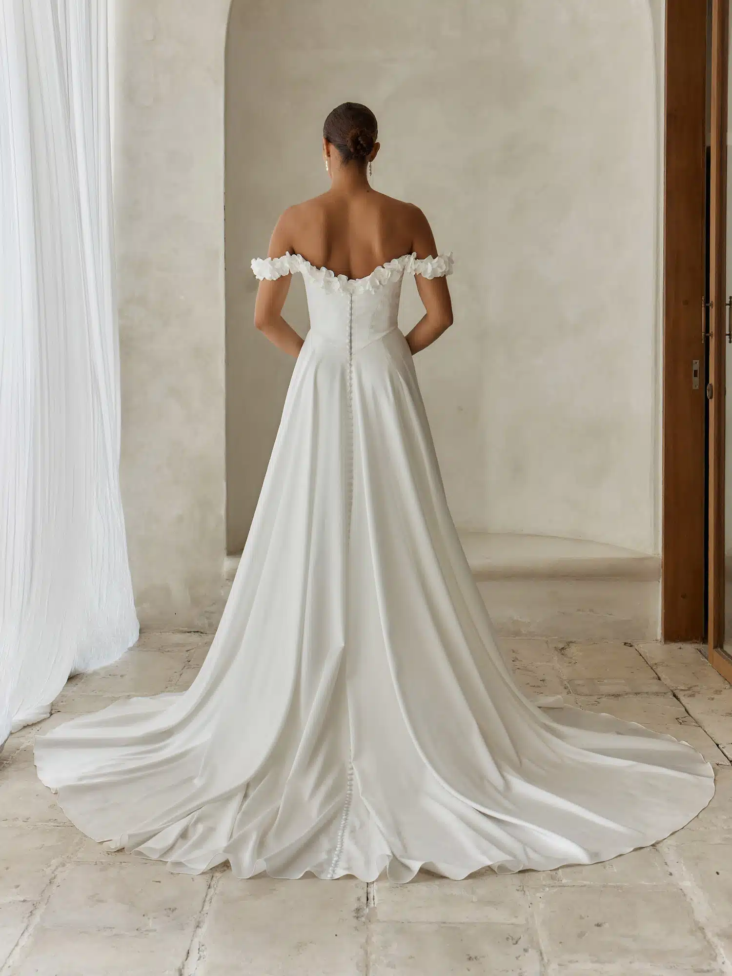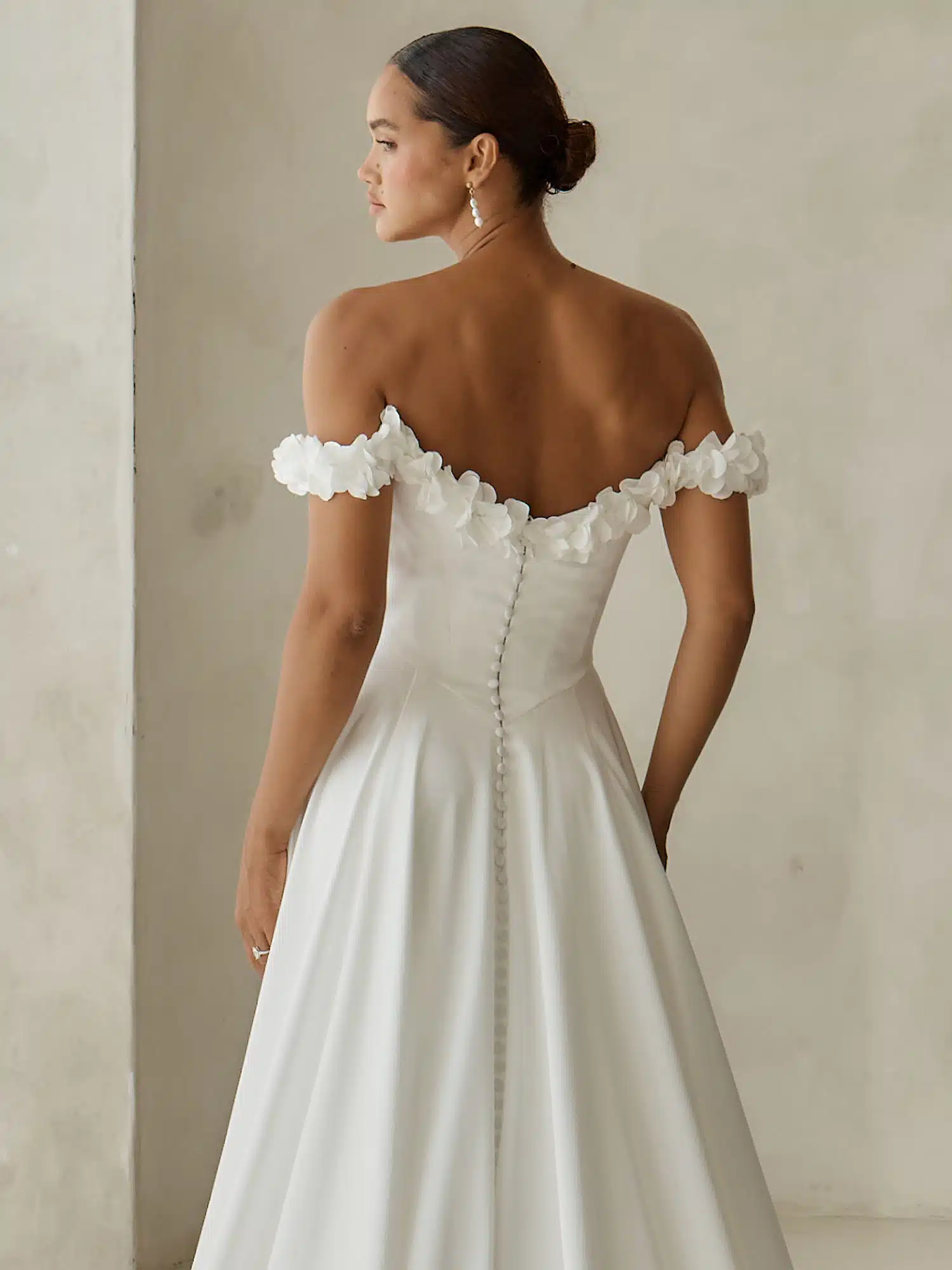 Das Brautkleid „Alba“ ist topaktuell und besticht durch eine Anmut, die es für romantische Bräute zu einem wahr gewordenen Traum macht. Das Kleid wurde aus Stretch-Satin gefertigt und besticht durch eine klare, bequeme Silhouette. Der Herzausschnitt des Oberteils geht in schulterfreie Träger über. Das Dekolleté und die Schultern sind mit handgeperlten 3D-Blumen verziert. Diese Blumen verleihen dem ansonsten schnittigen Design einen Hauch von Struktur. Das Motiv setzt sich auch auf dem Rücken fort, um sicherzustellen, dass das Detail durchgeht und der Look ausgewogen ist. Eine Basken-Taille betont die Figur und sorgt für eine Silhouette, die jeder Braut schmeichelt. Der Rock ist an der Taille gerafft, um dem gesamten Kleid Bewegung zu verleihen. Ein zarter Beinschlitz sorgt dafür, dass die Braut ihren besonderen Tag bequem genießen kann. Abgerundet wird das Kleid durch eine vertikale Knopfreihe am Rücken, die vom oberen Ende des Rückenteils bis zum Saum der eleganten Schleppe verläuft.