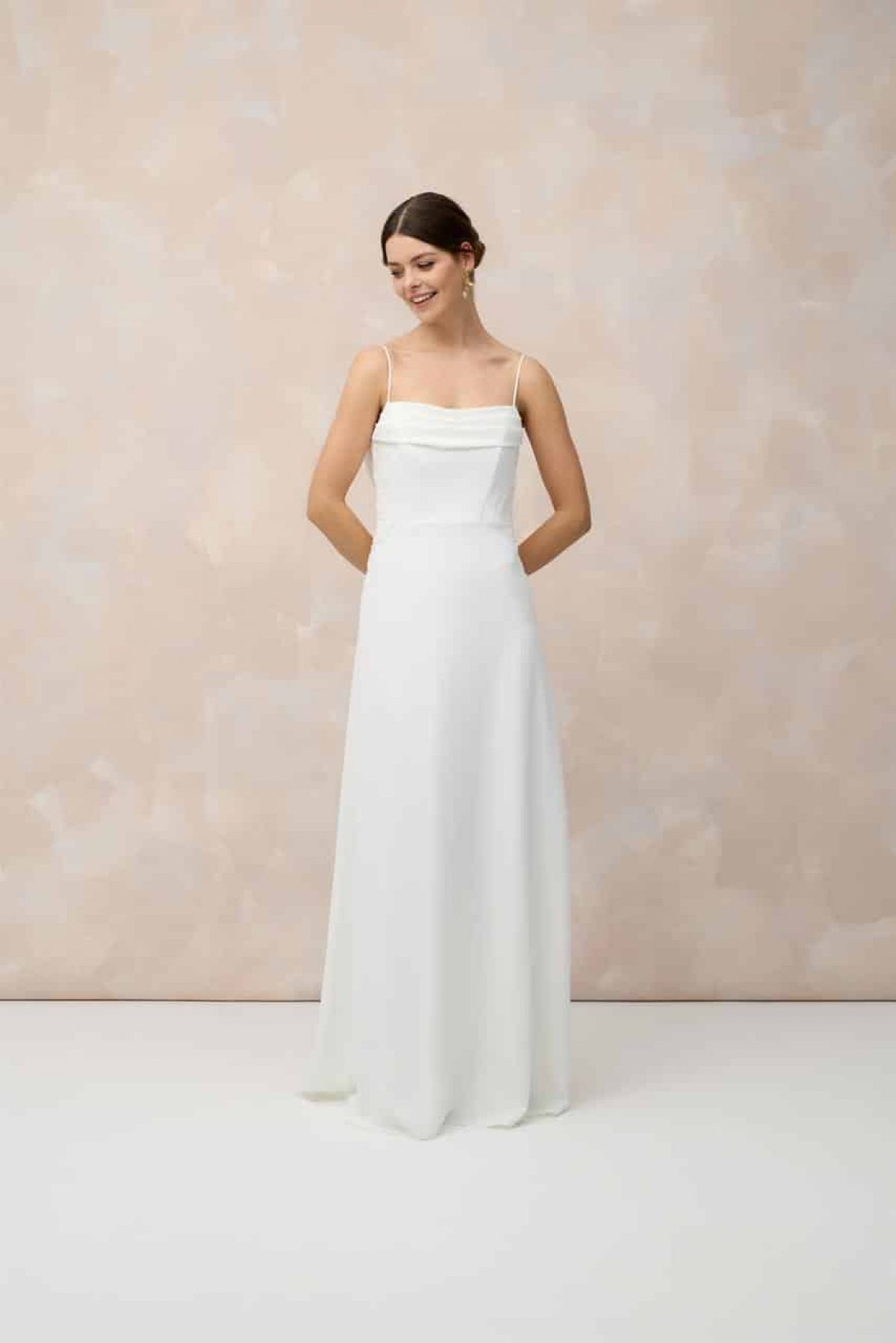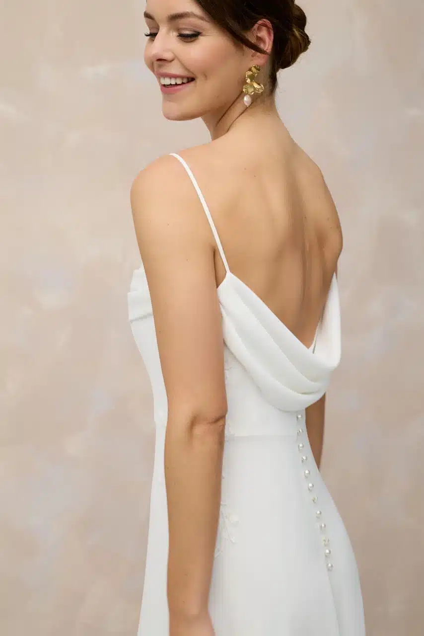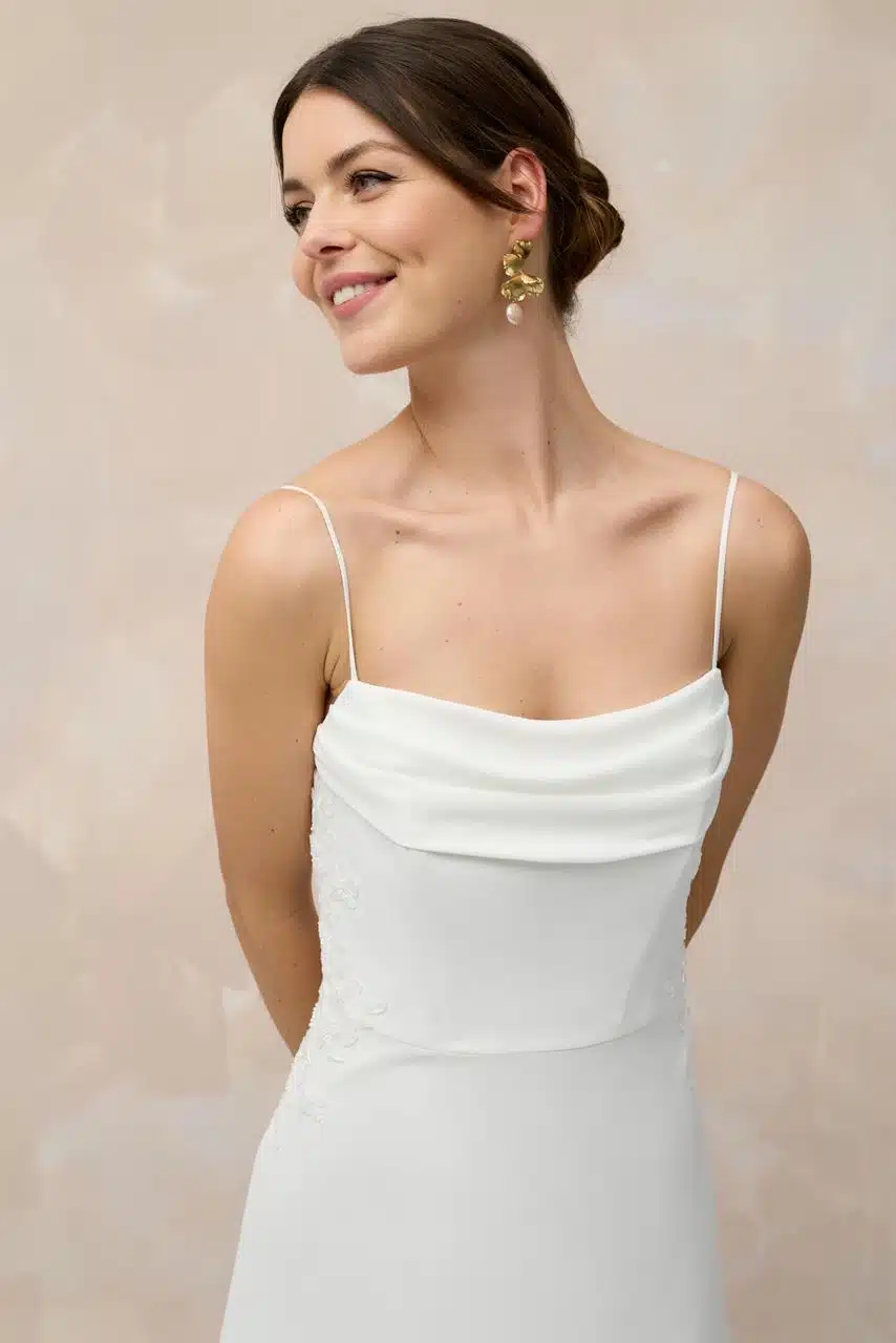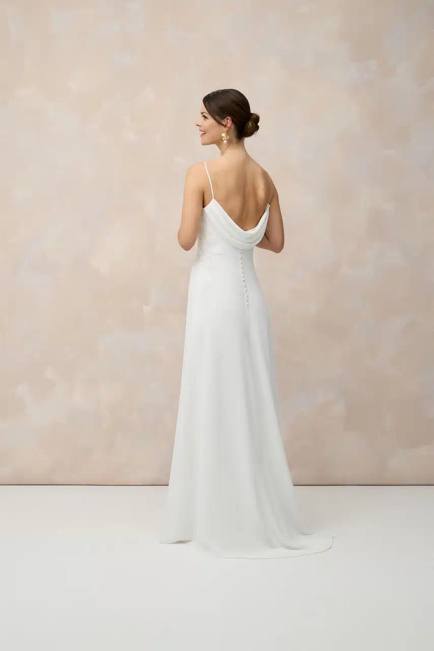 Ein raffiniertes Säulenkleid aus Crepe. Alfi hat einen geraden Ausschnitt mit weicher Drapierung und Spaghettiträgern, die zu einem offenen Rücken mit Kutte führen. Die Seiten des strukturierten Mieders sind mit Blütenspitzenapplikationen und Perlenakzenten versehen. Der Rock hat eine geschwungene Schleppe.