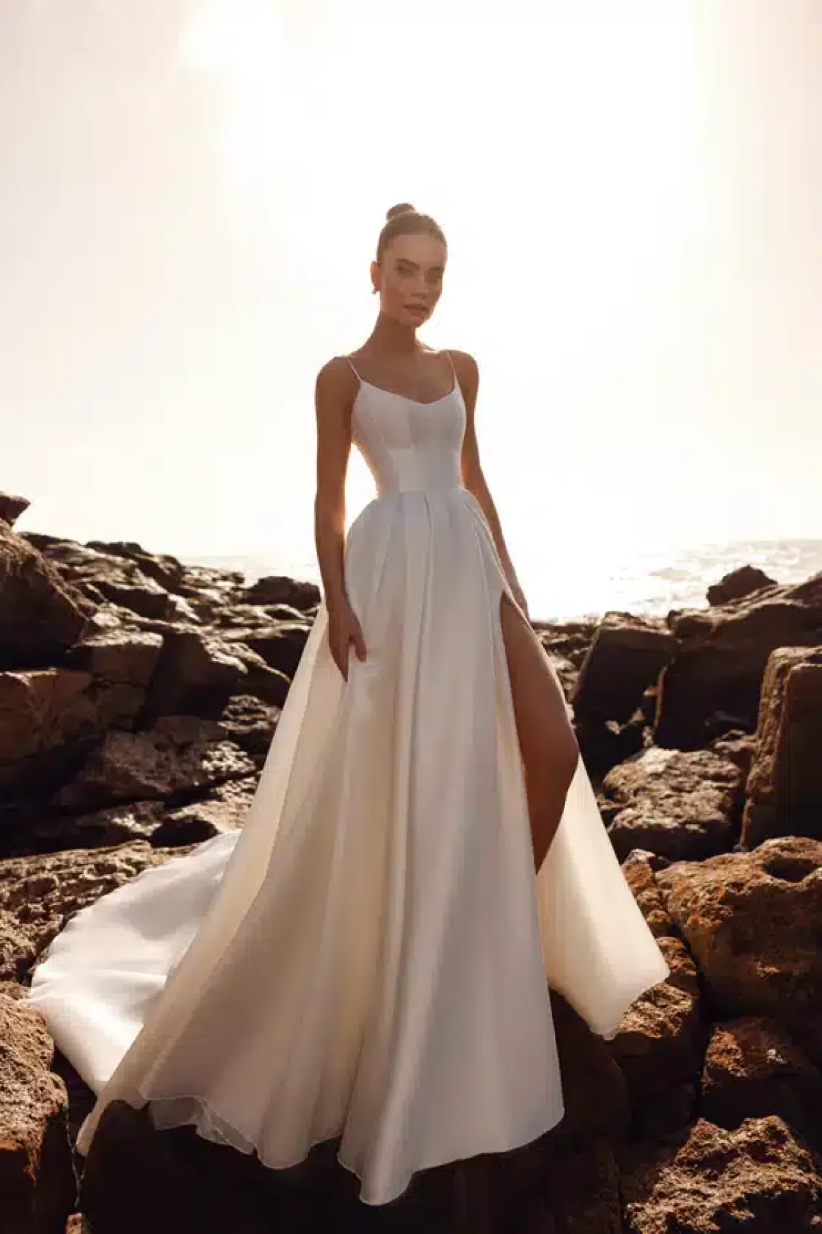 Alya ist ein Kleid für Bräute, die zeitlose Eleganz mit einem modernen Akzent verbinden möchten. Die klare Silhouette betont die Figur, während feine Details für Raffinesse sorgen, ohne den Look zu überladen. Durch die leichte Verarbeitung bietet es ganztägigen Tragekomfort – ideal für klassische Trauungen ebenso wie für stilvolle Feiern.