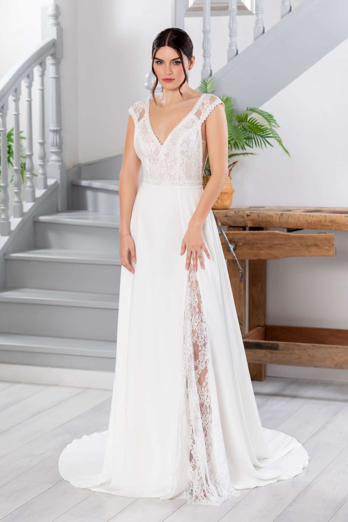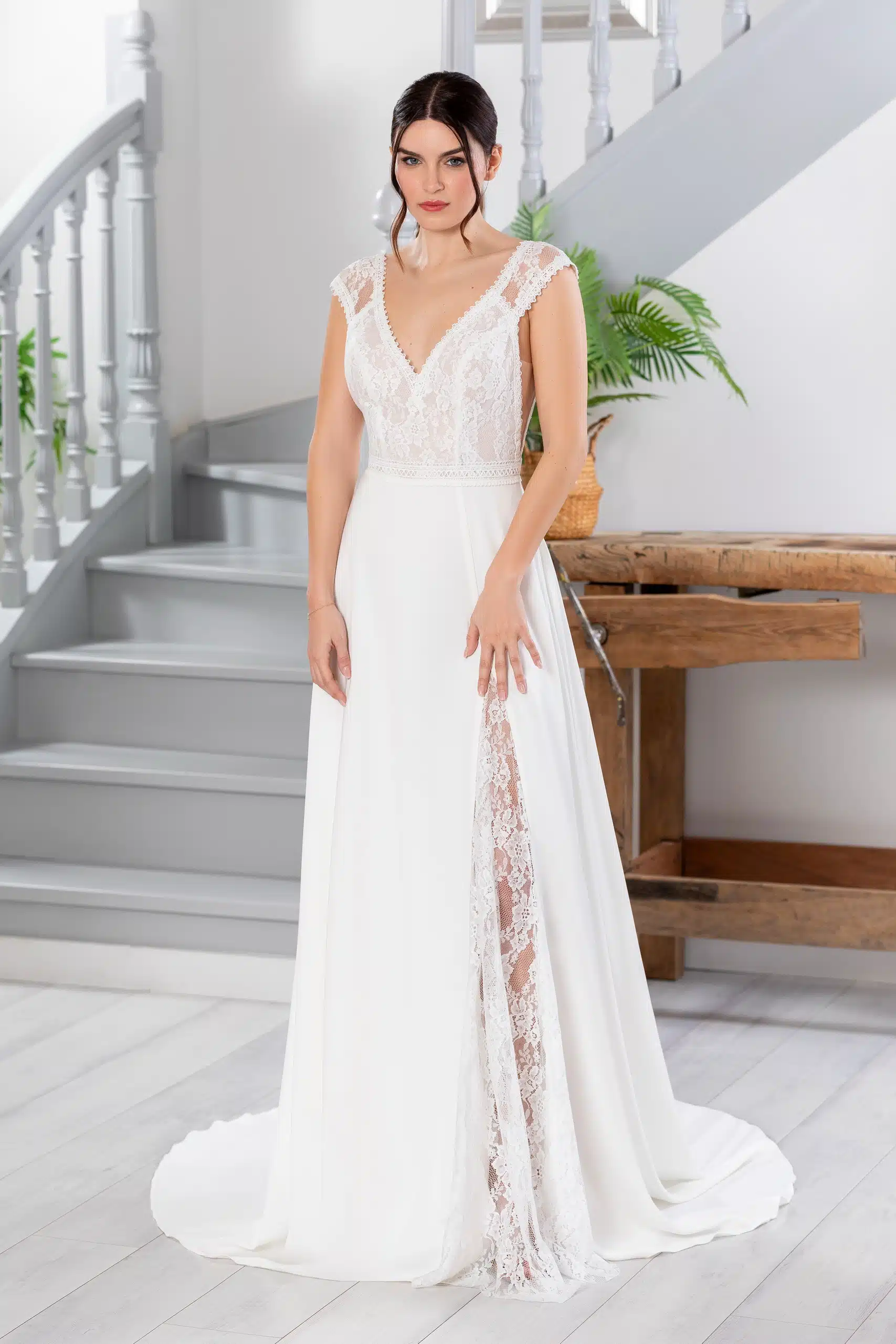 Das zarte Oberteil aus feiner Spitze mit femininem V-Ausschnitt und breiten Trägern schenkt eine romantische Note, während der fließende Crepe-Rock in A-Linie mit hohem Schlitz moderne Raffinesse verleiht. Ein besonderer Blickfang: Unter dem Schlitz blitzt die Spitze erneut hervor – subtil, sinnlich und außergewöhnlich.