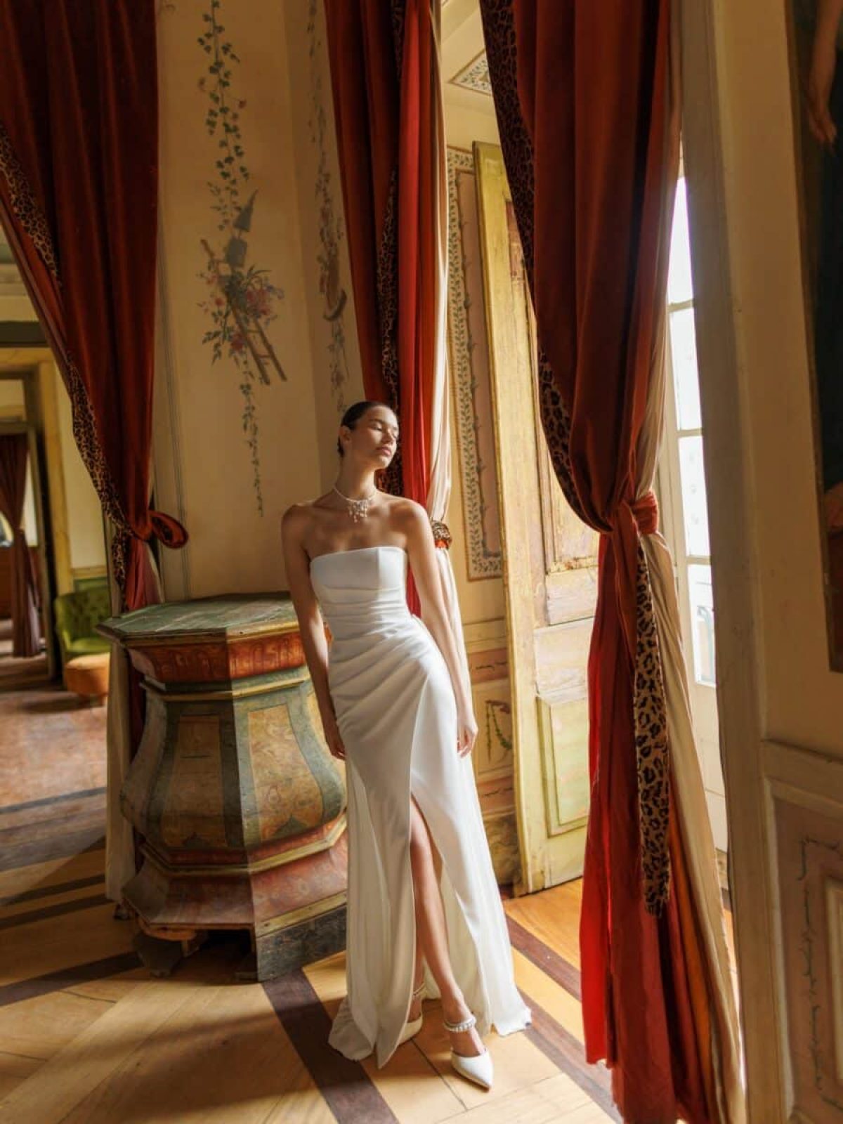 Das Kleid „Anthea” hat eine moderne Meerjungfrauen-Silhouette, die Minimalismus mit einem Hauch verspielter Eleganz zelebriert. Das aus Satin gefertigte Kleid verfügt über einen auffälligen, oberschenkellangen Schlitz und ein drapiertes Korsett mit Reißverschluss am Rücken, das eine statuenhafte, figurbetonte Form schafft. Optional bestellbar ist die abnehmbare Schleppe aus plissiertem Stoff, die dem Gesamtlook eine leichte Bewegung und einen Hauch von Verspieltheit verleiht. Der Überrock wird mit versteckten Schnürbändern unterhalb der Taille befestigt, die für einen sicheren und nahtlosen Sitz sorgen. Sobald er entfernt wird, verwandelt sich das Kleid in ein elegantes, minimalistisches Meisterwerk – zeitlos, auffällig und mühelos schick. Anthea ist perfekt für die Braut, die sich sowohl Drama als auch Schlichtheit in einem unvergesslichen Kleid wünscht.