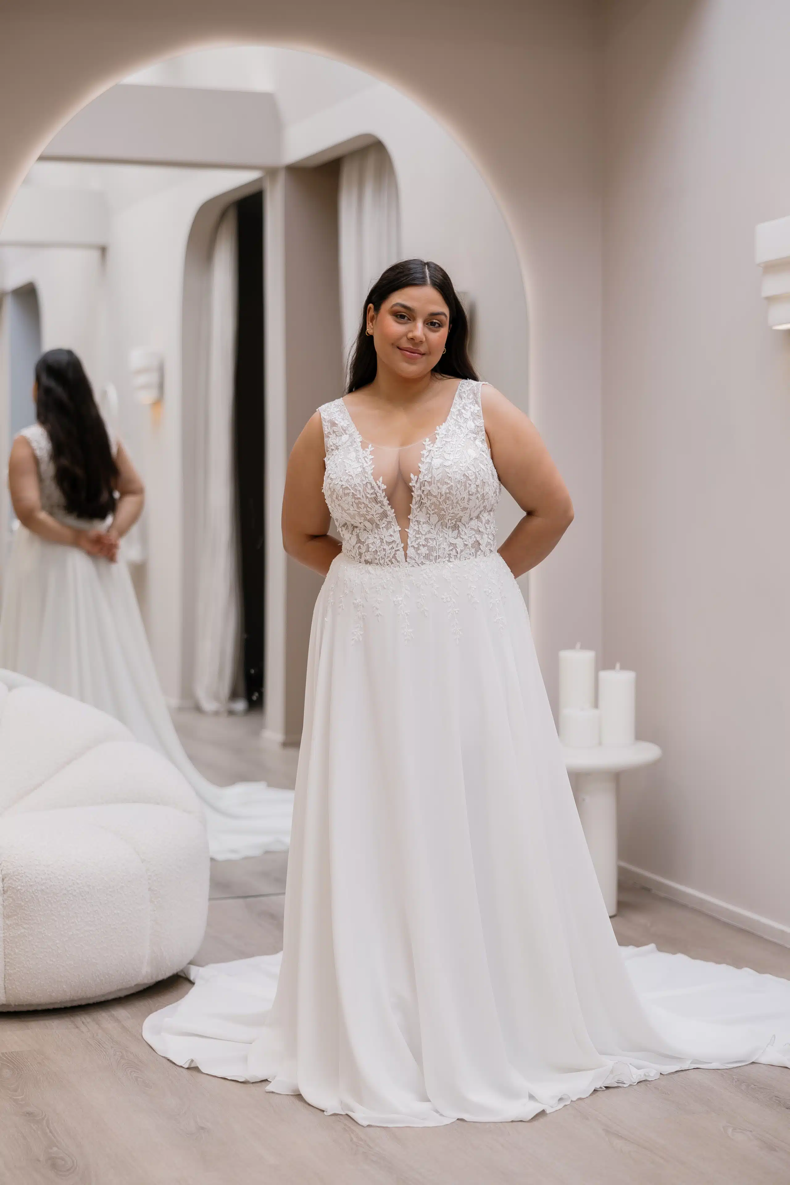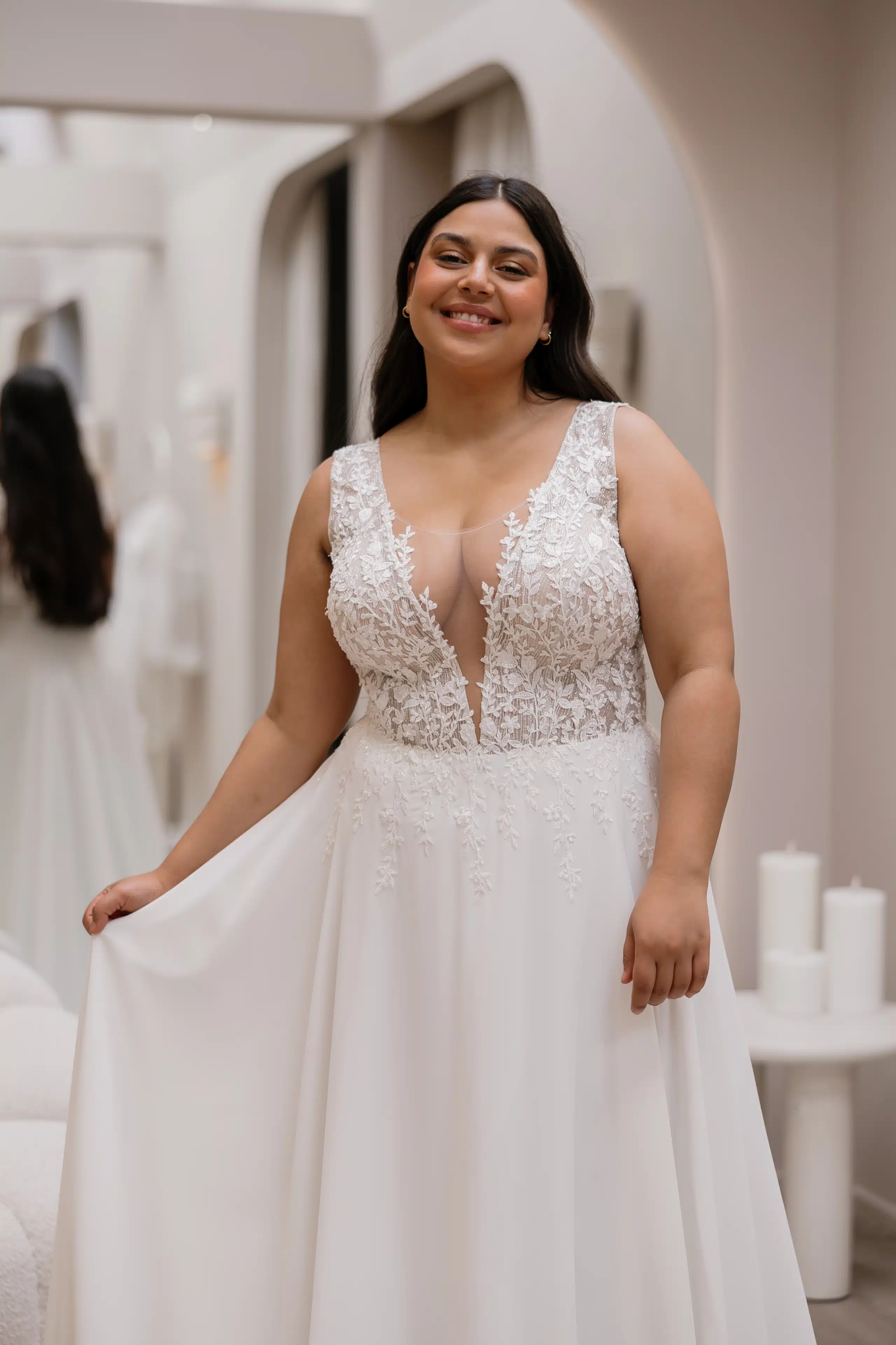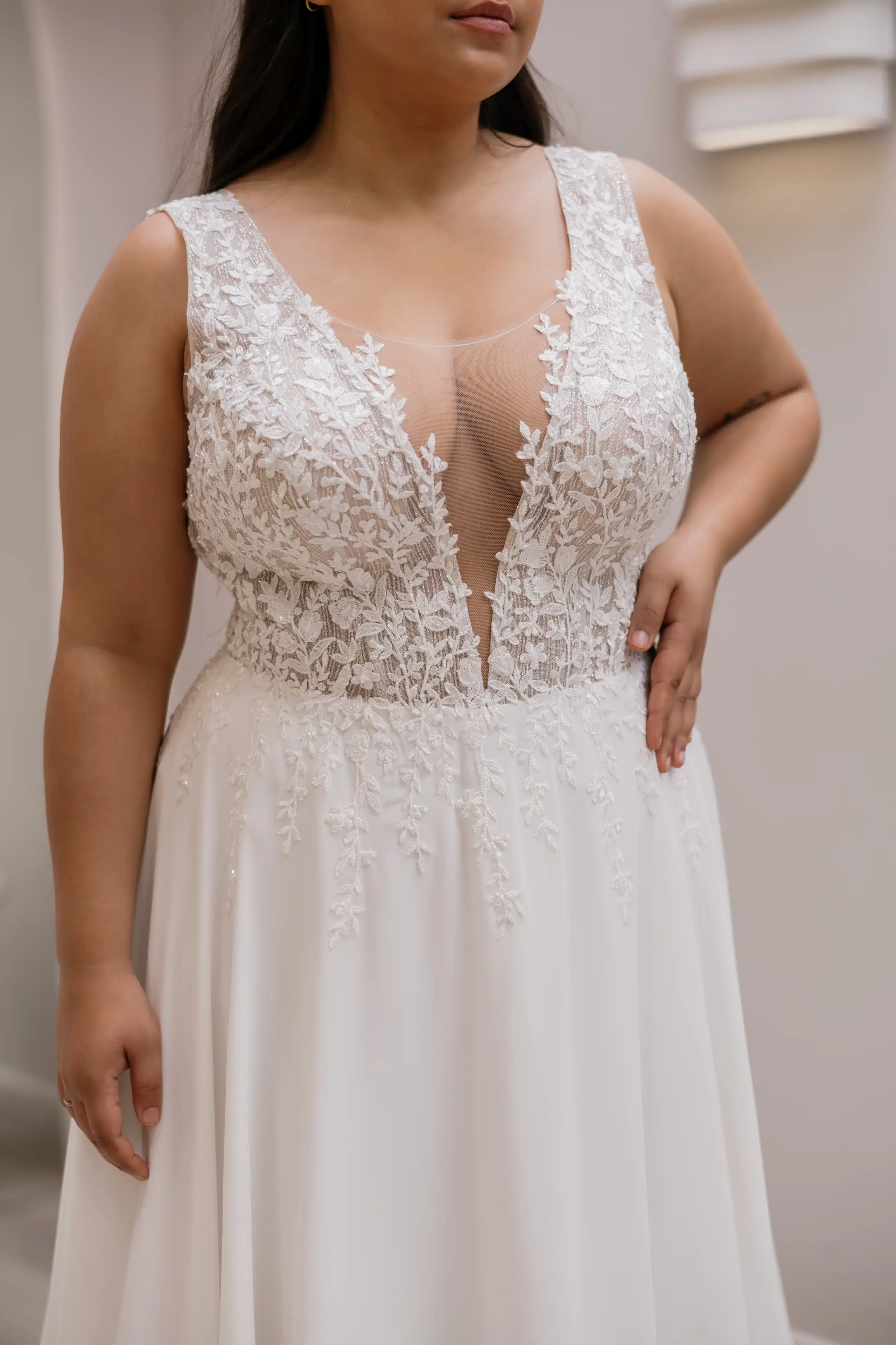 Dieses romantische Brautkleid verführt mit einem tiefen V-Ausschnitt bis zur Taille und einem edlen Oberteil aus zarter Spitze. Der leichte Chiffonrock schwingt bei jedem Schritt mit und sorgt für eine anmutige, feminine Silhouette – perfekt für einen unvergesslichen Auftritt.