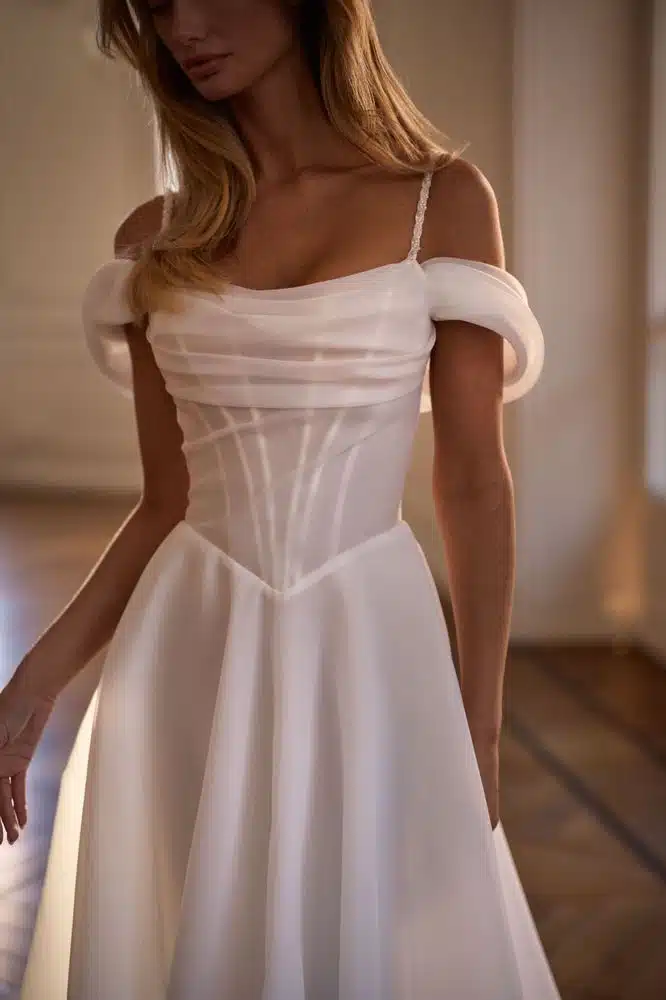 Elegantes Organza-Brautkleid mit Spaghettiträgern und opulentem Rock. Mit tailliertem Korsett-Oberteil mit sichtbaren Stäbchen, verziert mit Drapierungen, geradem Ausschnitt, umrahmt von zarten Spaghettiträgern, abnehmbaren, schulterfreien Organza-Ärmeln und voluminösem Rock mit Midi-Schleppe, die elegant von der Taille aus fällt und für Volumen sorgt.