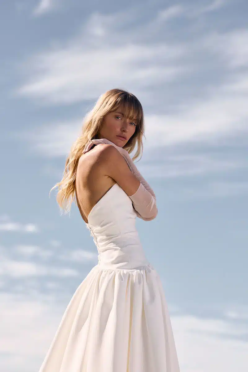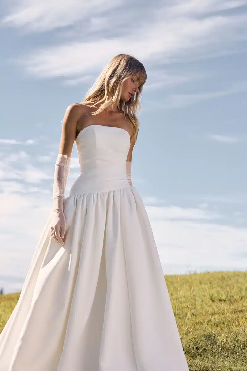 Avery zeichnet sich durch eine skulpturale Silhouette aus, mit einer bewusst asymmetrischen Taille, die durch ein maßgeschneidertes trägerloses Oberteil ergänzt wird. Avery schafft eine Balance zwischen romantischem Minimalismus und ist meisterhaft aus unserem brandneuen matten Duchess-Satin drapiert, der mühelos weich ist und bei jedem Schritt eine leuchtende Bewegung hervorruft.