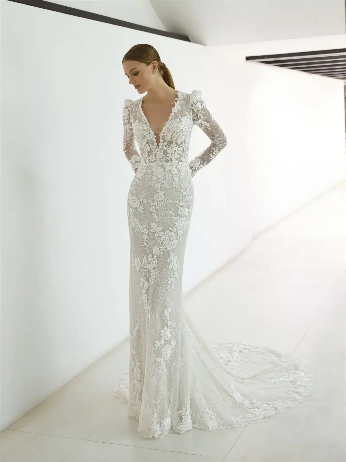 Dieses Kleid im Meerjungfrauenschnitt mit V-Ausschnitt und V-Rücken wird durch leicht gepuffte lange Ärmel ergänzt, die für Bewegung sorgen. Chantilly und Spitze verschmelzen zu einer umhüllenden Silhouette, entworfen für eine Braut, die Raffinesse mit einem romantischen Touch sucht.