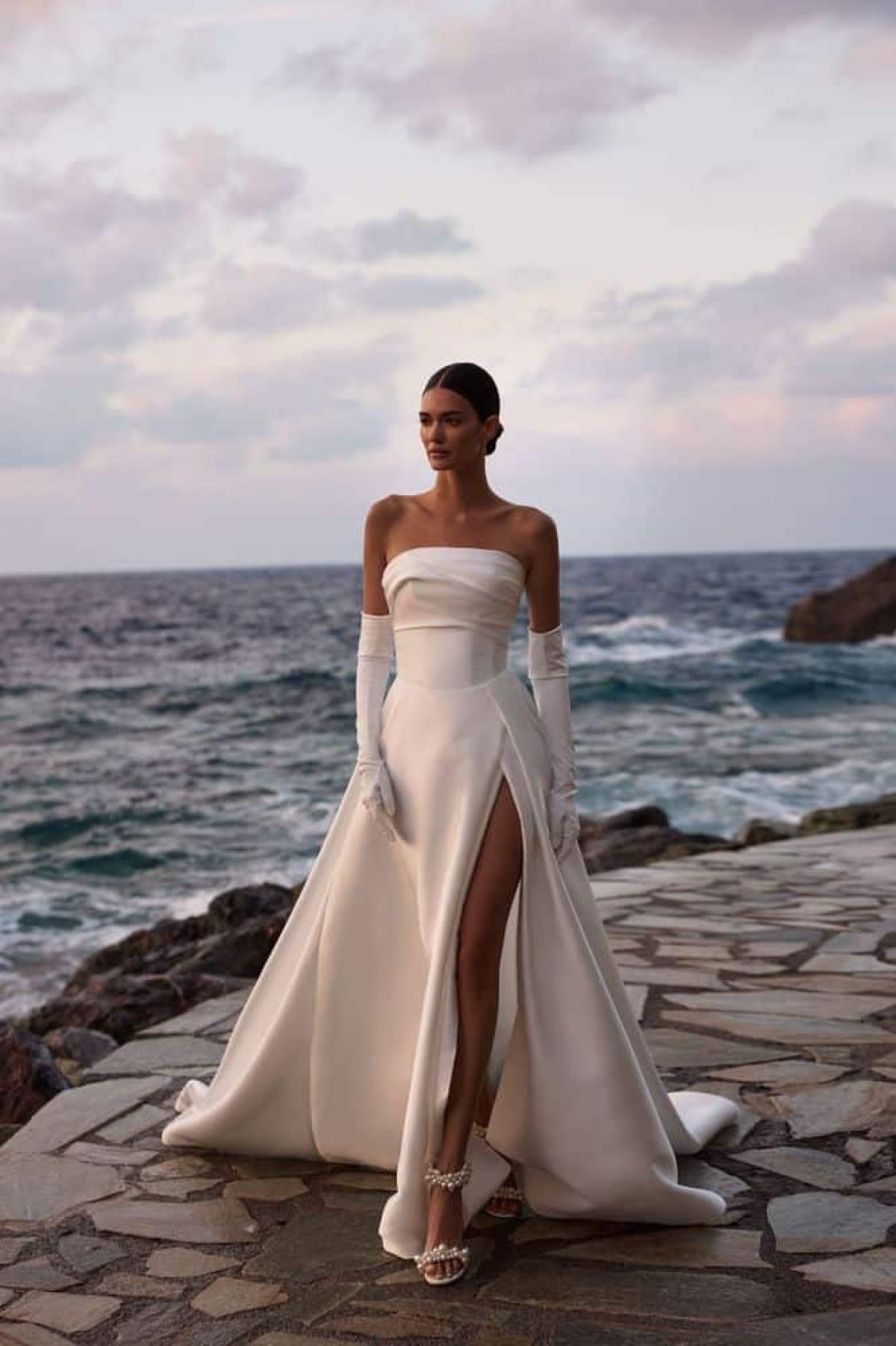 Raffiniertes Hochzeitskleid aus luxuriösem Mikado. Mit einem geraden, zart drapierten Ausschnitt, einem eng anliegenden Korsett, einem eleganten Reißverschluss am geschlossenen Rücken und einem atemberaubenden, bodenlangen Rock in klassischer Prinzessinnen-Silhouette mit einer weichen Schleppe. Vervollständige den Look mit Aveline Opernhandschuhen aus Satin für einen zusätzlichen Hauch von Raffinesse (separat erhältlich).