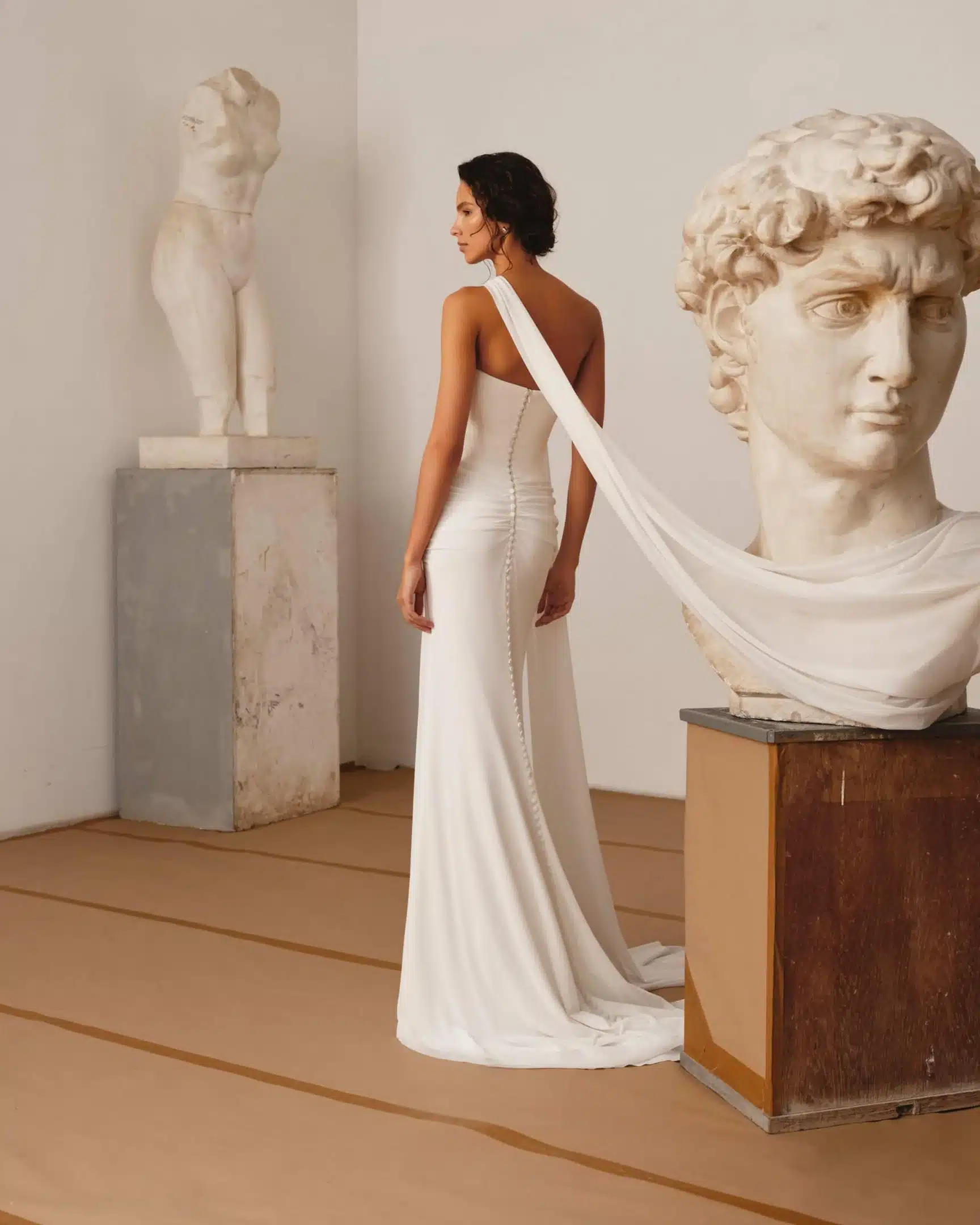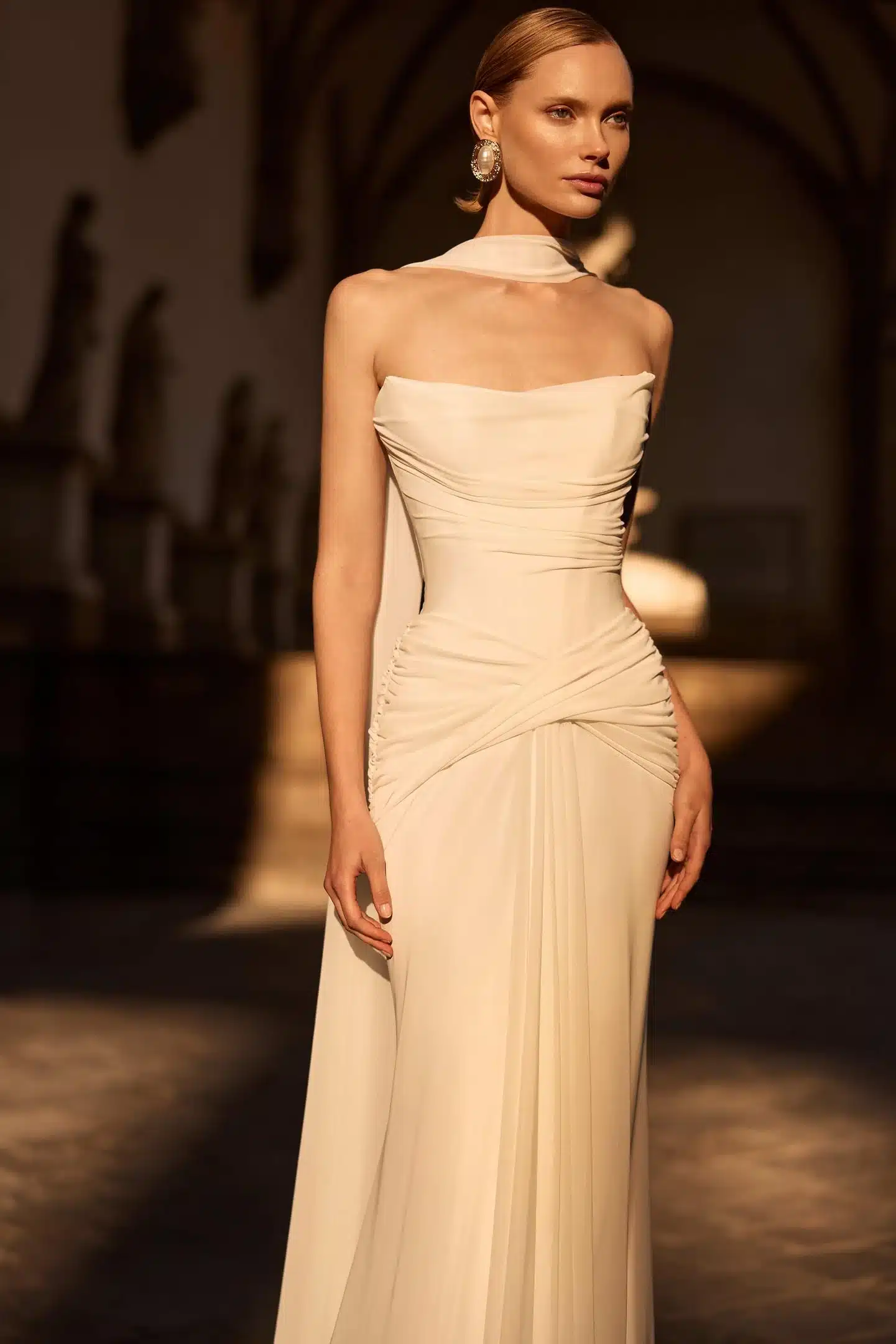 Trägerloses Etuikleid mit raffinierten Falten im Oberteil, tailliertem Schnitt und einer Reihe dekorativer Knöpfe am Rücken. Der Stoff knittert nicht und verheddert sich nicht, betont die Hüften wunderschön und schmeichelt der Taille. Im Lieferumfang enthalten sind abnehmbare schulterfreie Ärmel und Träger für ein müheloses Styling. Kombiniere das Kleid mit dem Chiffon-Halstuch „Caladriel“, um dem Look eine leichte, romantische Note zu verleihen.