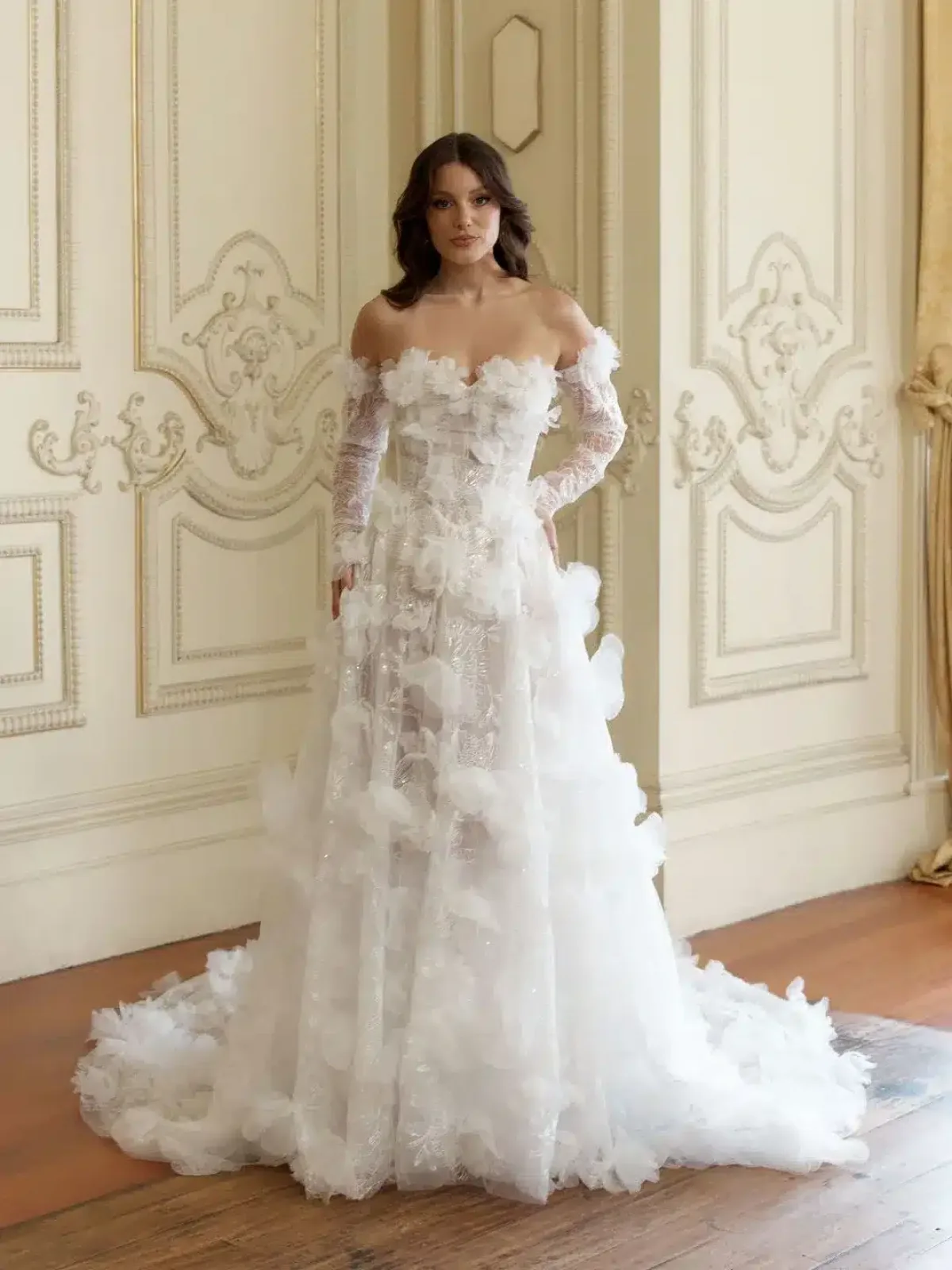 Von der Büste bis zur Schleppe besteht das Kleid aus 3D-bestickter Spitze und luftigem Organza. Der Schwerpunkt liegt auf der Leichtigkeit, die das Kleid optisch weich und verführerisch erscheinen lässt. Die dreidimensionalen Motive beginnen am herzförmigen Ausschnitt, ziehen sich über die gesamte Länge des Kleides und sorgen für dramatische Romantik. Der Stoff ist hauchdünn, um den mehrschichtigen, dreidimensionalen Look zu unterstreichen, aber es kann ein Futter gewählt werden. Das Mieder endet in einer spitz zulaufenden Baskentaille und wird durch einen klassischen, verführerischen Rücken mit Schnürung vervollständigt, der die Figur umschmeichelt. Careli kann trägerlos als modernes Statement-Kleid getragen werden oder mit passenden Illusions-Spitzenärmeln für einen ultra-femininen Off-Shoulder-Stil kombiniert werden. So ist ein vielseitiges Styling für jeden Brauttyp möglich.