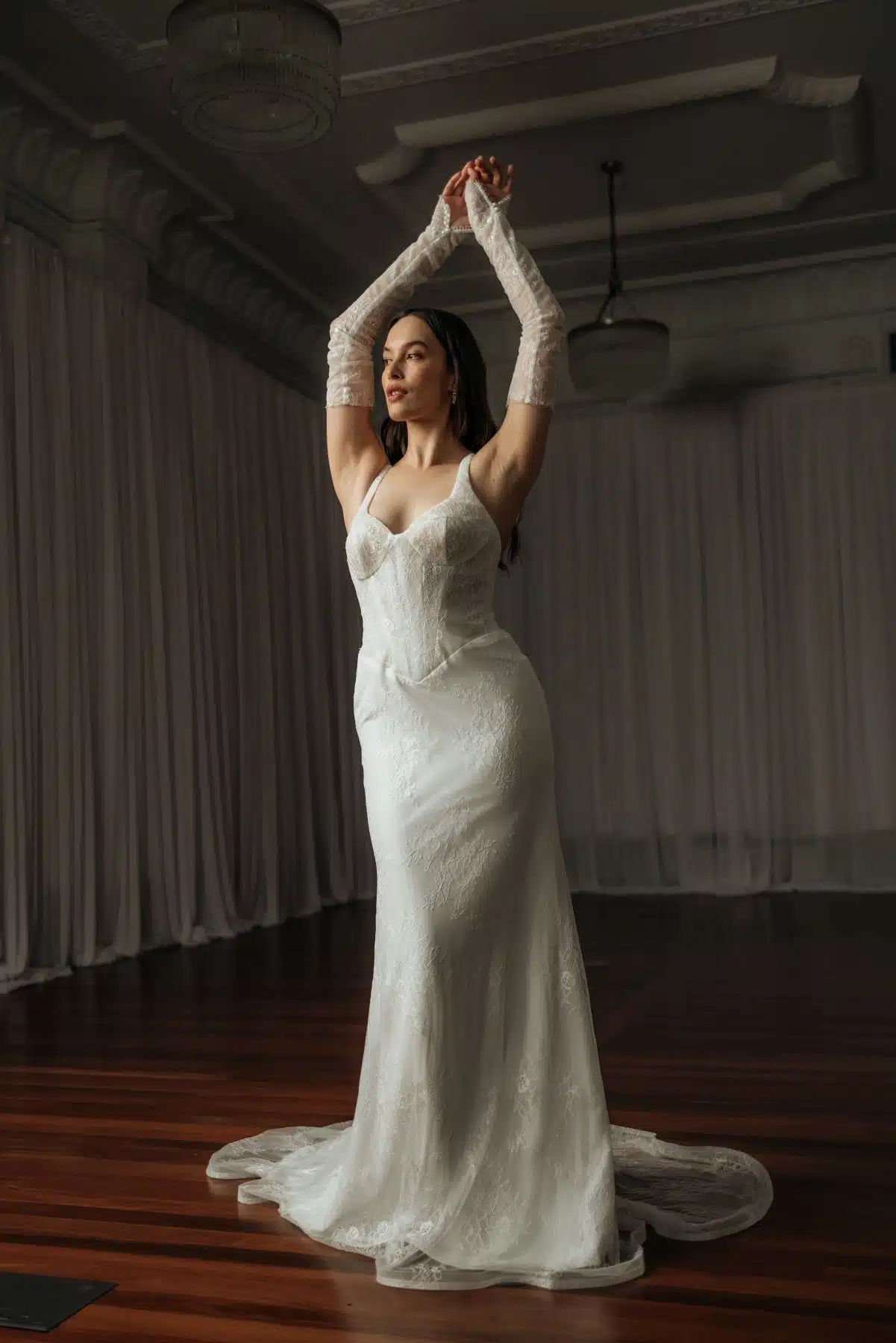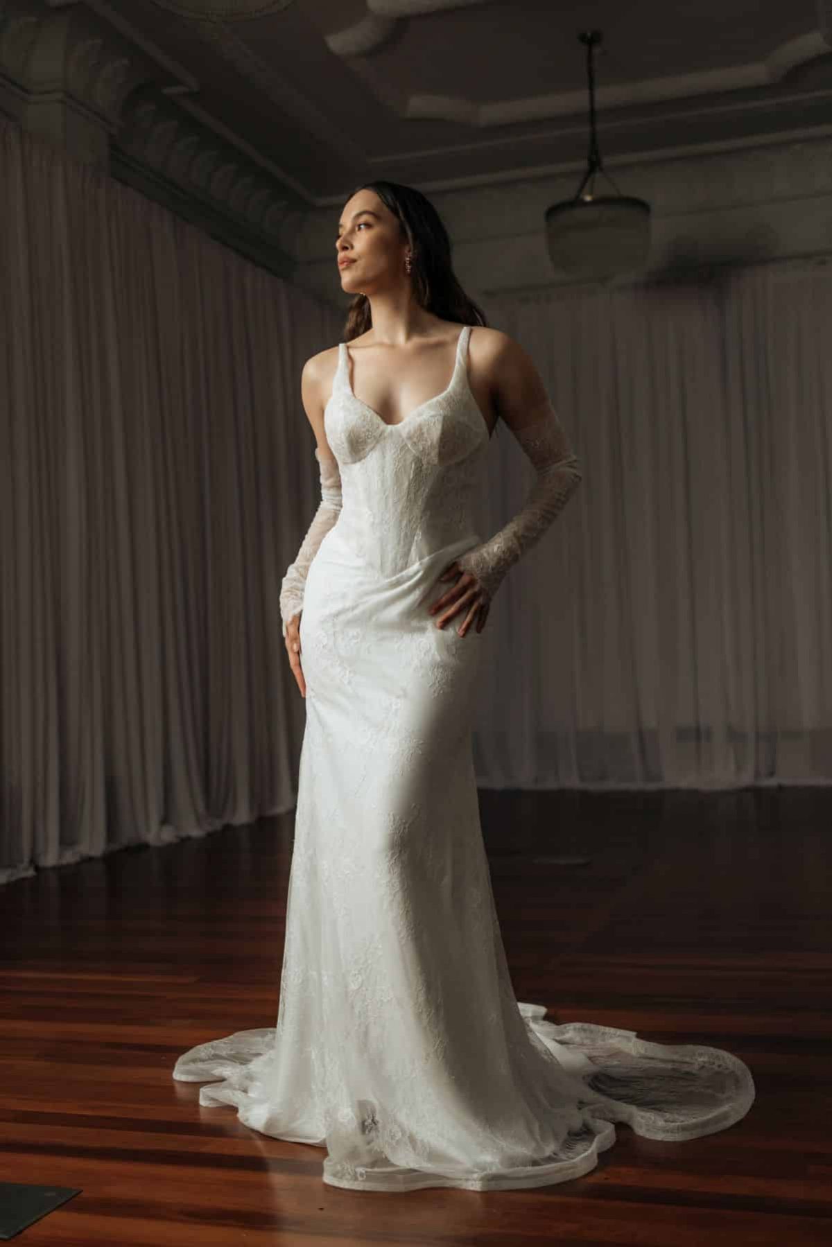 Cavalli aus französischer Chantilly-Spitze ist wie eine frische Sommerbrise. Der zarte Stoff ist über freiliegenden Stäbchen halbtransparent, während dünne Träger für Halt und ein klassisches Dekolleté sorgen. Eine Baskettentaille verleiht einen Hauch von Märchen, bevor der leichte Rock in eine hübsche Schleppe fällt.
