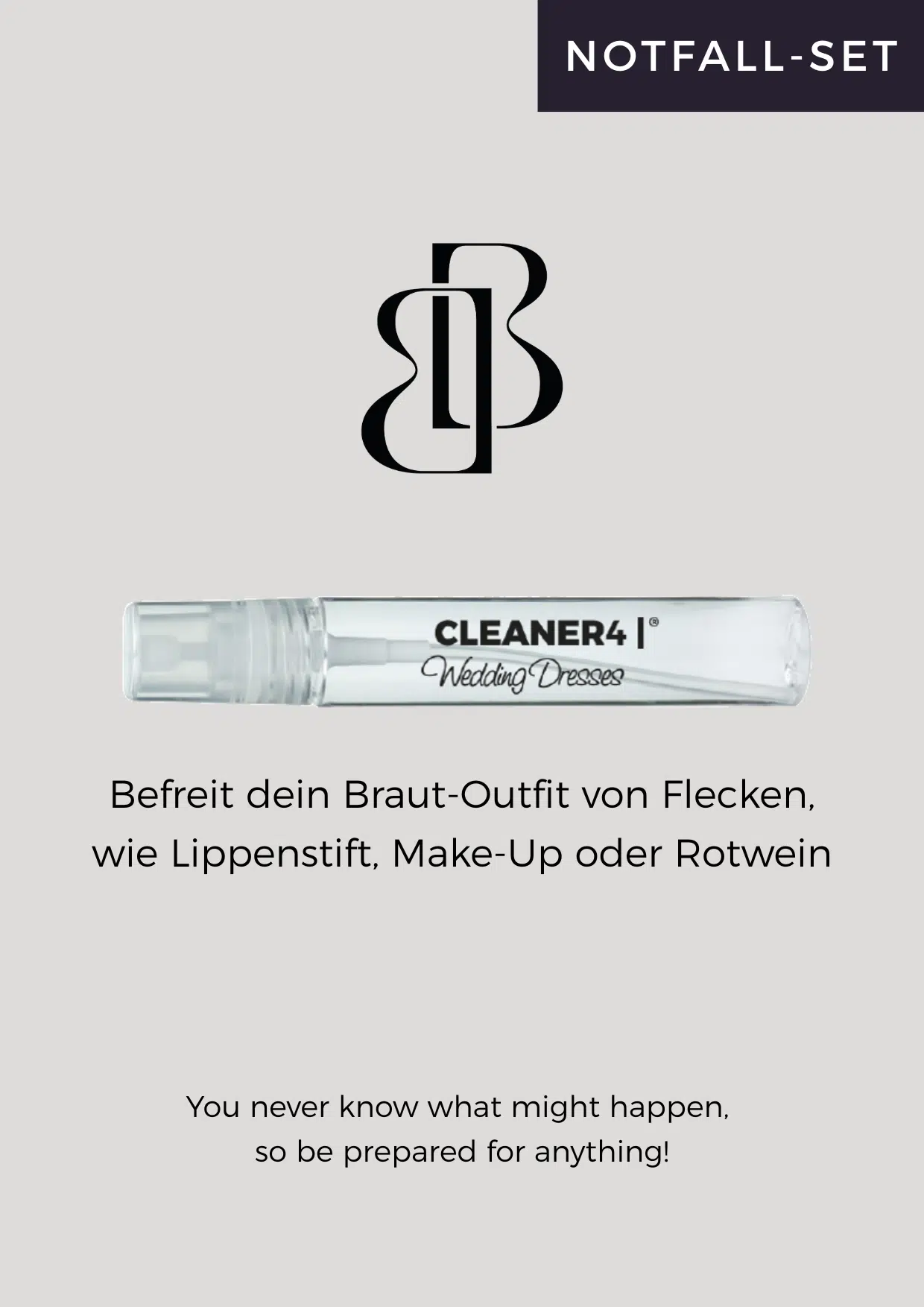 Mit dem CLEANER SET bist du immer für den Notfall vorbereitet. Dieser entfernt effektiv Flecken wie Make-up, Rotwein, Schokolade, Tomatensoße, Grasflecken, Schneiderkreide, Blut usw. in Sekundenschnelle und schont dabei das Material. Es eignet sich für empfindliche Stoffe wie Seide und farbige Stoffe und kann grundsätzlich auf allen Braut- und Abendkleidern verwendet werden.