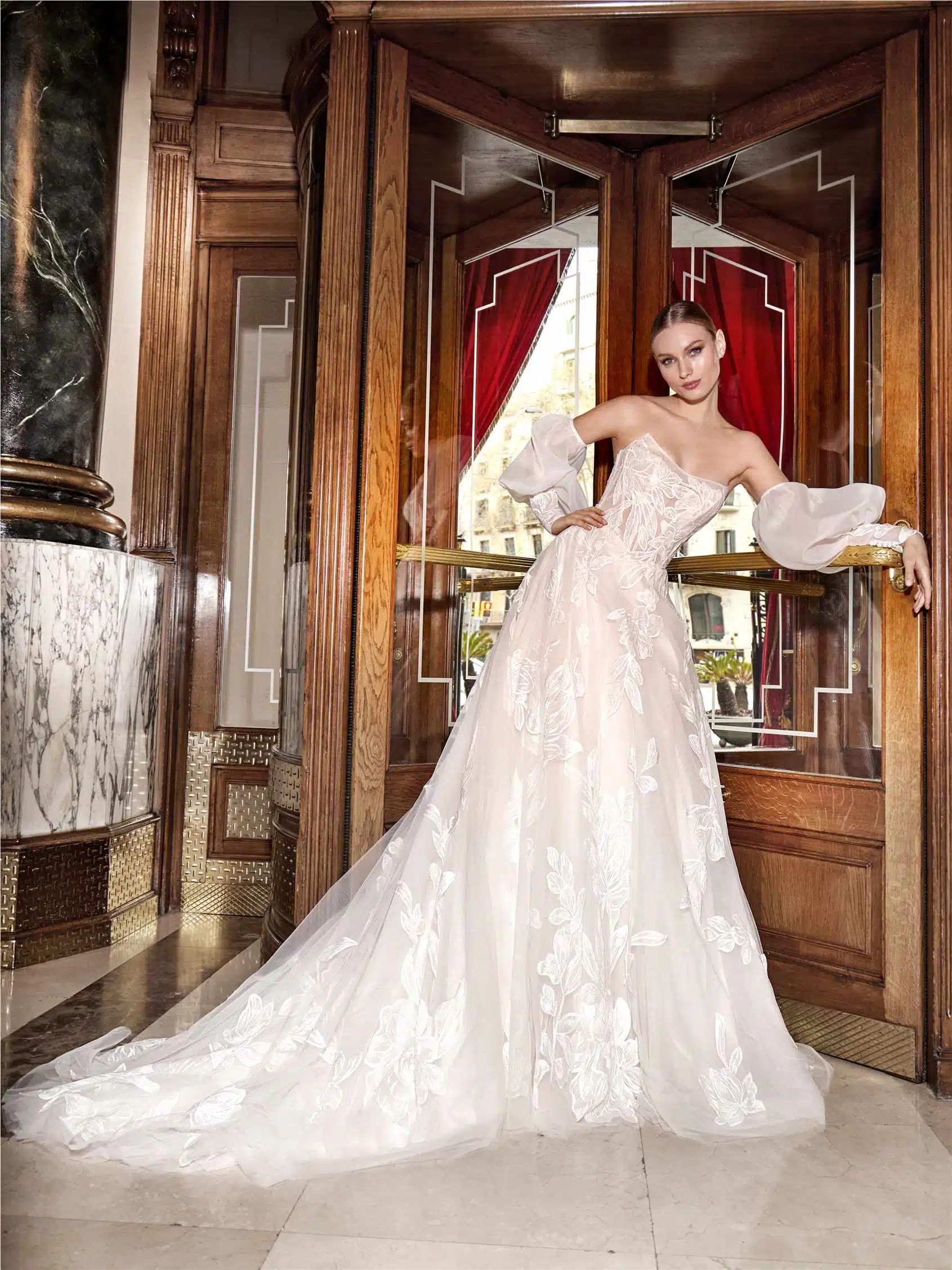 Zarter Tüll, veredelt mit großen floralen Spitzenmotiven, verleiht dem Look eine feminine Leichtigkeit. Gepuffte Ärmel setzen ein modisches Statement und bringen Dramatik ins Gesamtbild, während das trägerlose Dekolleté die Silhouette elegant ausbalanciert. Ein Kleid für Bräute, die Charakter und Stil ausstrahlen möchten.
