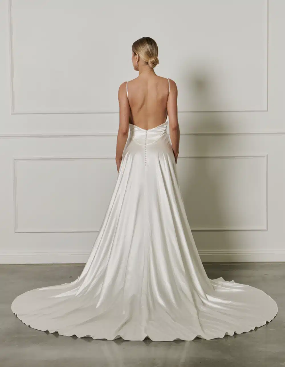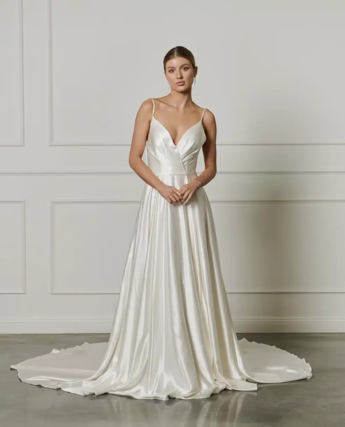 Ein atemberaubendes, A-Linienförmiges Brautkleid mit femininem V-Ausschnitt und wunderschönem Beinschlitz.