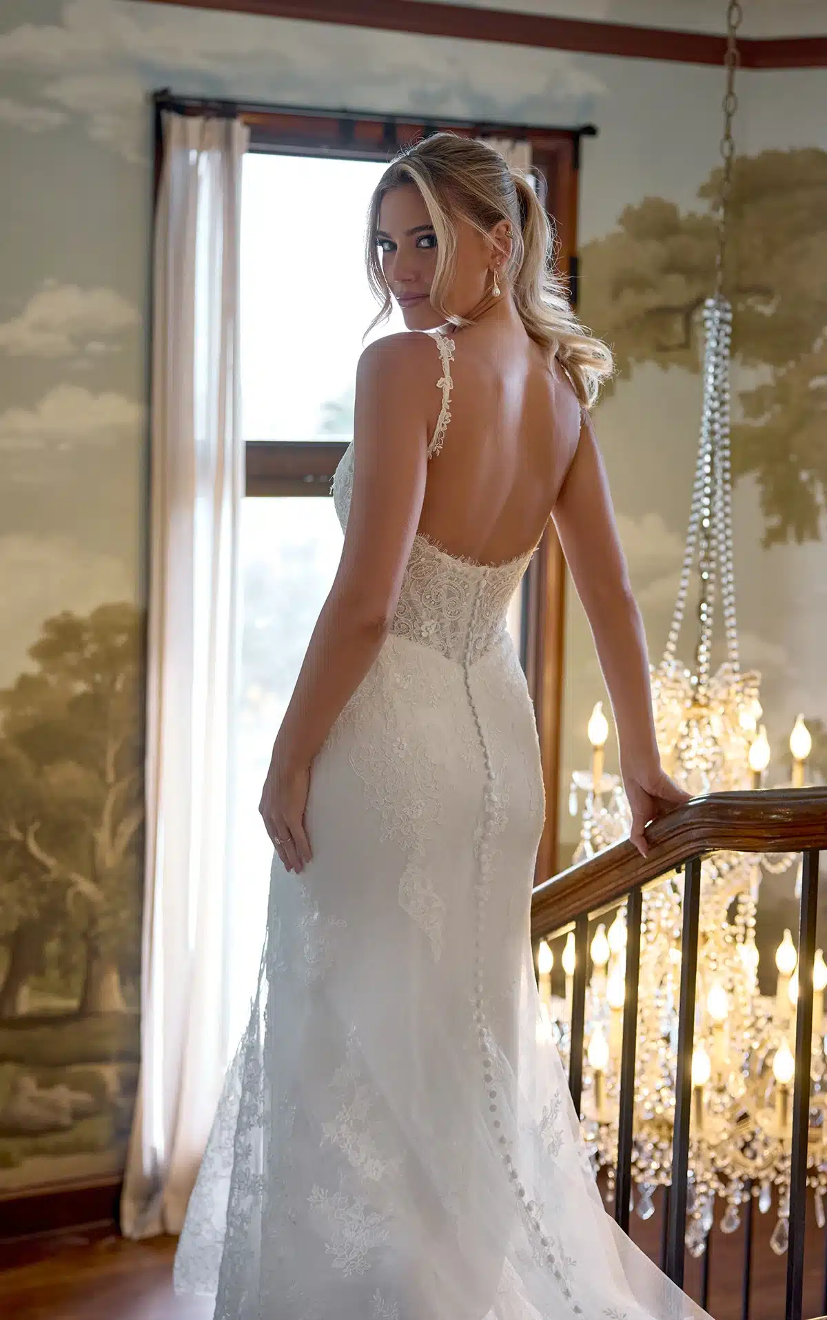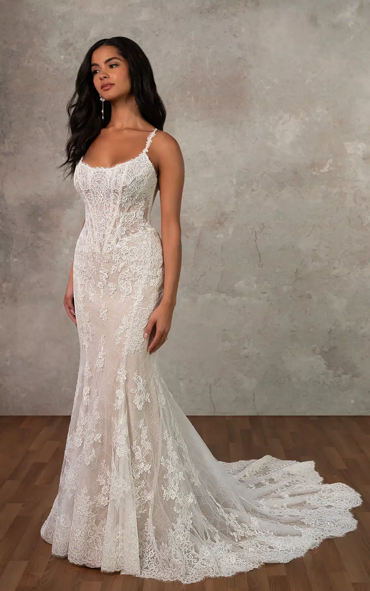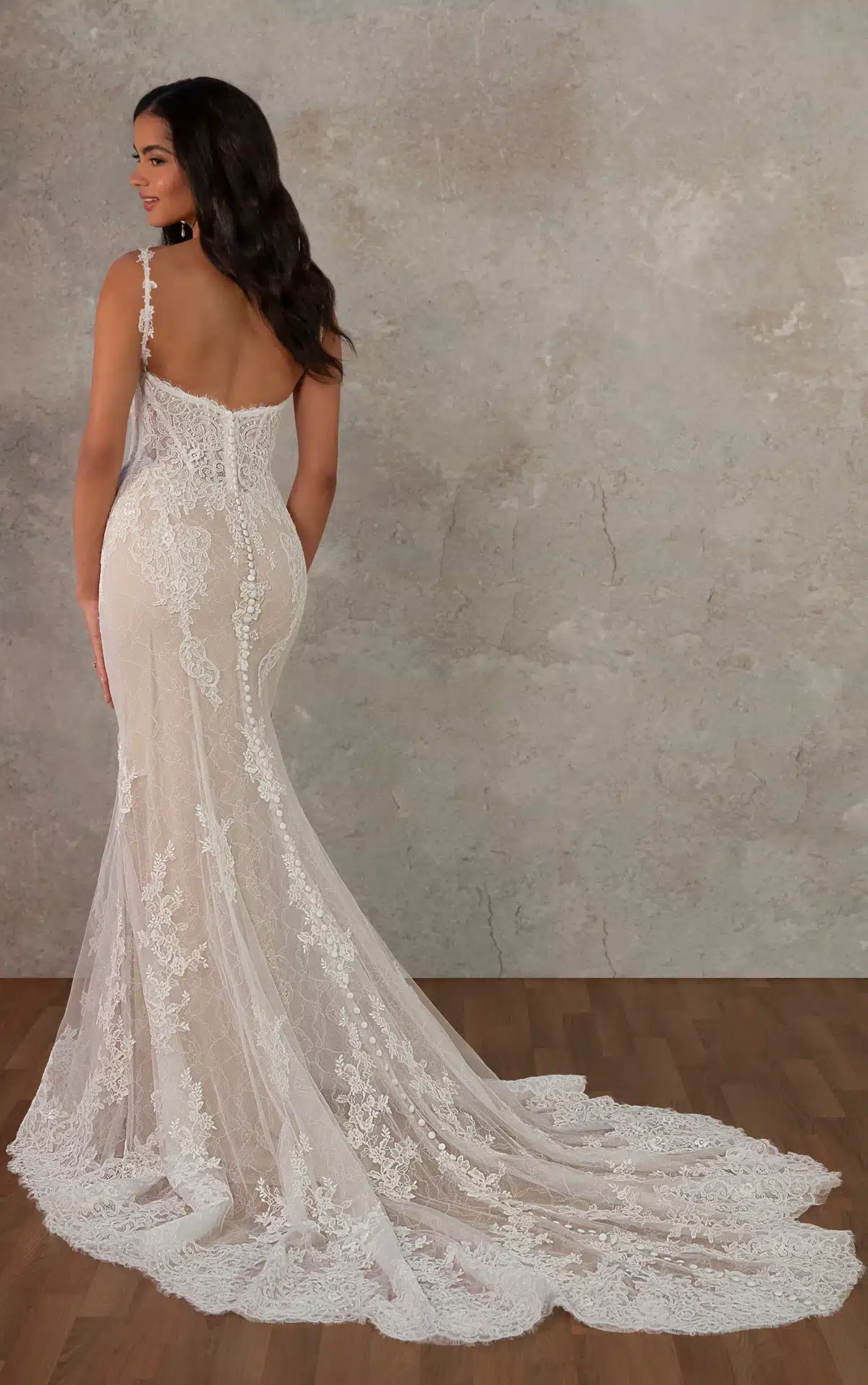 Das Modell D4437 ist eine romantische Hommage an die Eleganz vergangener Zeiten und vereint Vintage-inspirierte Details mit einer raffinierten Silhouette. Gefertigt aus Spitze und Tüll, zeigt dieses Fit-and-Flare-Brautkleid einen leichten Rundhalsausschnitt mit spitzenförmigen Trägern sowie ein strukturiertes Oberteil mit eingearbeiteten Korsettstäbchen für eine dezente Definition. Eine zarte Chantilly-Spitze bildet die Basis unter matten floralen Spitzenapplikationen und verleiht dem Design zusätzliche Textur. Die Baskentaille streckt optisch die Figur und erinnert an ein klassisches Design. Abgerundet wird der Look durch eine wellenförmige Schleppe aus Spitze, die dem Kleid ein dramatisches und zugleich anmutiges Finish verleiht. Dieses Kleid ist für Bräute, die zeitlose Handwerkskunst und Schönheit schätzen.