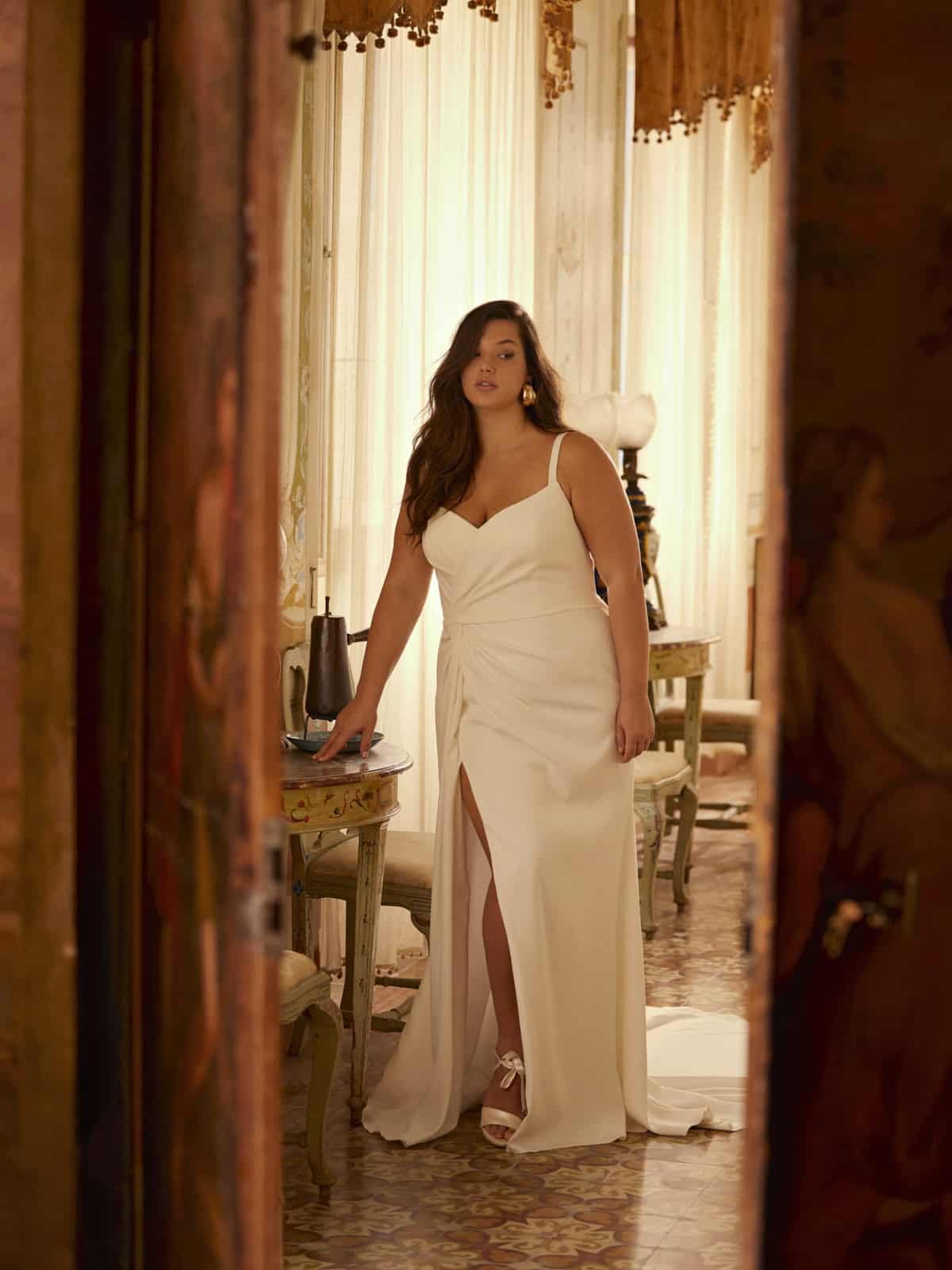 Betone deine atemberaubenden Kurven in diesem taillierten Brautkleid. Doan-C ist aus Crepe mit einem weichen Sweetheart-Ausschnitt für einen romantischen Touch. Die Schlichtheit der Silhouette wird durch klare Linien und einen hohen Schlitz betont. Die abnehmbaren, schulterfreien Ärmel sorgen für zusätzliche Vielseitigkeit und bieten die Möglichkeit, deinen Look individuell zu gestalten.