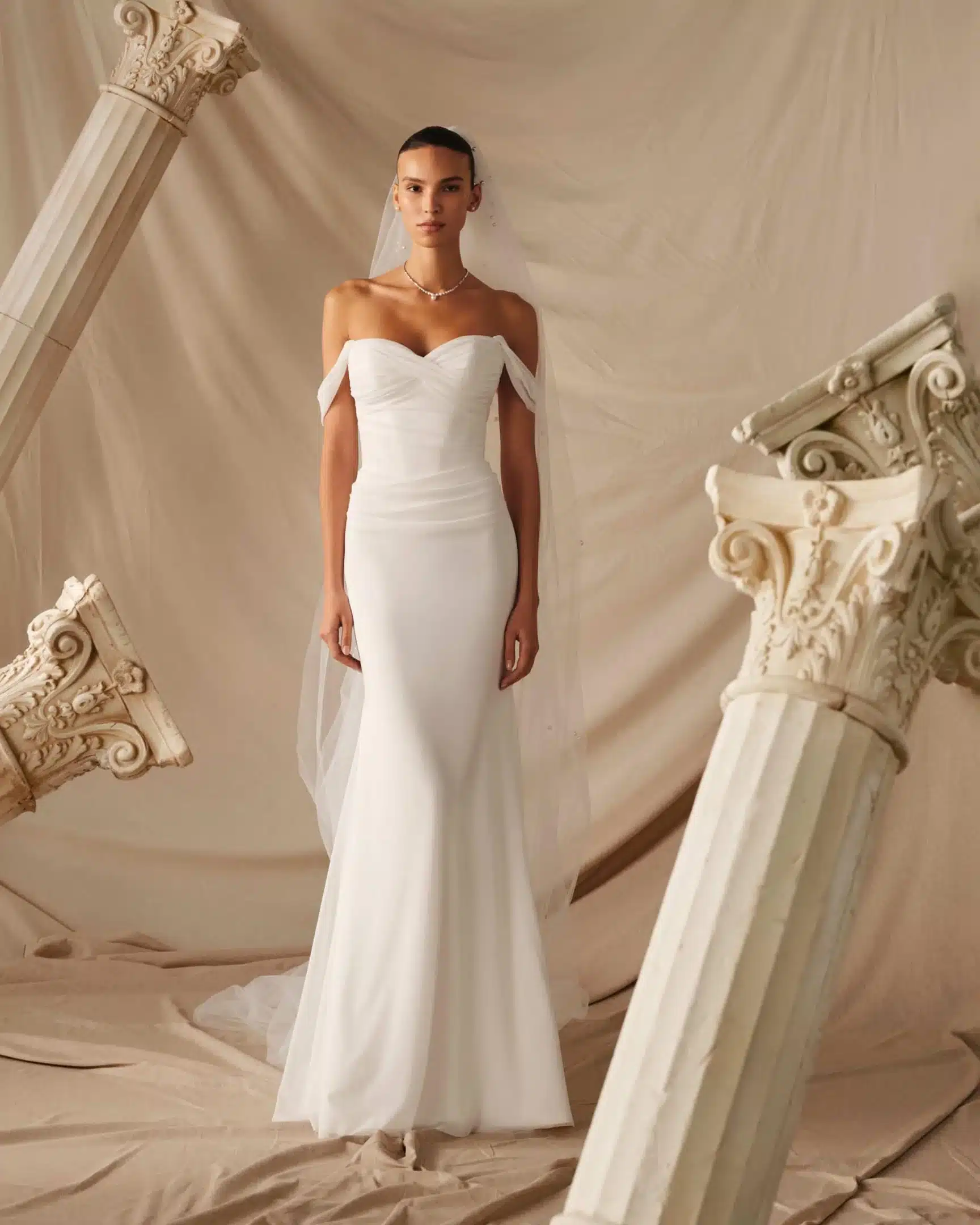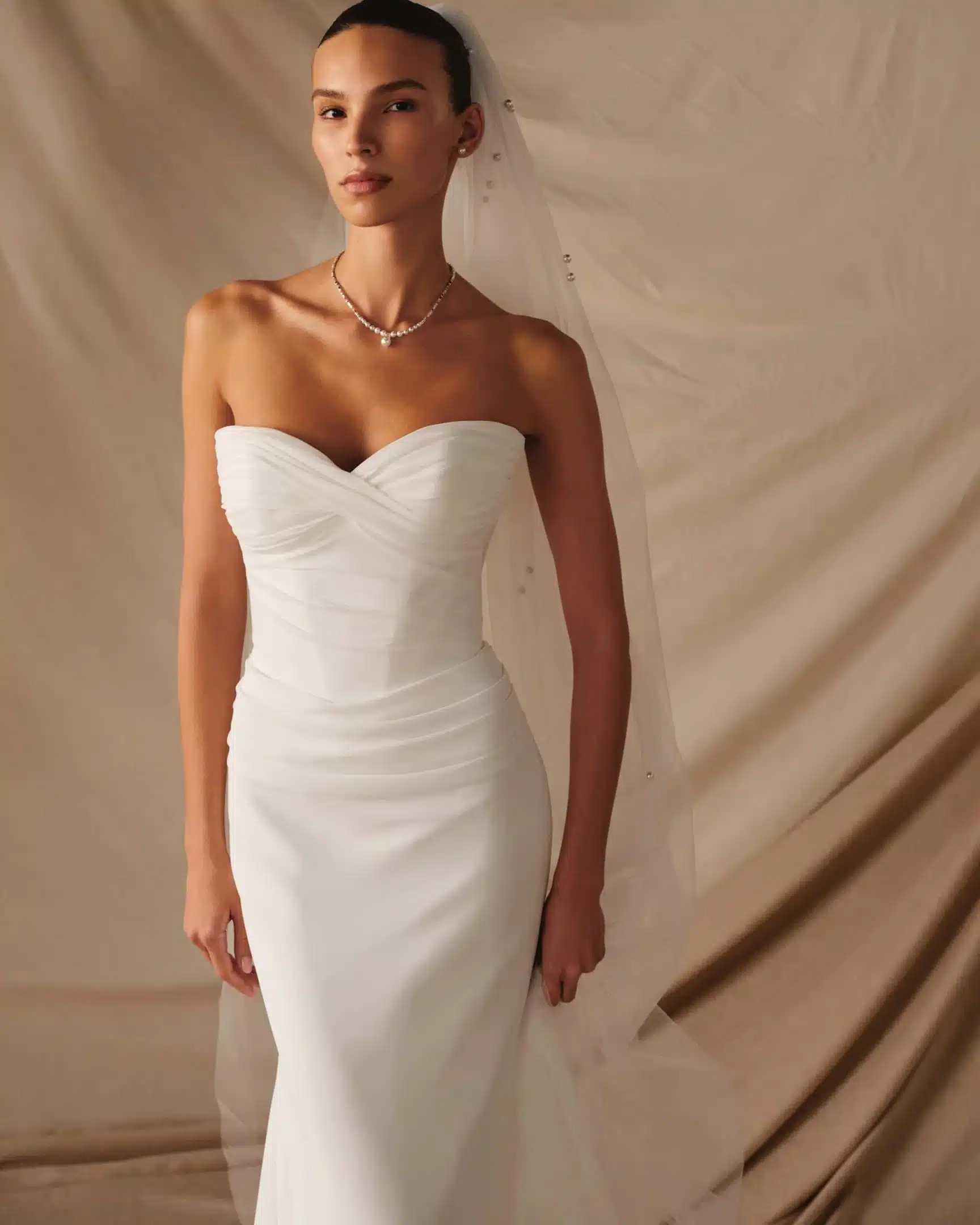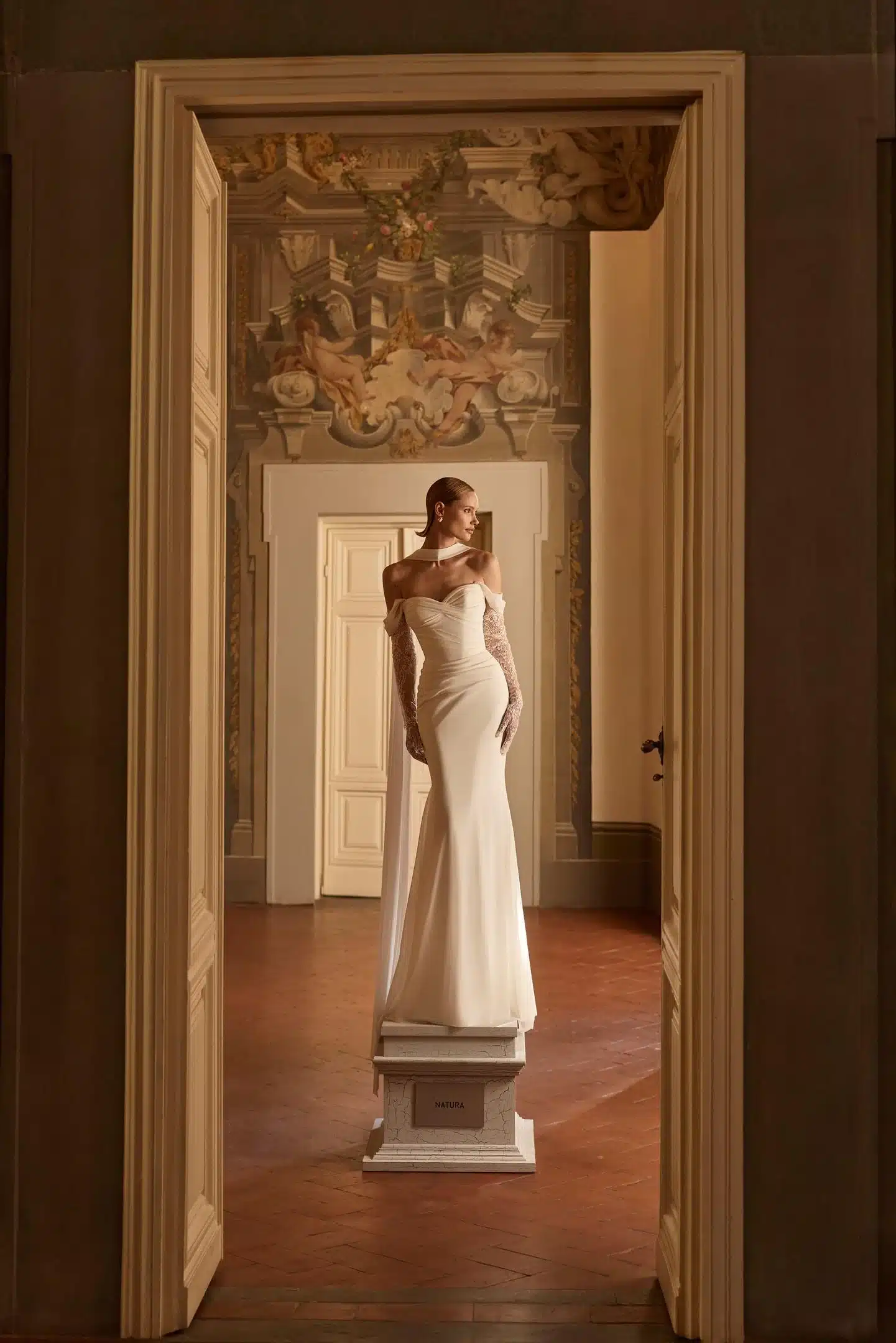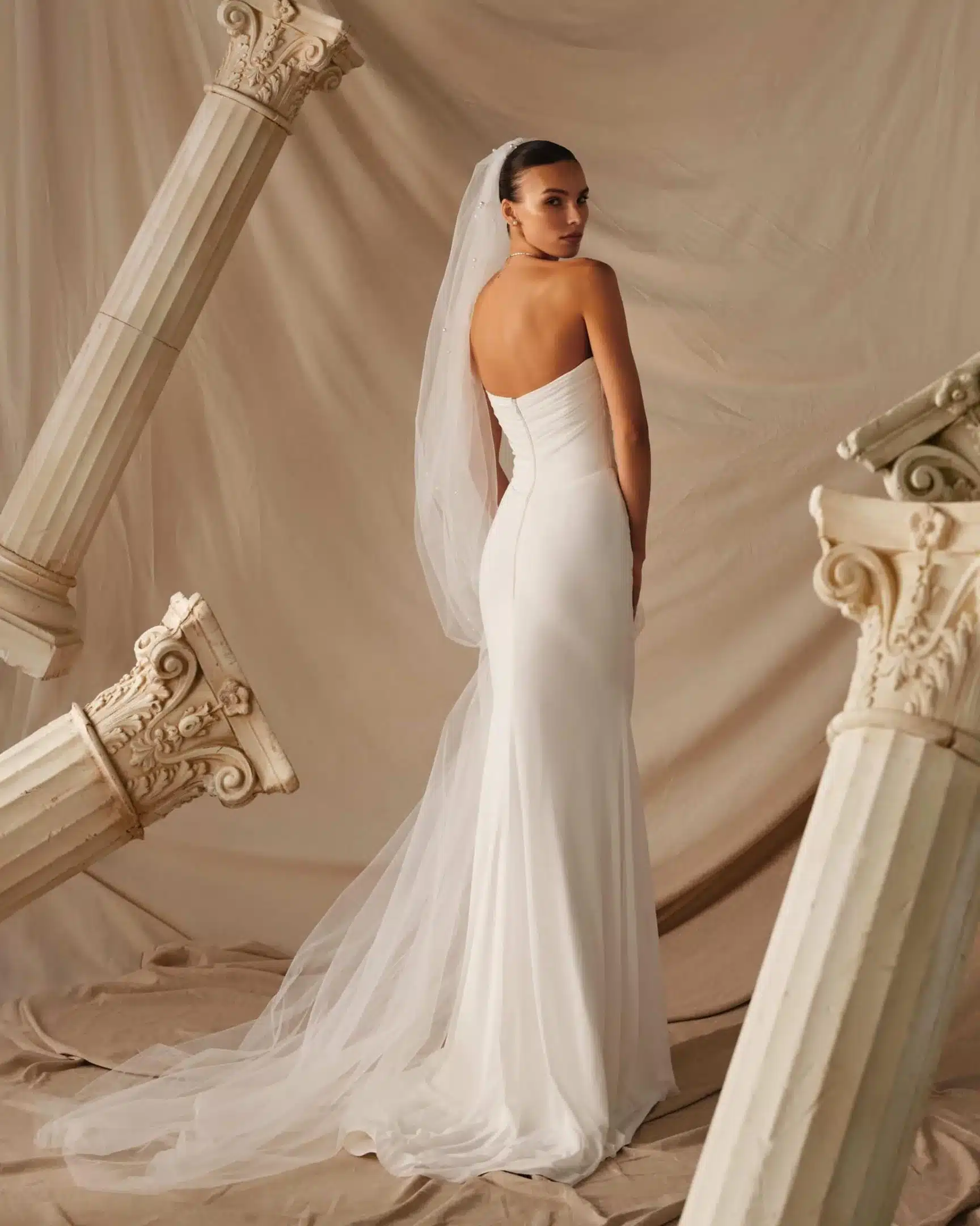 Ein figurbetontes Meerjungfrauenkleid aus Tüll mit drapiertem Oberteil und abnehmbaren schulterfreien Trägern, mit denen du deinen Look variieren kannst. Die taillierte Form geht in einen weichen, fließenden Rock über und sorgt so für einen eleganten und zugleich romantischen Look. Vervollständige den Look mit dem Cape „Brave“, dem Schleier „Liluera“, dem Schal „Caladriel“ und den Handschuhen „Odyssia“ – Spitzenakzente, die den minimalistischen Stil mit Romantik aufwerten.