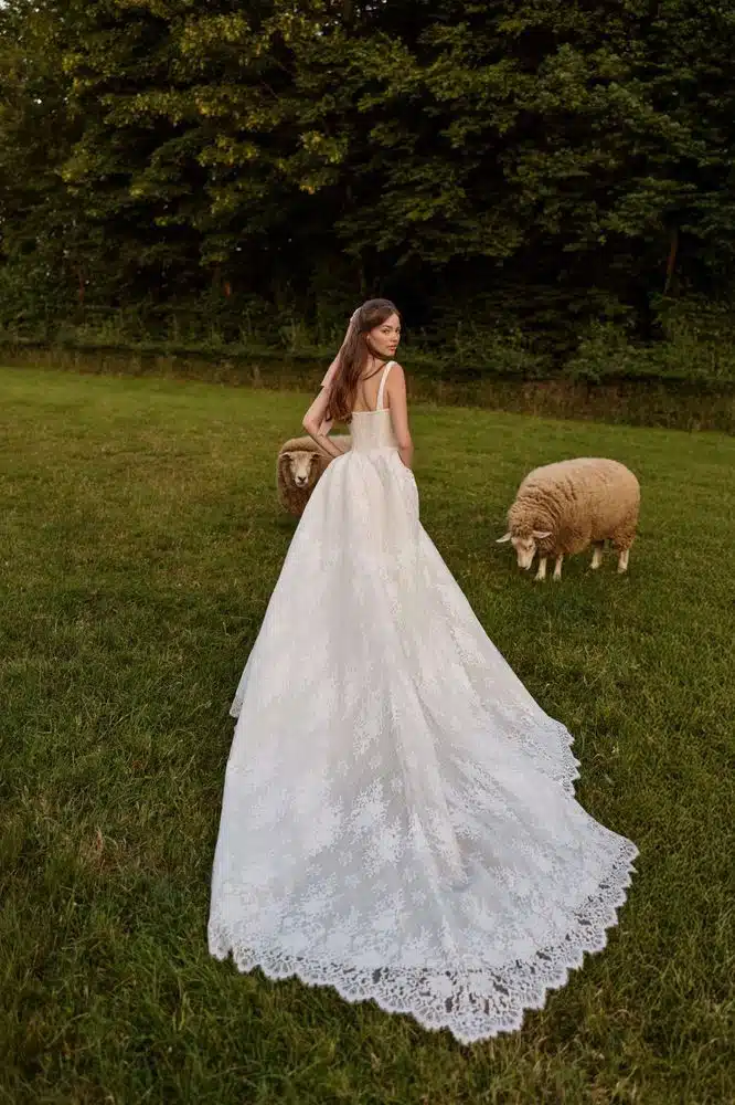 Ein A-Linien-Brautkleid, das von Trägern aus zarter Chantilly-Spitze eingerahmt wird. Es besticht durch ein strukturiertes Korsettoberteil mit tief sitzender Taille, das die Taille betont, sowie einen weiten Rock mit einer gewellten Maxi-Schleppe. Die Ärmel aus floraler Chantilly-Spitze sorgen für einen nahtlosen Übergang von der Trauung zum Empfang. Runde den Look mit dem passenden Elisora-Tüllschleier ab, um ein wunderschönes Gesamtbild zu schaffen.