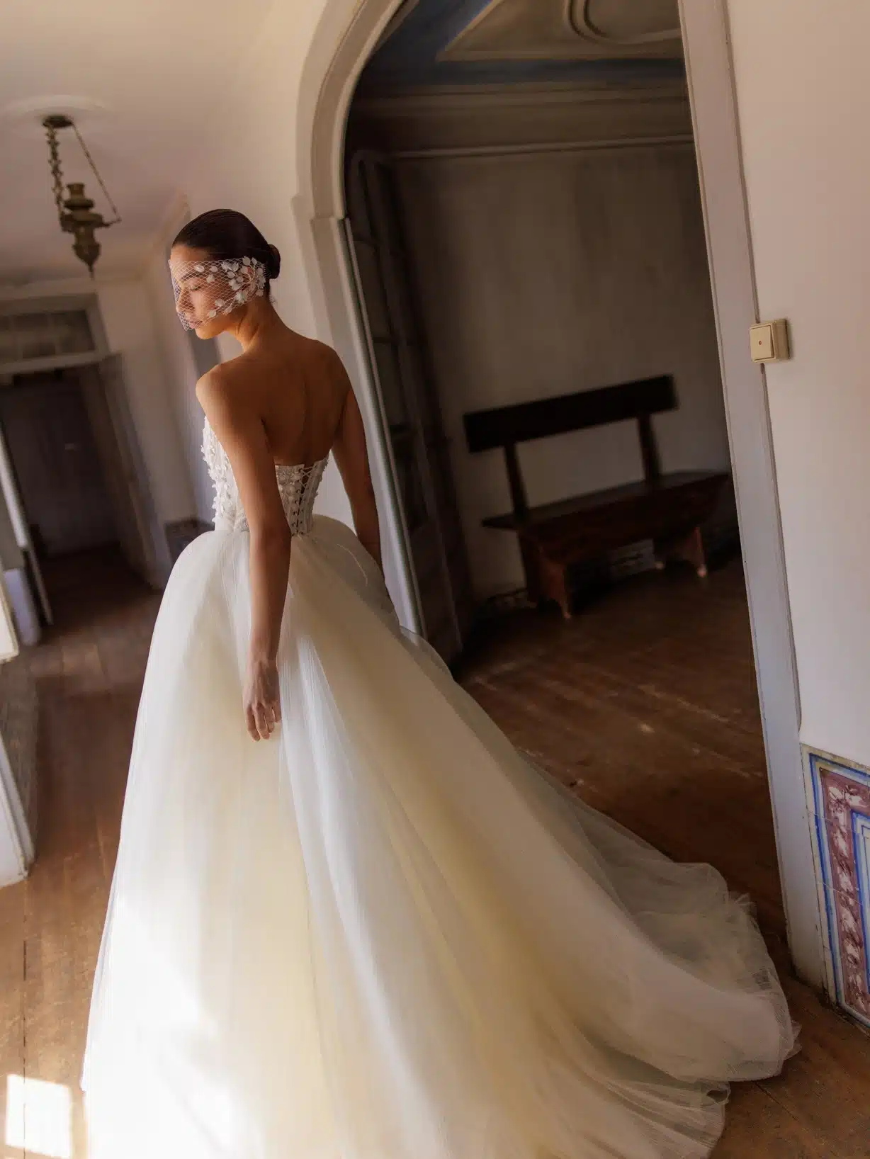 Schwanenähnliches Ballkleid mit tailliertem Korsettoberteil, verziert mit leichter Blumenstickerei. Das voluminöse Kleid besteht aus mehreren Lagen durchscheinendem Netzstoff – ein zentrales Element des ausdrucksstarken Designs – ergänzt durch eine abnehmbare Netzmaske mit zarten Blumenapplikationen an den Seiten.