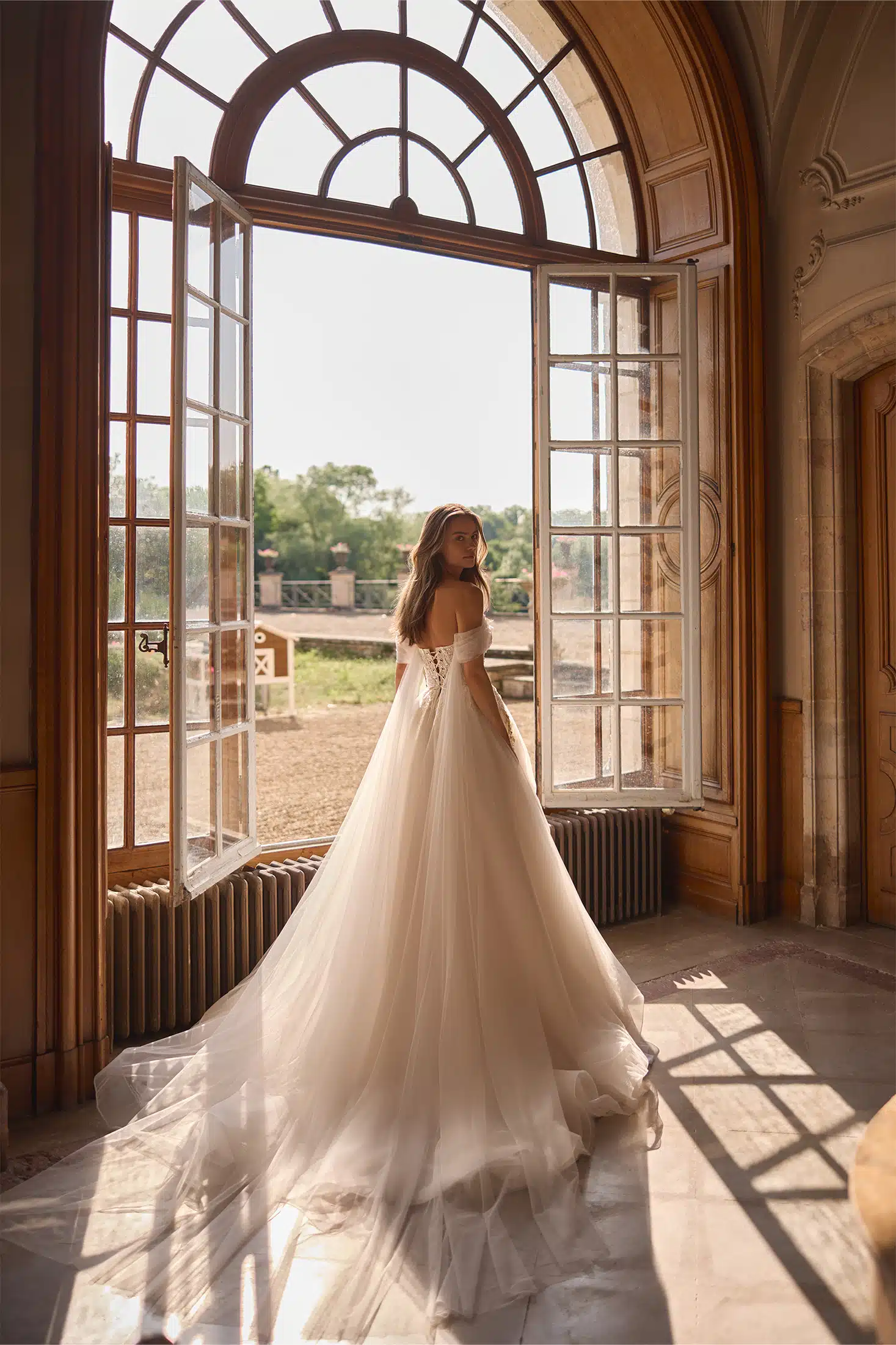 Dieses Brautkleid in ausgestellter A-Linie vereint Moderne und Eleganz. Zarte Spitze im Oberteil fließt sanft in den Tüllrock und schafft einen harmonischen Look. Der leicht gewellte Ausschnitt in Kombination mit den Off-Shoulder-Ärmeln verleiht einen sinnlichen Akzent.