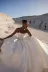 Prinzessinnen-Kleid mit auffälligen Details. Die voluminöse Schleife, die die Schulterlinie formt und Volumen im oberen Teil des Kleides schafft, wird durch ein einfaches, festes Korsett und einen gesteckten, bauschigen Rock ausgeglichen, der frei bis zum Boden abfällt.