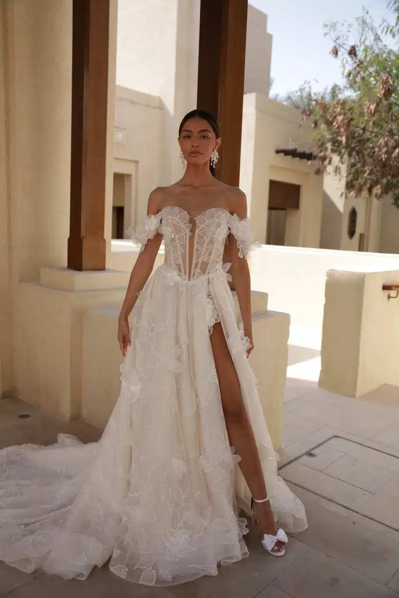 Extravagant und sinnlich zugleich begeistert es mit einem tiefen, herzförmigen Ausschnitt bis zum Bauchnabel, der feminine Eleganz neu interpretiert. Feine 3D-Blüten und außergewöhnliche Spitze setzen kunstvolle Akzente, während ein verführerischer Schlitz das Design aufregend unterstreicht. Der fließende Tüllrock verleiht dem Look Leichtigkeit und sorgt für einen unvergesslichen Auftritt voller Glamour und Romantik.