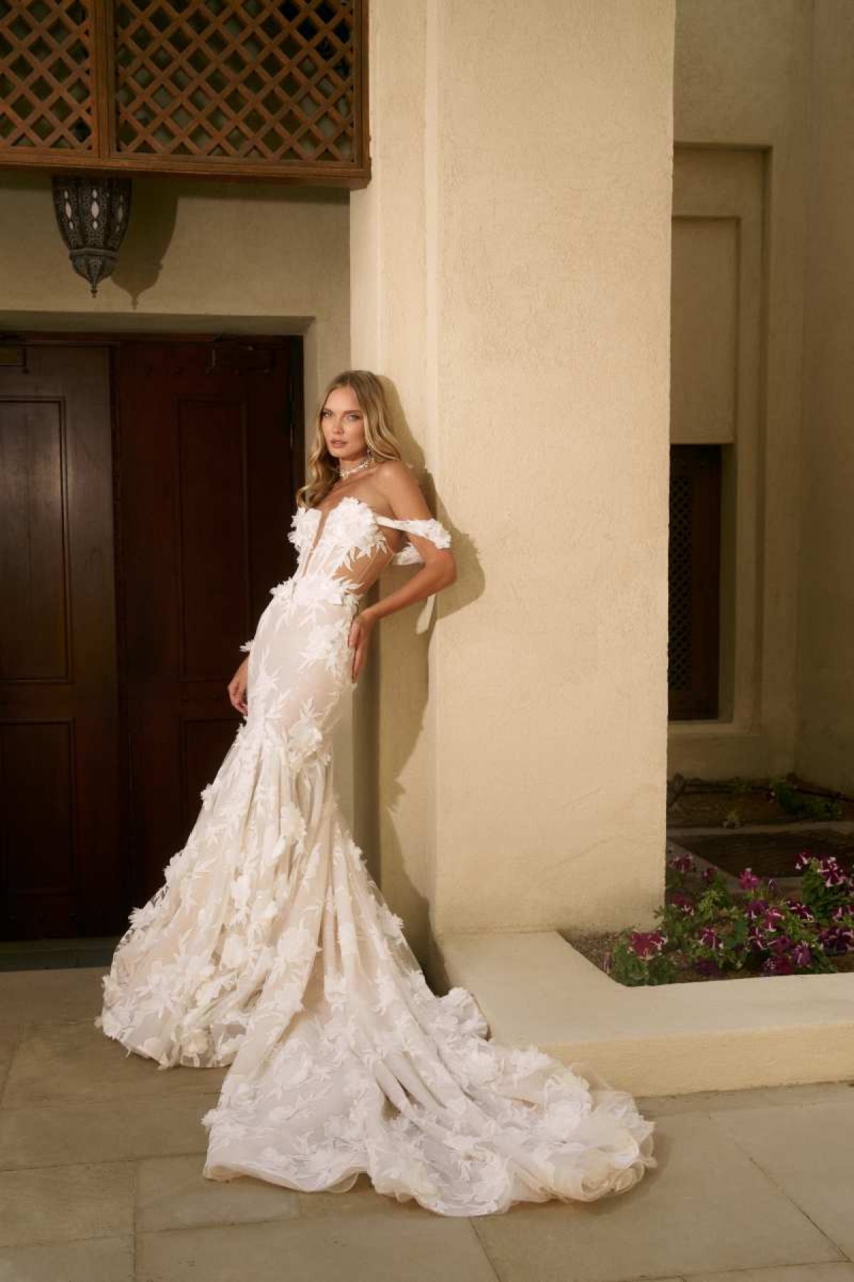Der figurbetonte Schnitt umschmeichelt gekonnt deine Kurven und fließt ab dem Oberschenkel in eine sanft ausgestellte Silhouette – perfekt für einen dramatischen Auftritt mit Eleganz. Ein tiefer V-Ausschnitt und seitliche Cut-Outs setzen verführerische Akzente, während die Off-Shoulder-Träger deine Schultern und das Dekolleté traumhaft in Szene setzen. Der transparente, tief ausgeschnittene Rücken sorgt für einen unvergesslichen Wow-Effekt – sowohl auf dem Weg zum Altar als auch auf der Tanzfläche. Das absolute Highlight: Das Kleid ist über und über mit kunstvollen 3D-Blumen bestickt, die dem Design eine romantisch-verspielte Textur verleihen.