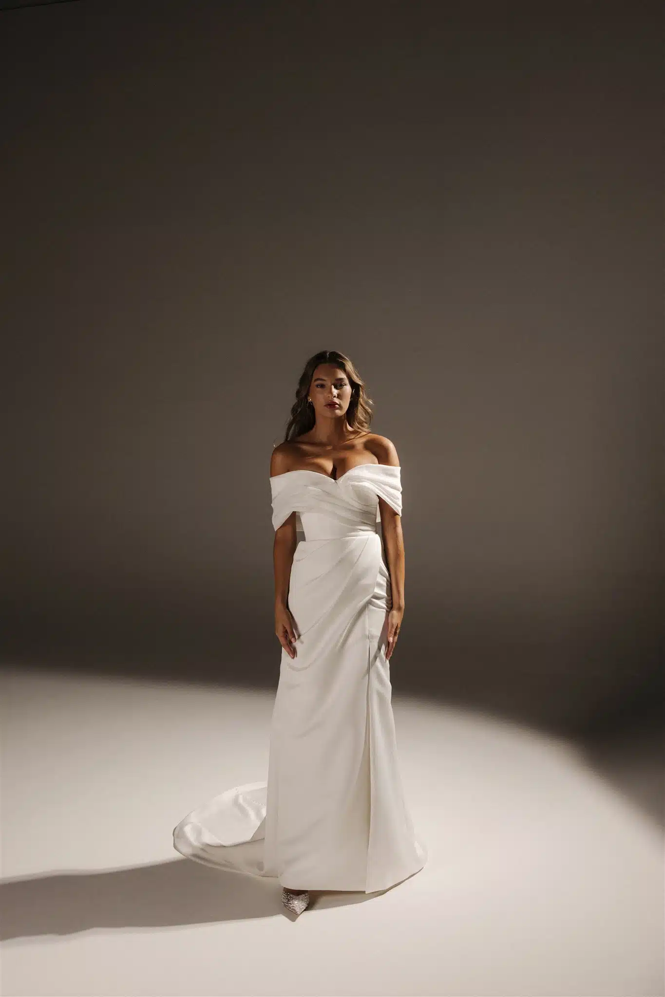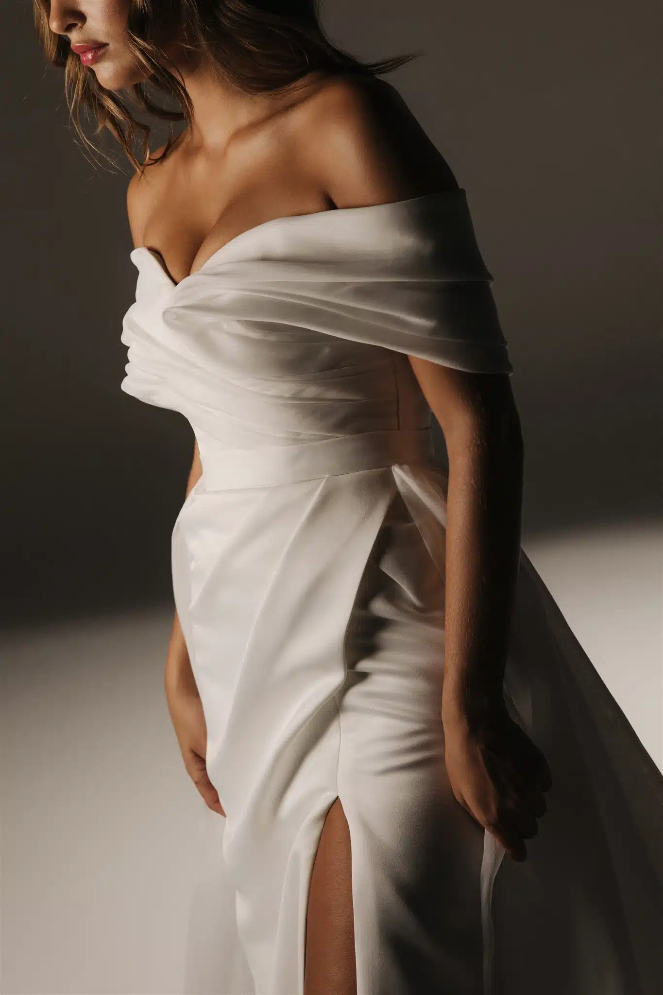 Das Henri-Kleid zeichnet sich durch sanft drapierten königlichen Organza aus, der sich über dem Korsett zu einer verträumten Rosette und eleganten Tropfenärmeln zusammenzieht. Das Mieder aus Dual Duchess-Satin macht schlank und stützt, bevor der nahtlose Mantelrock ab der Taille in Falten gelegt wird und einen oberschenkelhohen Schlitz bildet. Mit den Kunstperlen am Rücken ist Henri schon allein ein Klassiker. Mit dem Organza-Überrock kannst du die Romantik noch weiter steigern (separat erhältlich).
