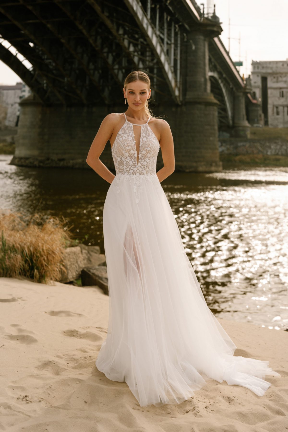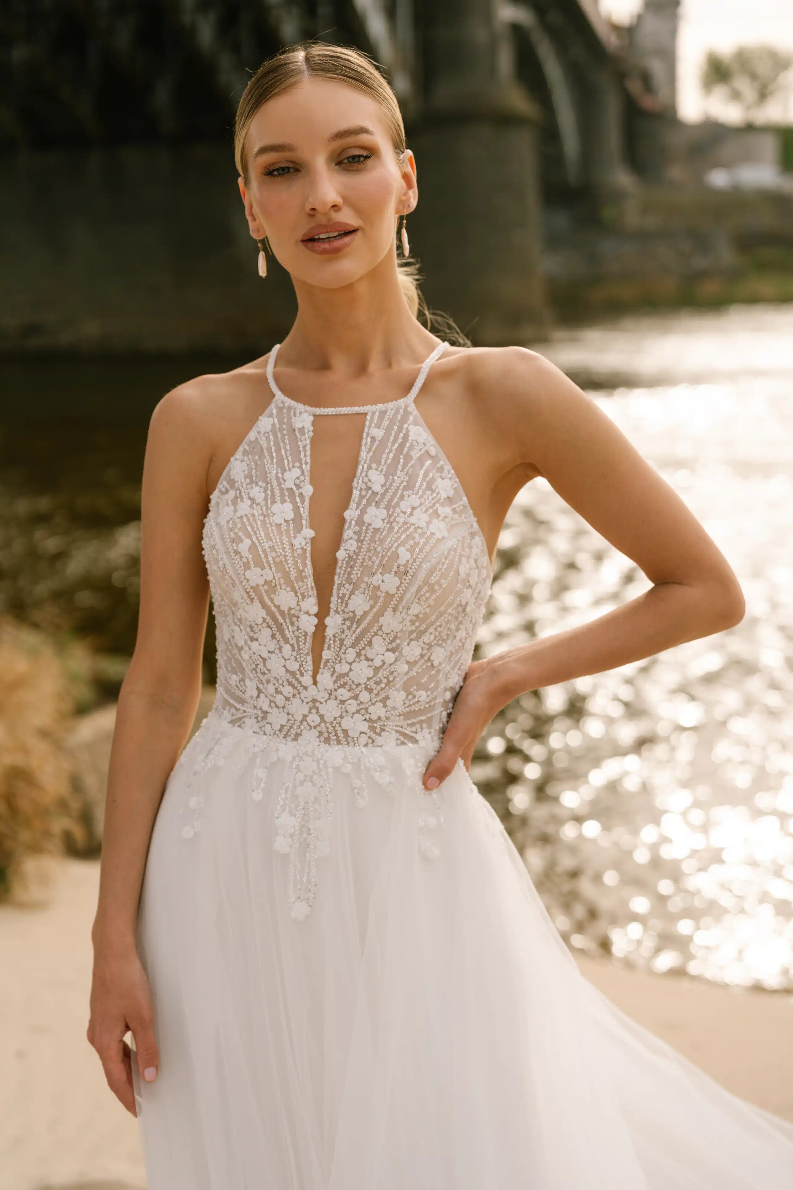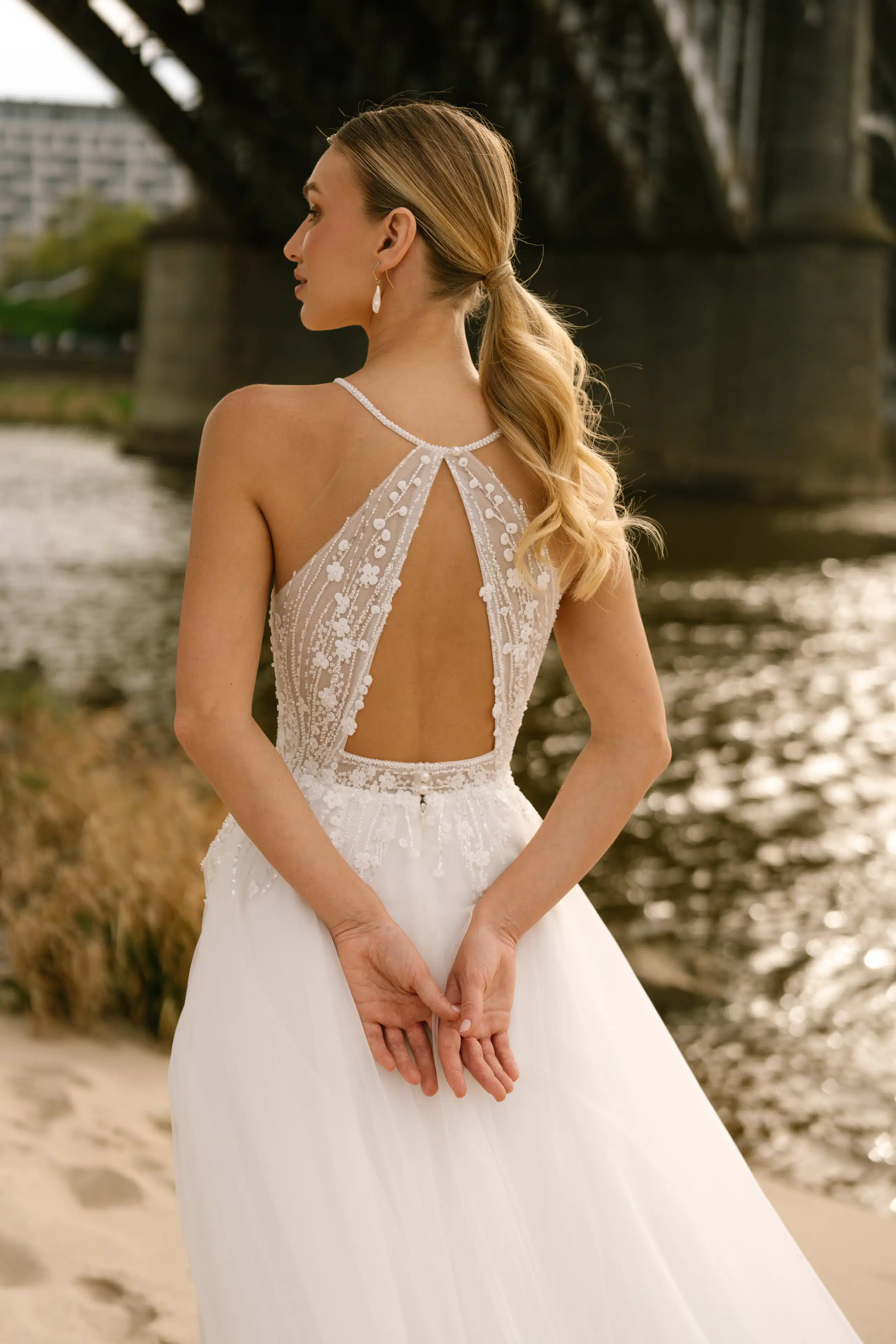 Die fließende A-Linie schmeichelt jeder Figur, während der tiefe V-Ausschnitt mit zarten Trägern für einen verführerischen Look sorgt. Das Oberteil funkelt mit Pailetten und feinen Spitzenapplikationen, die den glamourösen Stil unterstreichen. Ein seitlicher Schlitz und der zarte Tüllrock verleihen Leichtigkeit und Bewegung. Das Highlight: der dreieckige Schlüssellochausschnitt am Rücken, dessen Träger zu einem eleganten Neckholder zusammenlaufen – perfekt für unvergessliche Auftritte.