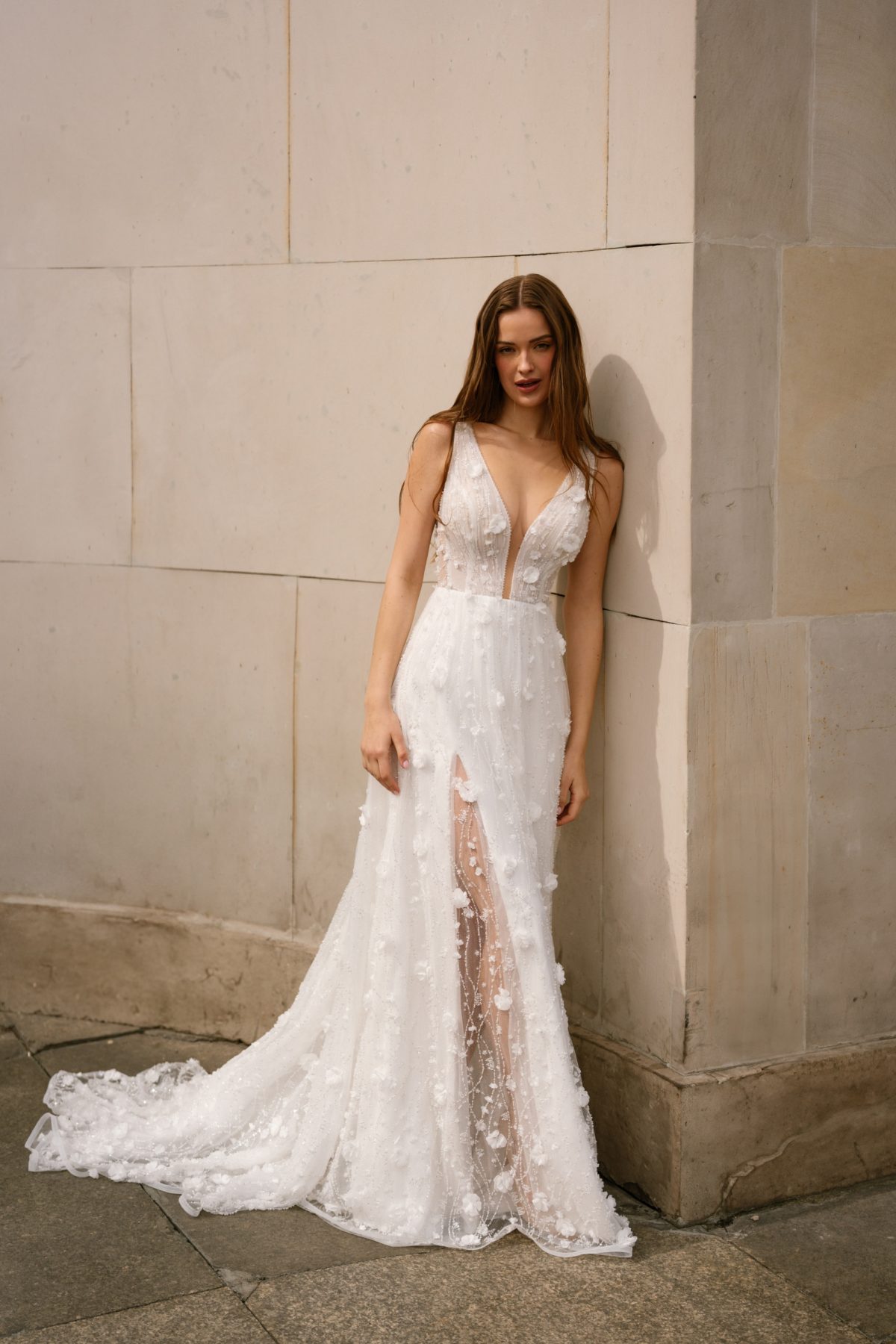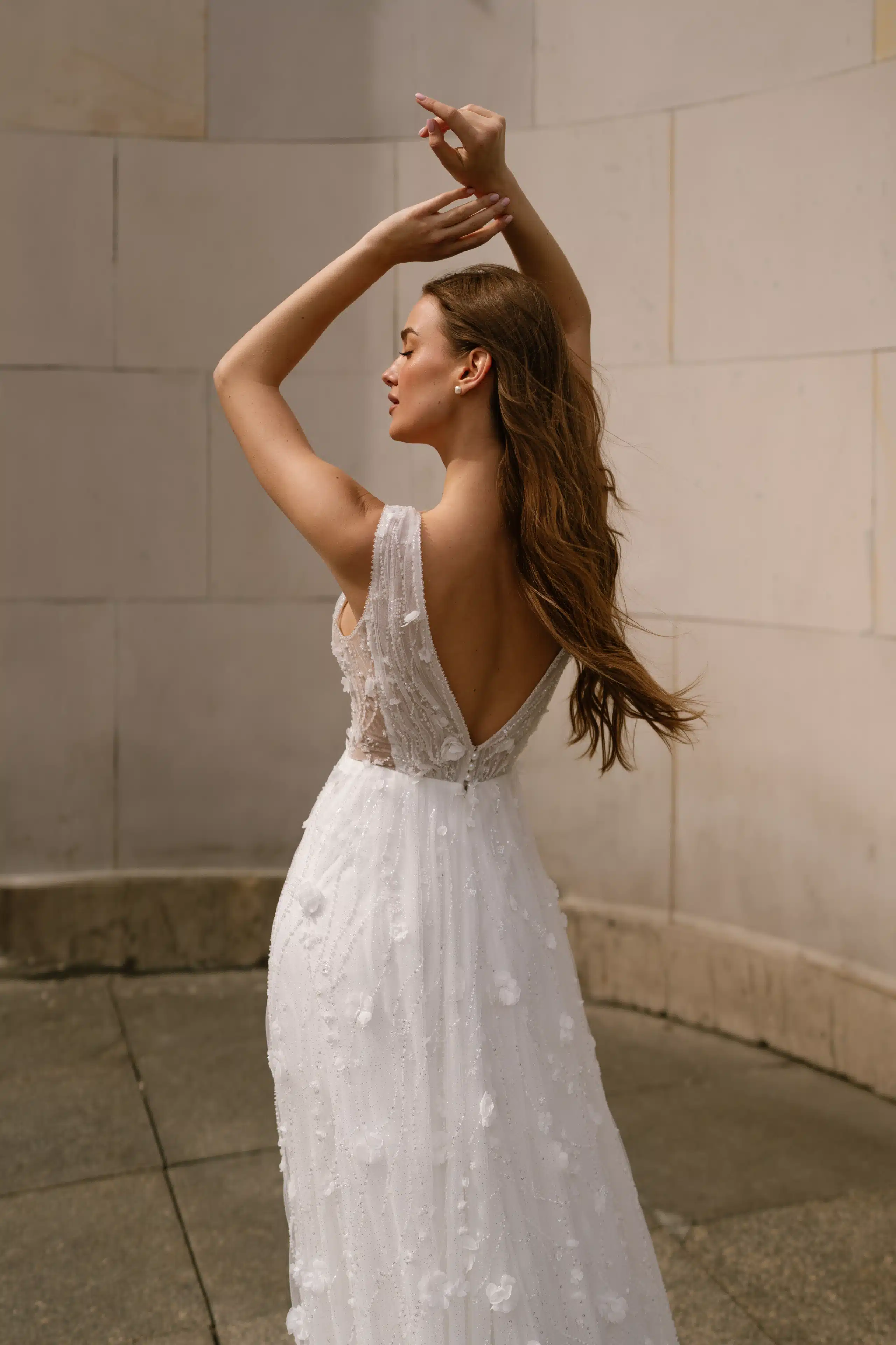 Die fließende A-Linie umschmeichelt die Silhouette, während der tiefe V-Ausschnitt mit breiten Trägern einen eleganten Akzent setzt. Zarte Pailletten und kunstvolle 3D-Blumen durchziehen das gesamte Kleid und verleihen ihm einen romantischen Schimmer. Ein raffinierter Schlitz, sanft von einer Lage Tüll umspielt, sorgt für moderne Leichtigkeit. Der tiefe Rückenausschnitt rundet das Design ab – sinnlich, stilvoll und absolut unvergesslich.