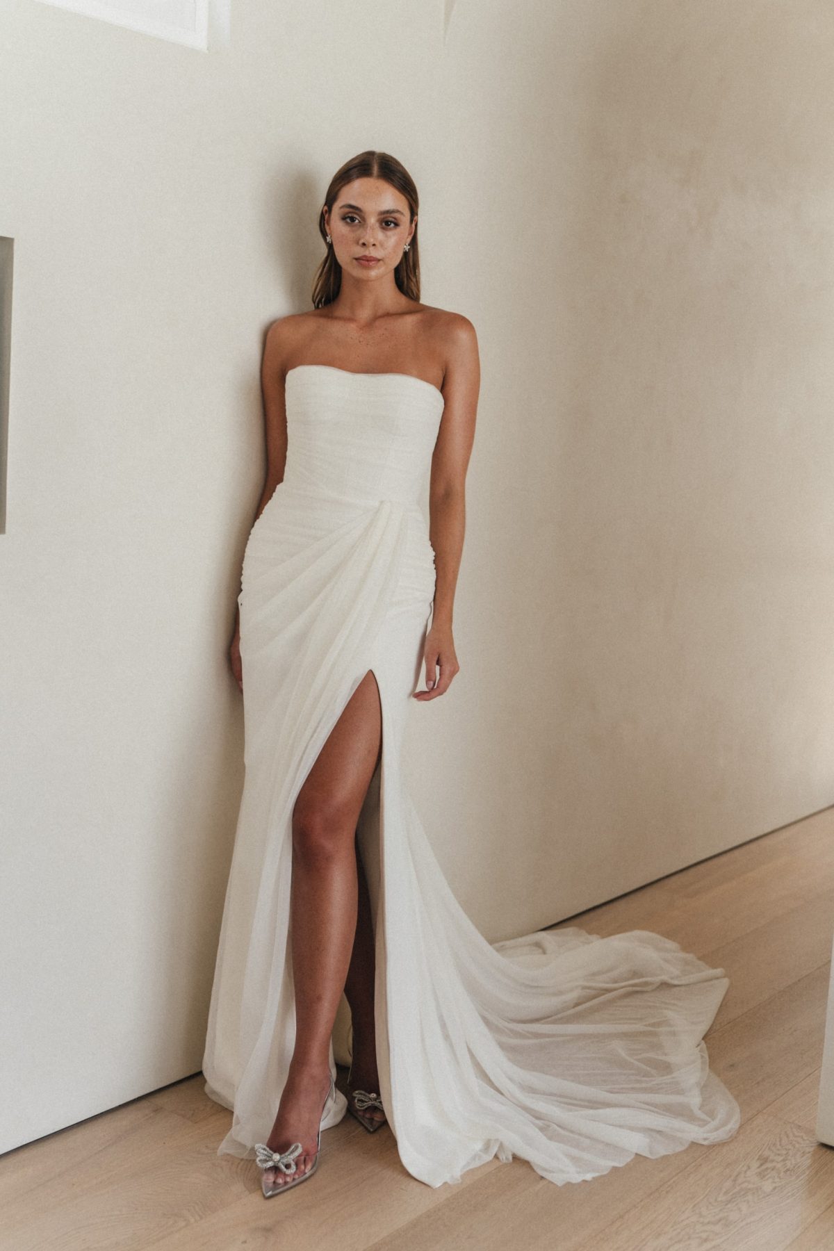 Das Ixora-Kleid ist subtil und doch erhaben. Ein trägerloses, mit weichem Tüll drapiertes Mieder verwandelt dich in eine lebende Skulptur, die von zahlreichen Verehrern angehimmelt werden kann. Verkörpere statuenhafte Verführung mit anmutigem Minimalismus und lass dein Herz sich neu verlieben.