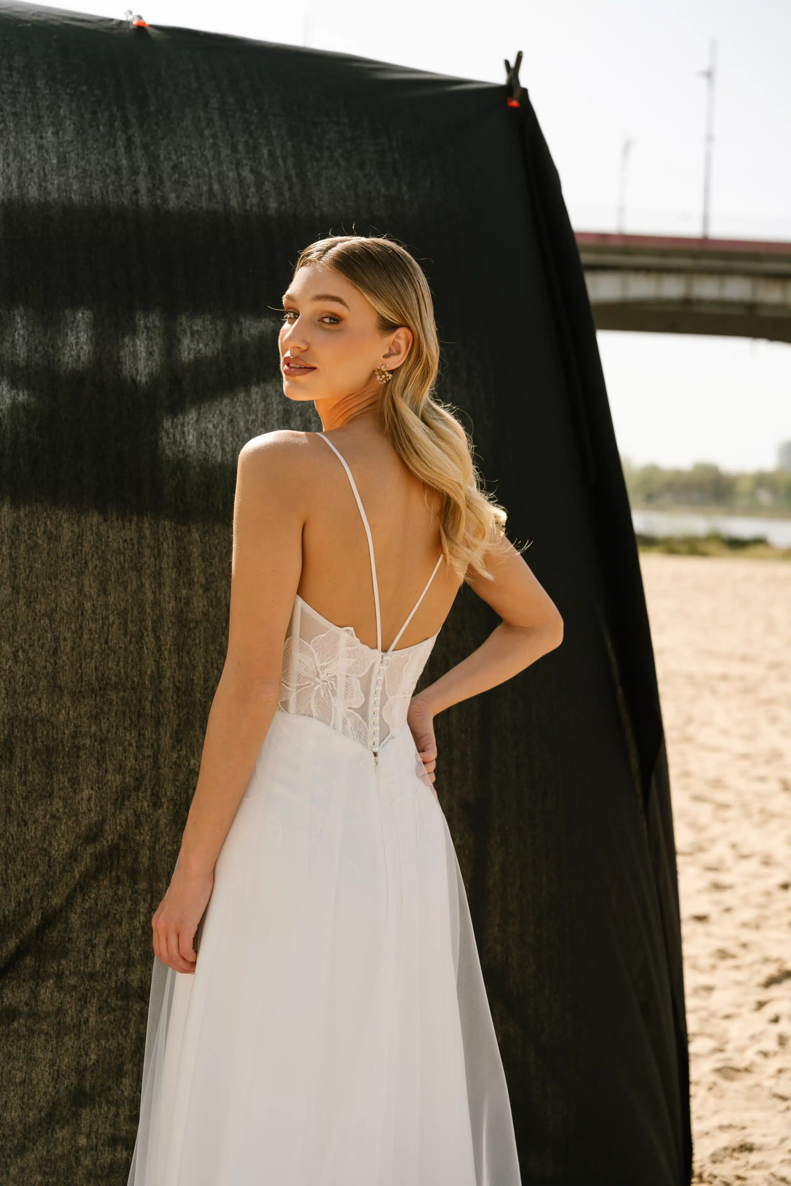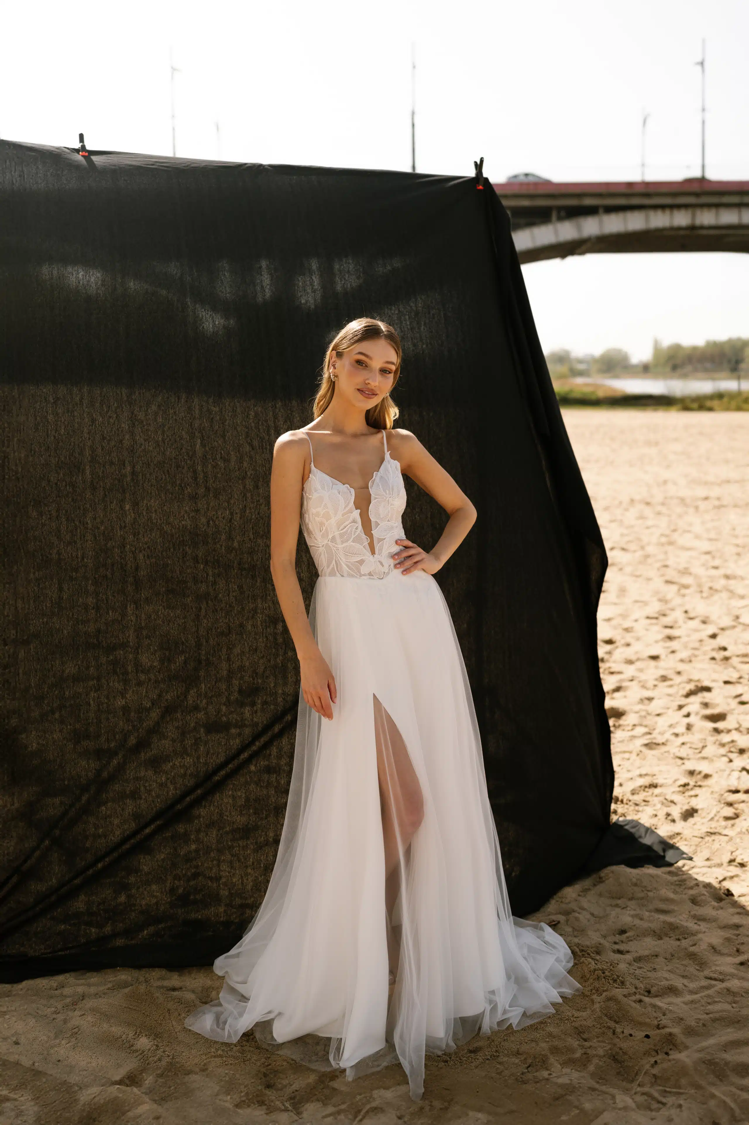 Dieses Brautkleid verzaubert mit einer fließenden A-Linie und einem zarten Softtüllrock mit verführerischem Schlitz. Der feminine V-Ausschnitt mit feinen Spaghetti-Trägern setzt das Dekolleté gekonnt in Szene, während große Blumenapplikationen im Oberteil für einen romantischen Hingucker sorgen. Ein Traum aus Bewegung, Stil und moderner Romantik.