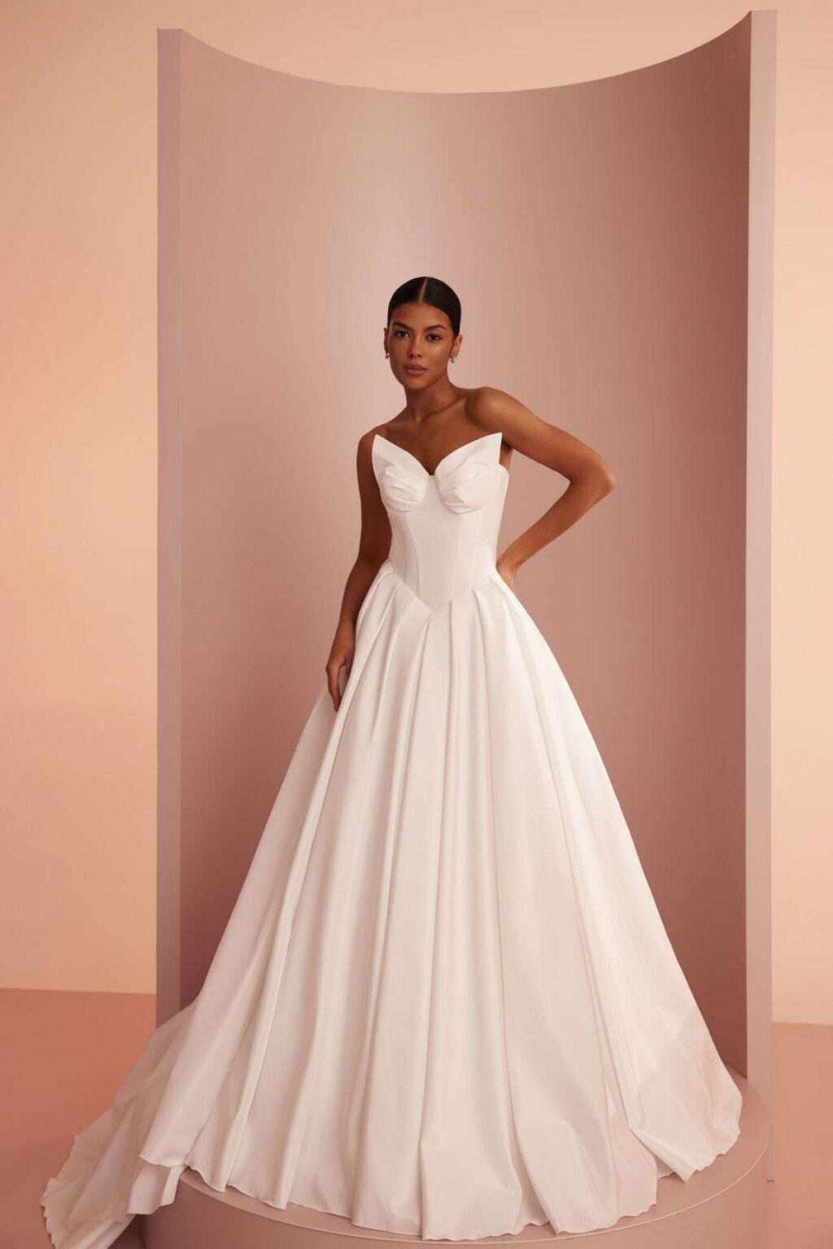 Dieses Brautkleid ist ein echter Hingucker für die moderne Braut, die Eleganz und Extravaganz vereinen möchte. Der einzigartige Ausschnitt besticht durch nach oben verlaufenden Stoff, der dem Dekolleté eine stilvolle Raffinesse verleiht. Das Oberteil endet in einer eleganten Spitze, die den Blick nach unten zieht und die Silhouette vorteilhaft betont. Der weit ausgestellte Rock mit edlen Kellerfalten sorgt für Volumen und eine romantische A-Linien-Form, die perfekt für den großen Auftritt ist. Ein Kleid für Bräute, die mit moderner Eleganz im Rampenlicht stehen möchten.