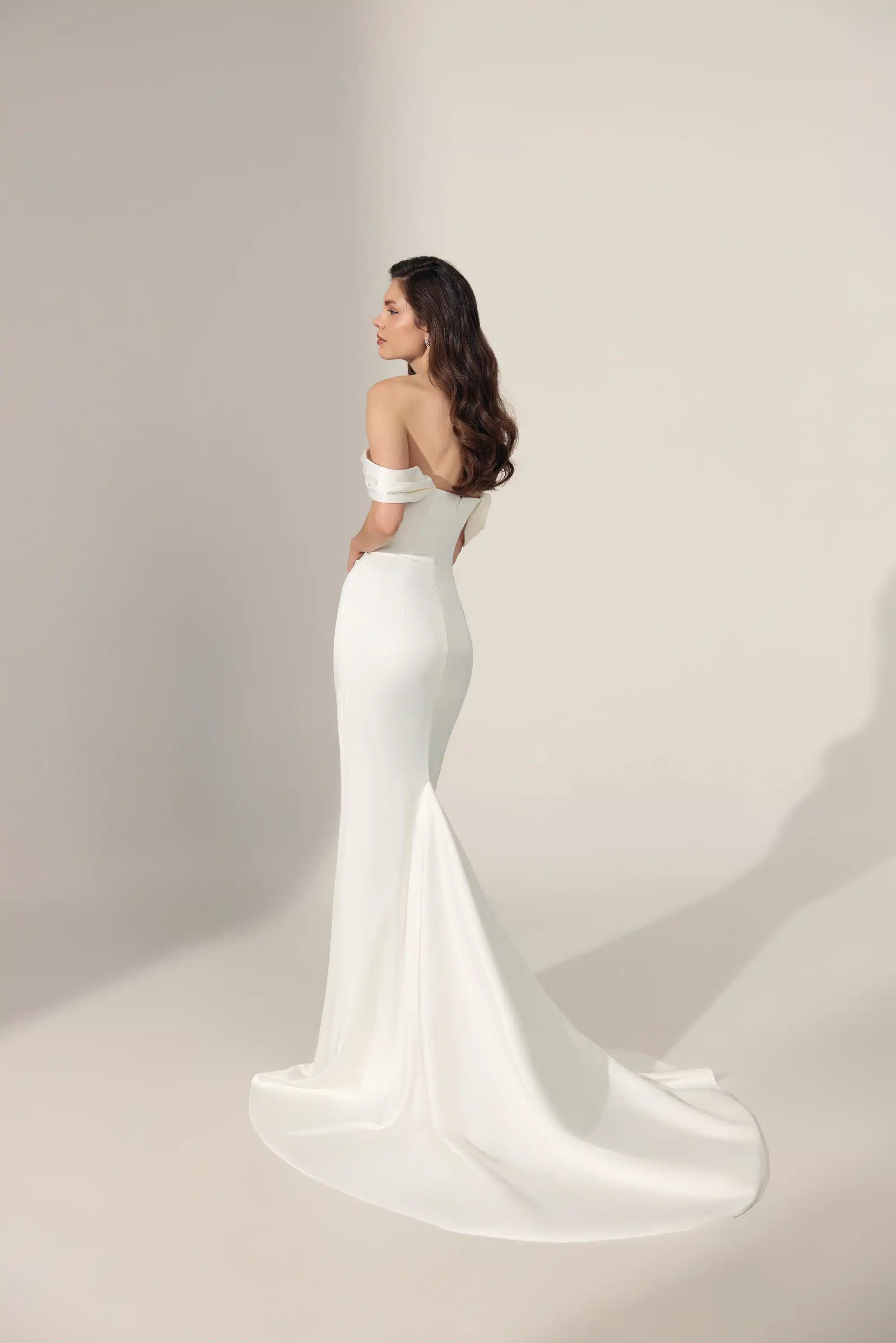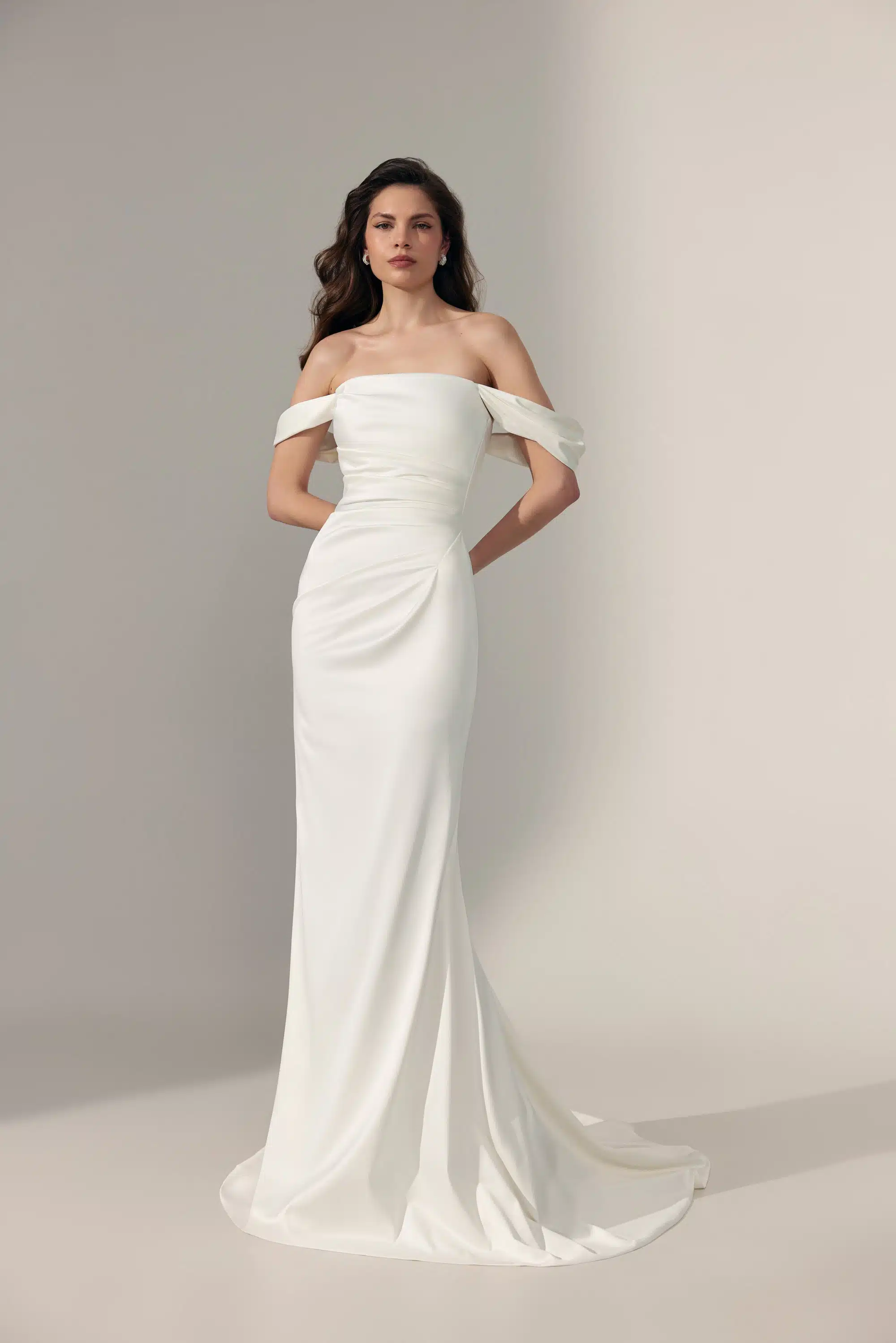 Ein minimalistisches Fit-&-Flare-Brautkleid, das moderne Eleganz neu definiert: Der gerade Ausschnitt und zarte Off-Shoulder-Träger setzen ein klares, zeitloses Statement. Dezente Raffungen an Taille und Bauch formen eine feminine Silhouette und sorgen für einen harmonischen, schmeichelnden Look. Ein Kleid für Bräute, die pure Ästhetik und stilvolle Zurückhaltung lieben.