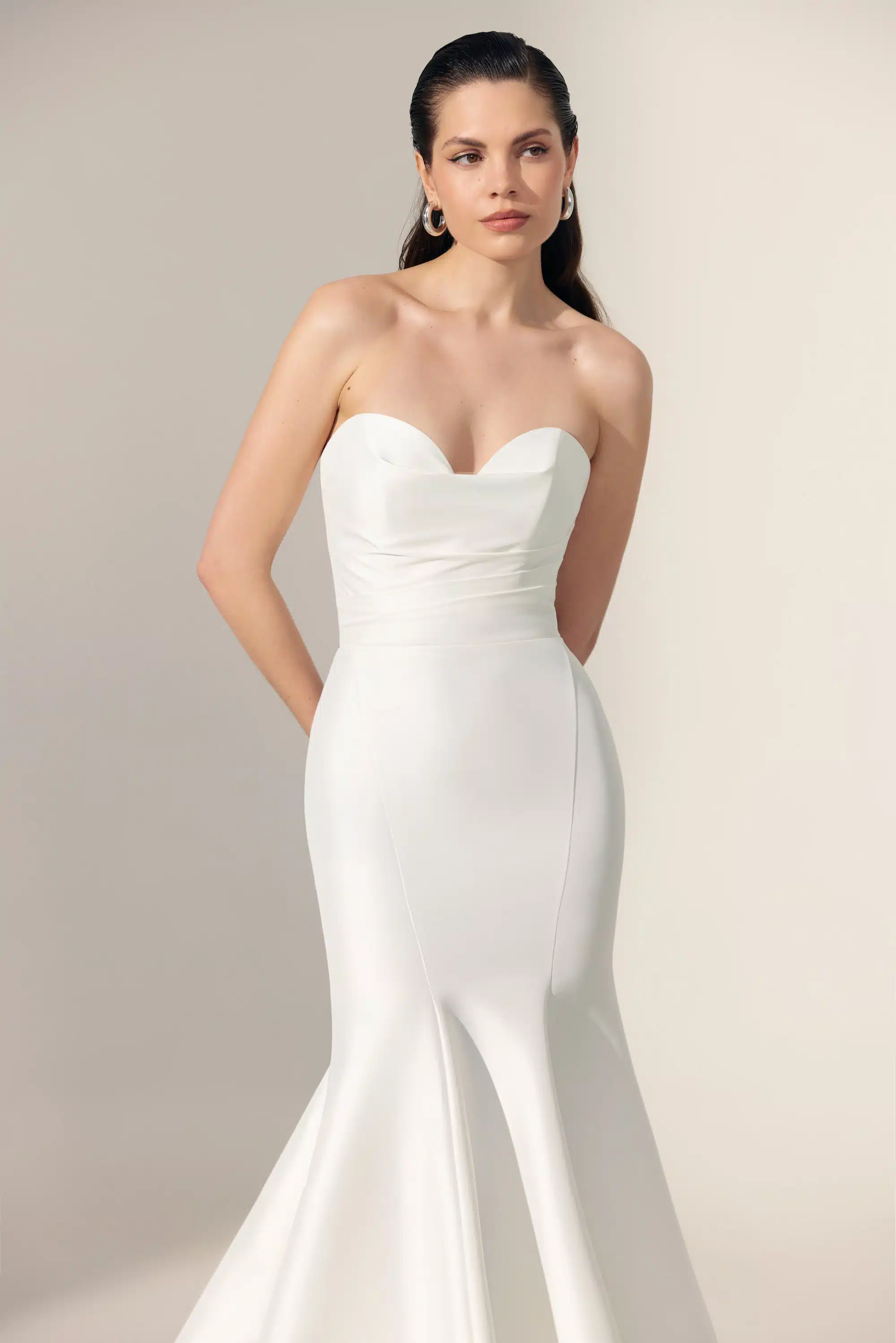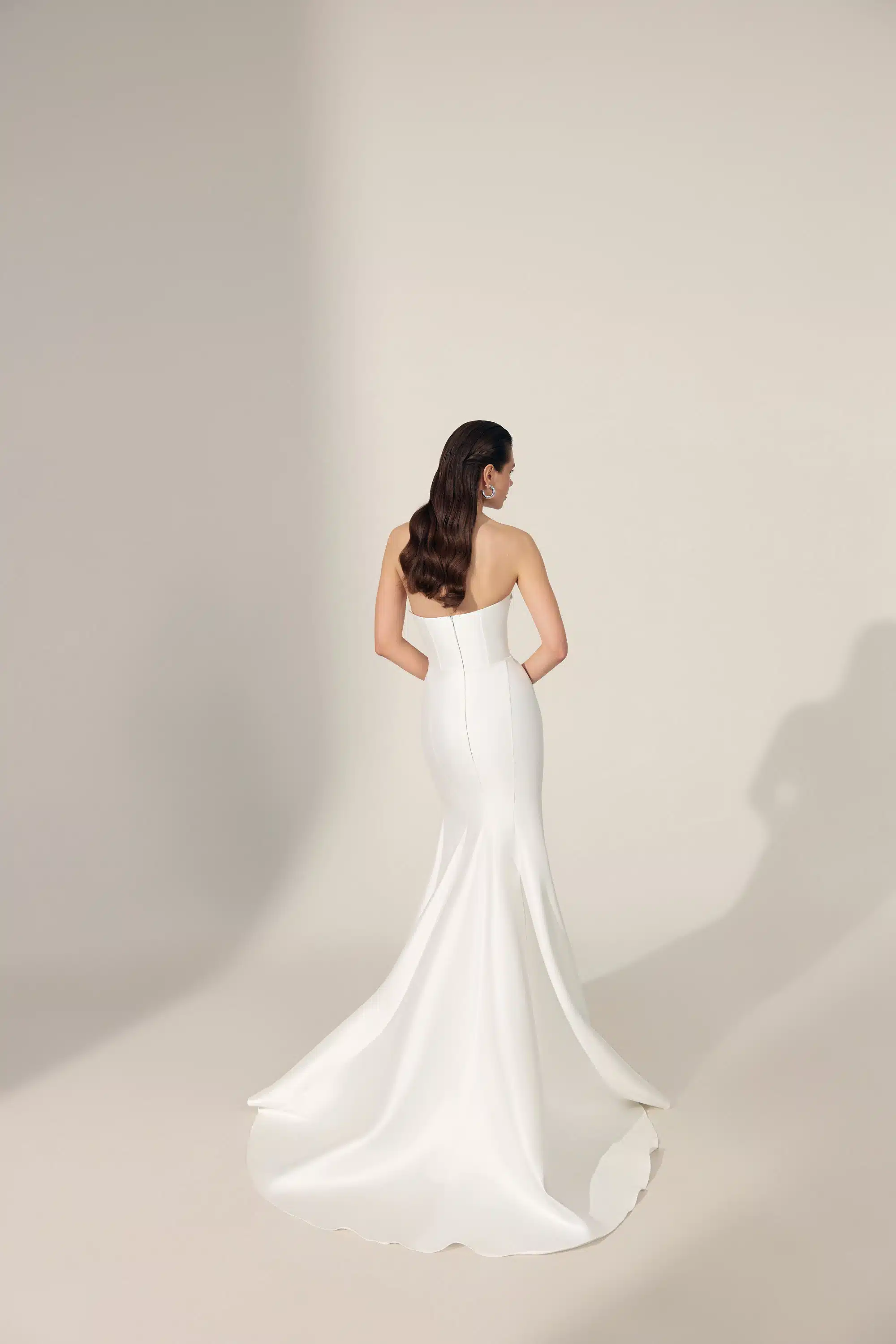 Dieses Brautkleid vereint pure Eleganz mit einem Hauch moderner Sinnlichkeit. Der figurbetonte Meerjungfrau-Schnitt formt eine schlanke, feminine Silhouette, während der sanfte Herzausschnitt das Dekolleté stilvoll betont. Reduzierte Details, klare Linien und hochwertige Stoffe machen dieses Kleid zum perfekten Statement für Bräute, die eine zeitlose, minimalistische Ästhetik lieben.