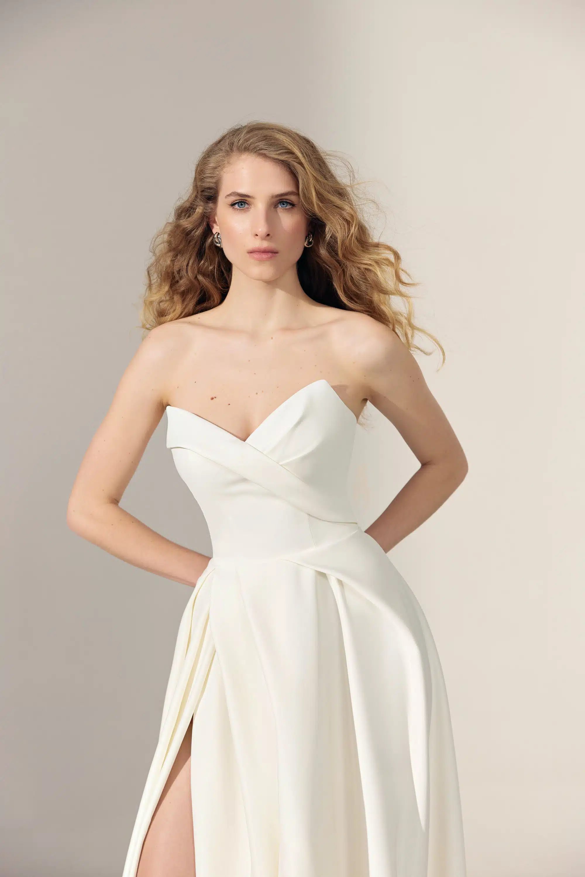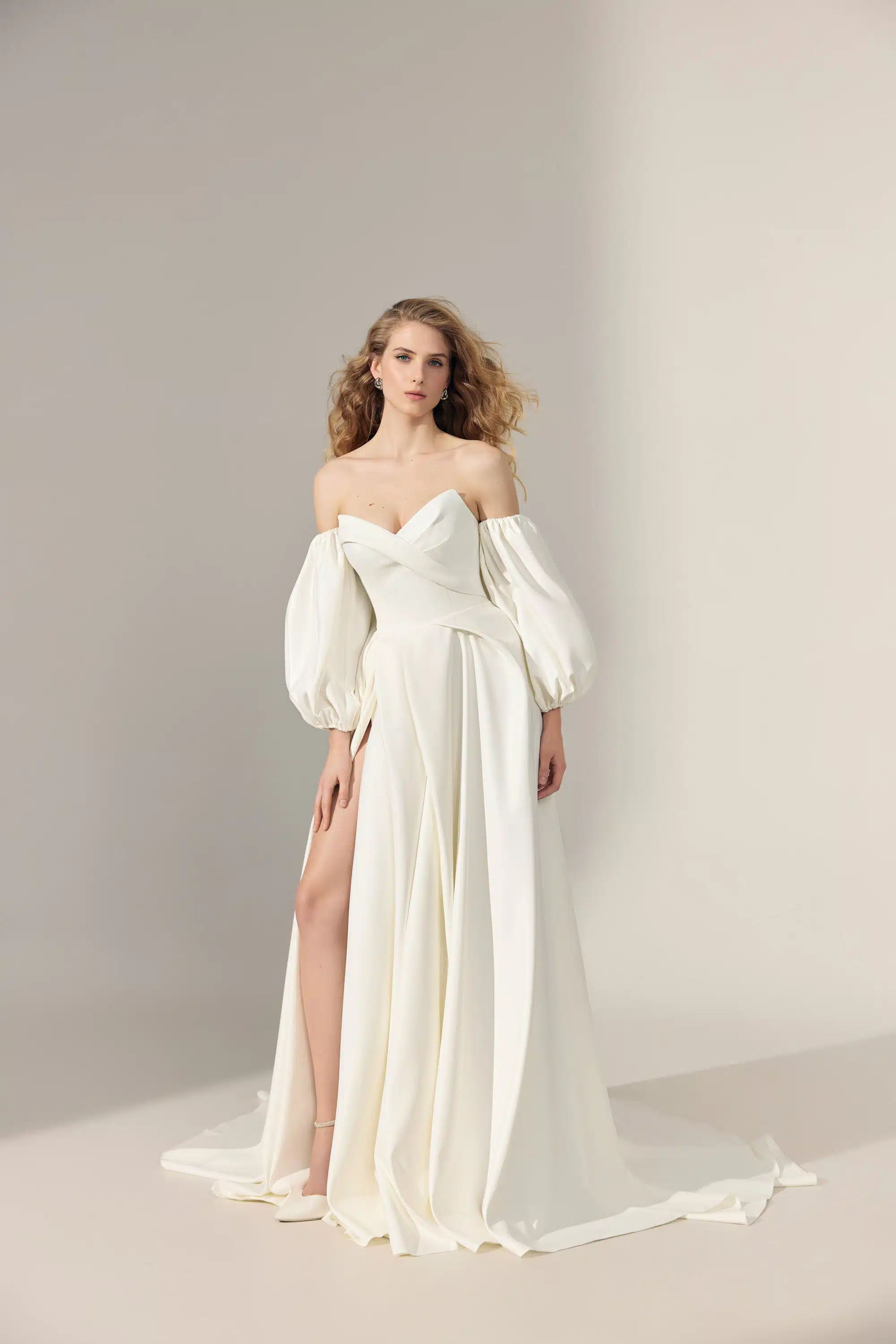 Dieses minimalistische A-Linien Brautkleid aus mattem Satin verzaubert mit seinem klaren Design und raffinierten Details. Der trägerlose V-Ausschnitt läuft spitz nach oben aus und setzt das Dekolleté stilvoll in Szene, während die abnehmbaren Ballonärmel einen Hauch verspielter Romantik hinzufügen. Der seitliche Schlitz im fließenden Rock sorgt für moderne Leichtigkeit und eine feminine Silhouette – perfekt für einen unvergesslichen Auftritt.
