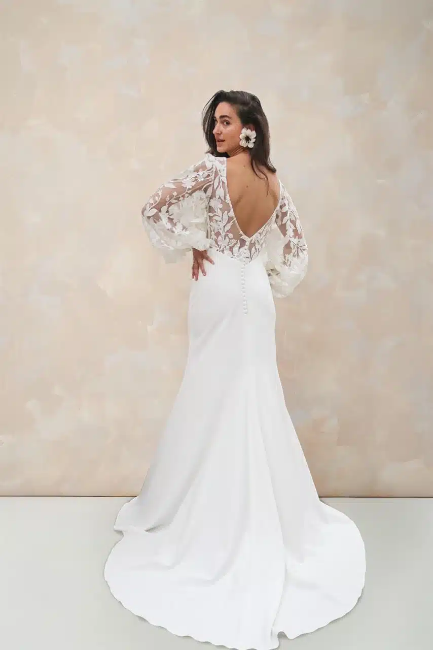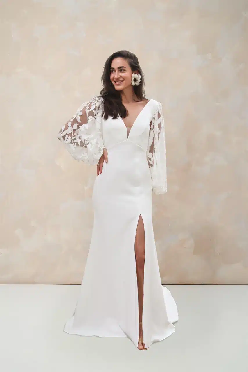 La Grande Amore ist ein schmeichelhaftes Crepe-Kleid mit romantischen Akzenten. Der V-Ausschnitt hat einen Einsatz aus durchscheinendem Tüll, während der offene Rücken und die voluminösen langen Ärmel aus floral besticktem Tüll bestehen. Der Meerjungfrauenrock hat einen vorderen Schlitz und eine Kapellenschleppe.