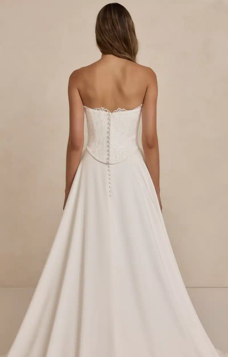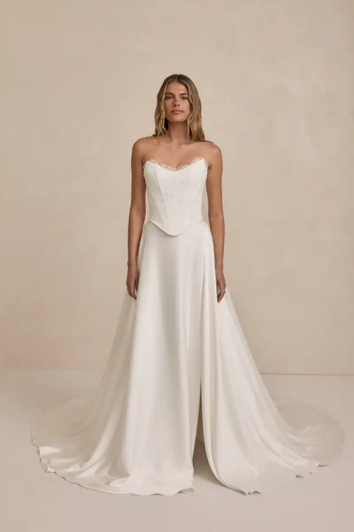 Das Landon ist ein atemberaubendes zweiteiliges Kleid, das die Eleganz eines separaten Oberteils und Rocks für vielseitige Stylingmöglichkeiten bietet. Das Oberteil ist aus zarter Blair-Spitze gefertigt und mit der charakteristischen Blair-Verzierung versehen, die sich durch die schmeichelhafte Tate-Oberteilform auszeichnet. Der Rock aus luxuriösem Harvey-Satin besticht durch eine elegante Silhouette mit hohem Schlitz und dünnem Gürtel, der einen auffälligen Hauch von Drama verleiht. Zusammen sorgen Oberteil und Rock für einen auffälligen und modernen Brautlook mit zeitlosem Charme.