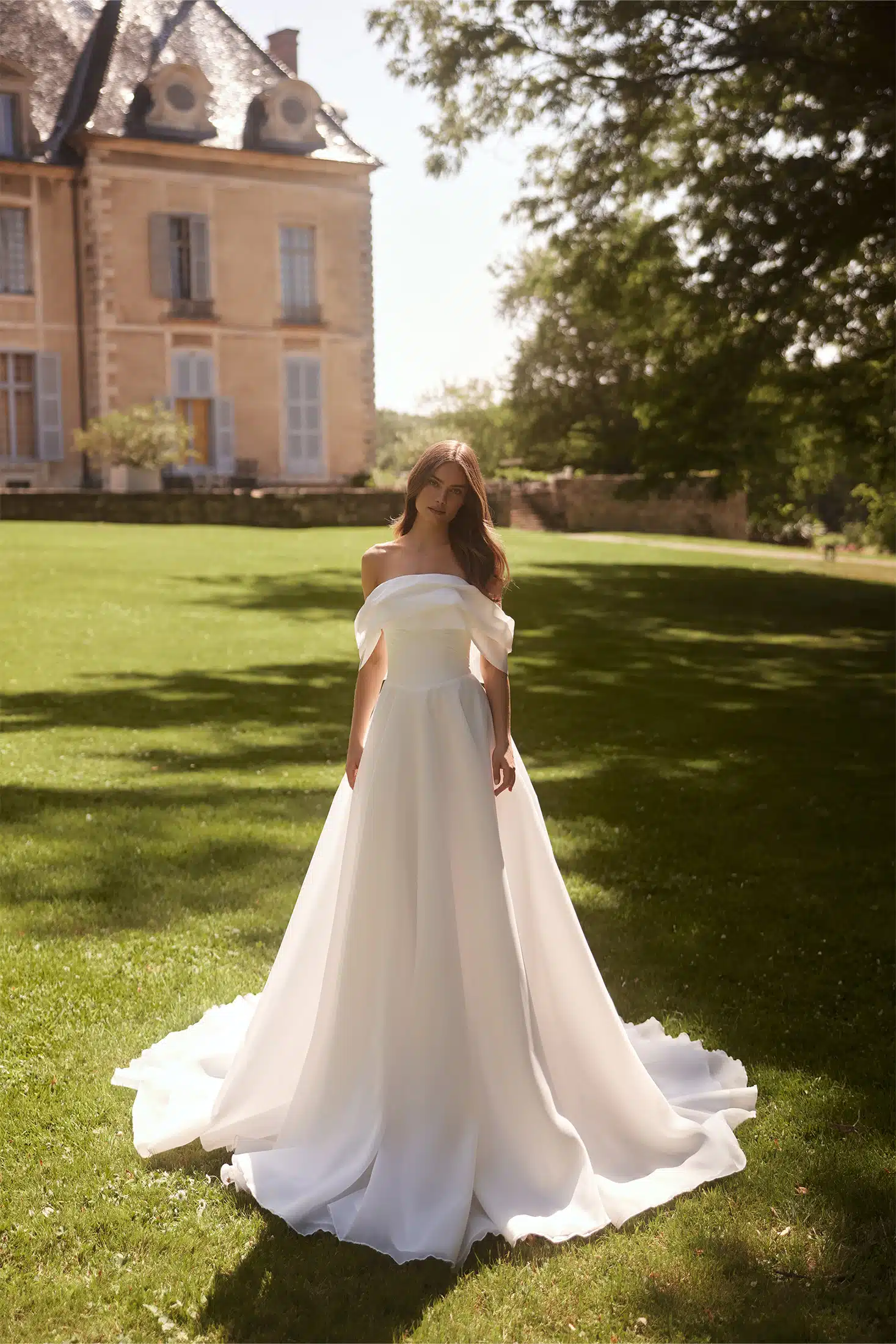 Eleganz trifft auf zeitlose Schlichtheit – dieses Brautkleid aus edlem Satin überzeugt mit seinem glatten, luxuriösen Glanz und einem geraden, trägerlosen Ausschnitt, der feminine Zurückhaltung und moderne Klarheit vereint. Das Kleid kommt mit einem passenden Bolero, der über das Top gezogen wird: Er bleibt off-shoulder und legt sich sanft über den Brustbereich – für einen Hauch von Romantik und Raffinesse, ohne die schlichte Silhouette zu stören. Ein Look, der pure Eleganz ausstrahlt – minimalistisch, sinnlich und perfekt für die moderne Braut.