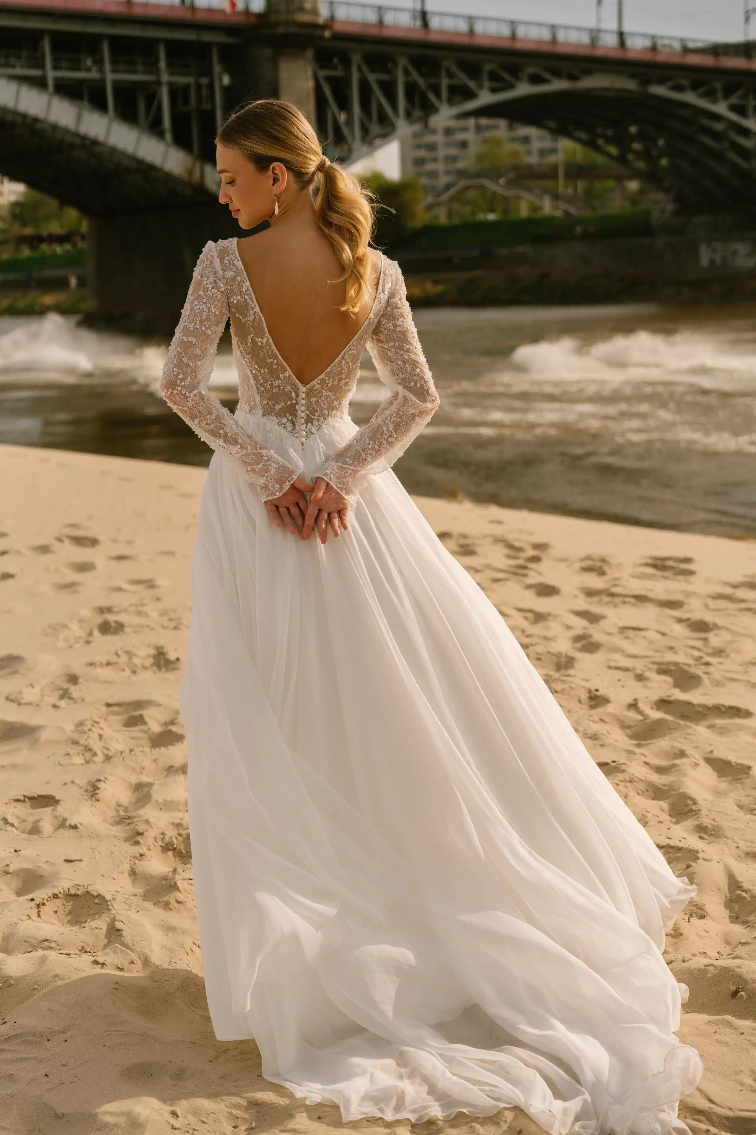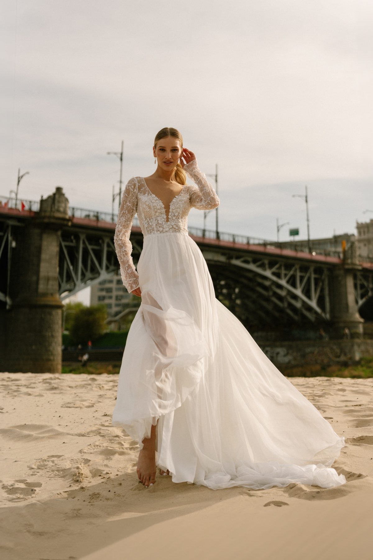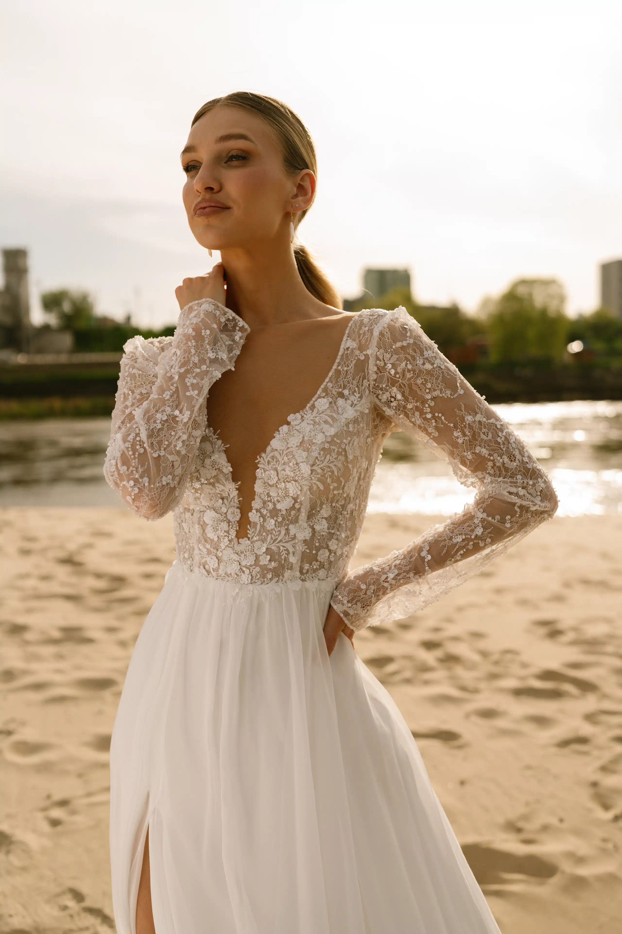 Dieses Brautkleid verführt mit einer fließenden A-Linie und einem zarten Chiffonrock mit seitlichem Schlitz. Das Oberteil glänzt dezent durch funkelnde Pailetten, während der V-Ausschnitt und lange Ärmel für moderne Raffinesse sorgen. Ein tiefer Rückenausschnitt rundet das zeitlose Design perfekt ab – für einen unvergesslichen Auftritt am großen Tag.