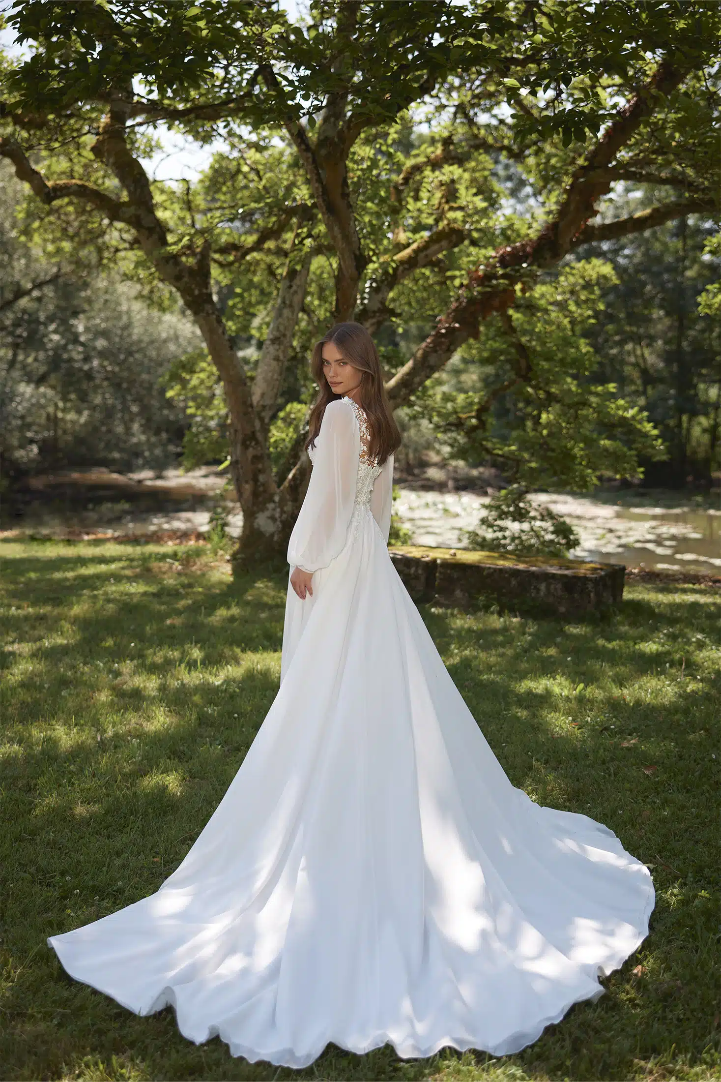 Dieses romantische A-Linien Brautkleid verbindet ein zartes Oberteil aus feiner Spitze mit einem leicht fließenden Chiffonrock. Das Dekolleté wird durch den V-Ausschnitt betont, während der elegante Schlitz für eine moderne Silhouette sorgt. Leichte Chiffonärmel verleihen dem Look eine sanfte Note.