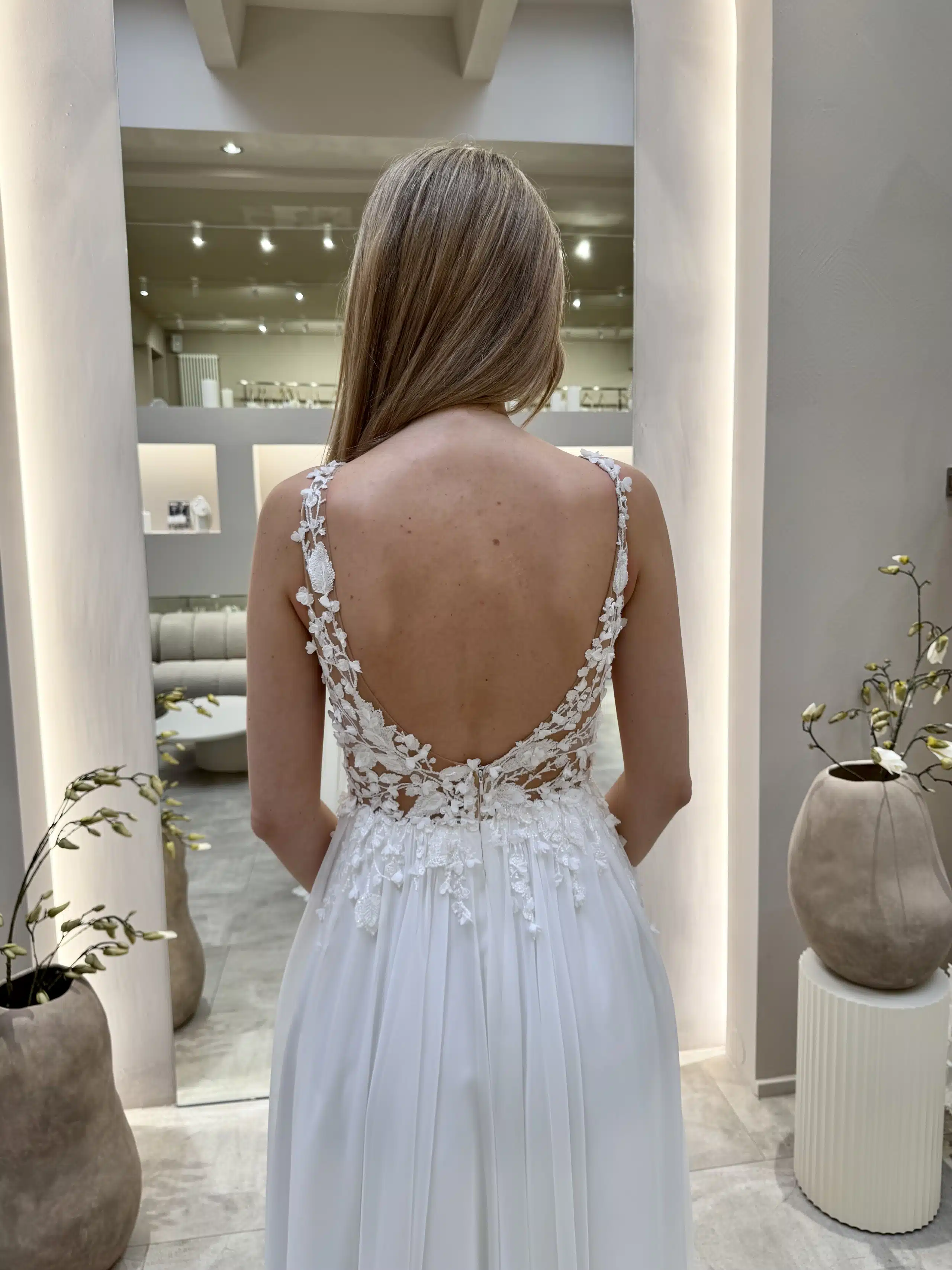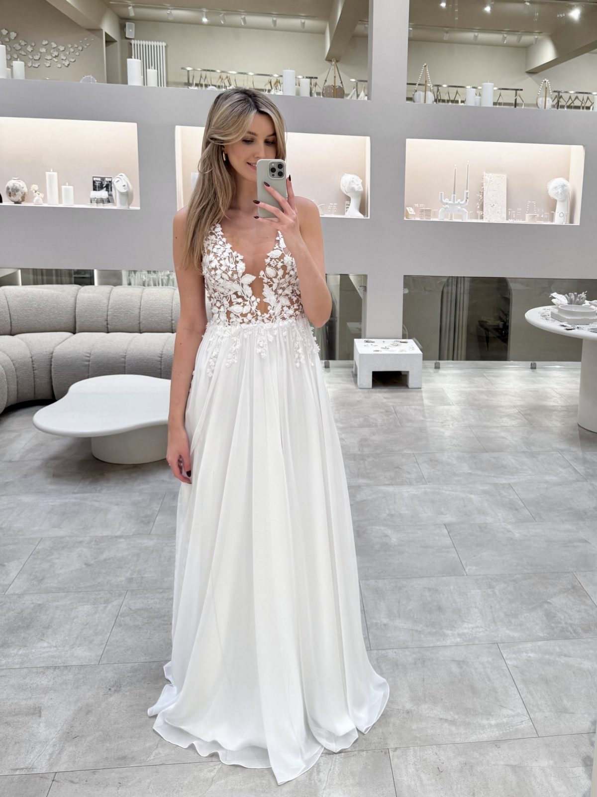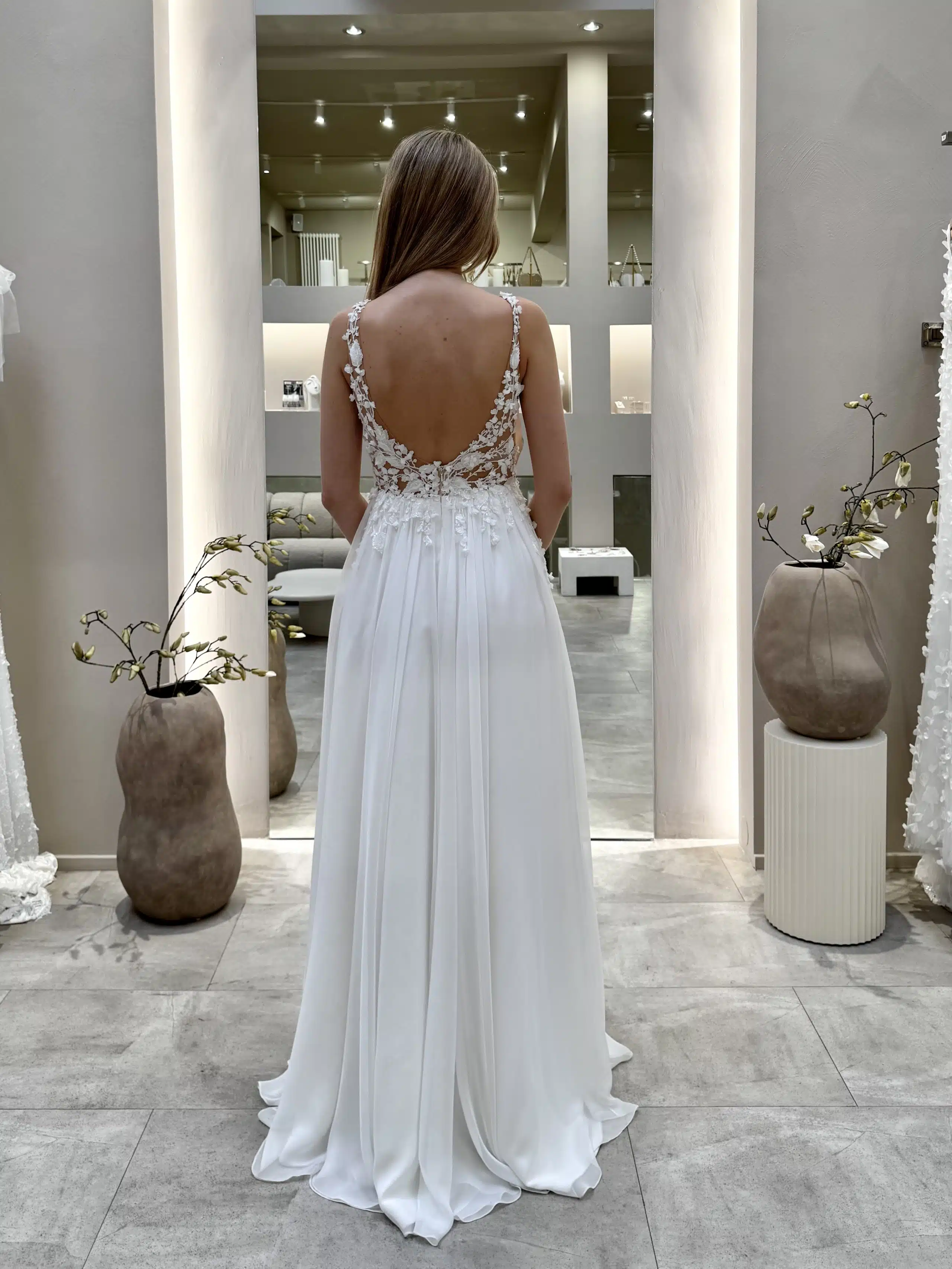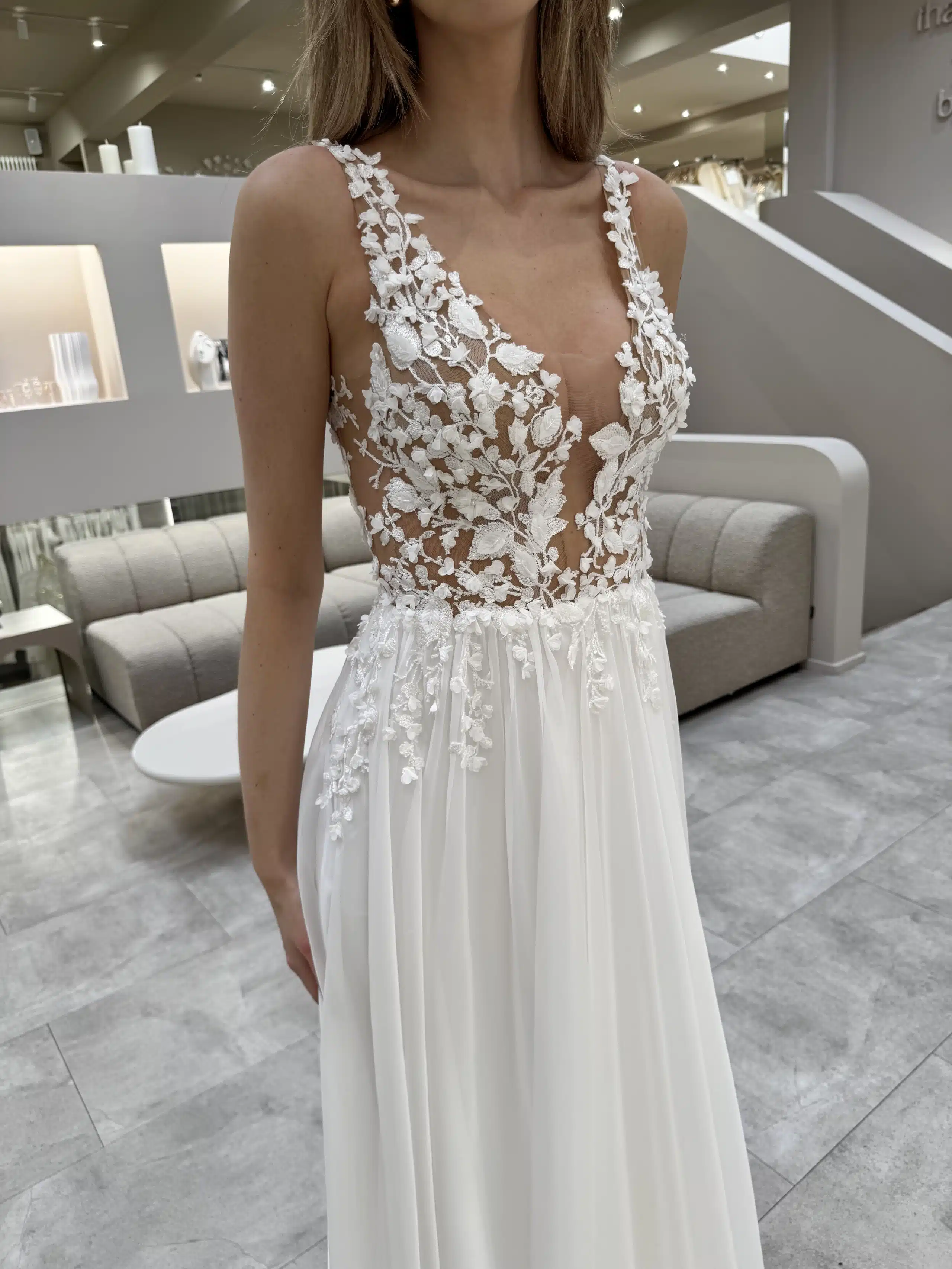 Ein Hauch von Romantik in seiner reinsten Form – dieses A-Linien-Brautkleid verzaubert mit einem tiefen V-Ausschnitt und einem zart bestickten Spitzenoberteil, das sanft in einen fließenden Chiffonrock übergeht. Die feine Spitze betont das Dekolleté auf elegante Weise, während der leichte Stoff für eine traumhafte Silhouette sorgt. Ideal für Bräute, die sich einen modernen, romantischen Look mit müheloser Eleganz wünschen.