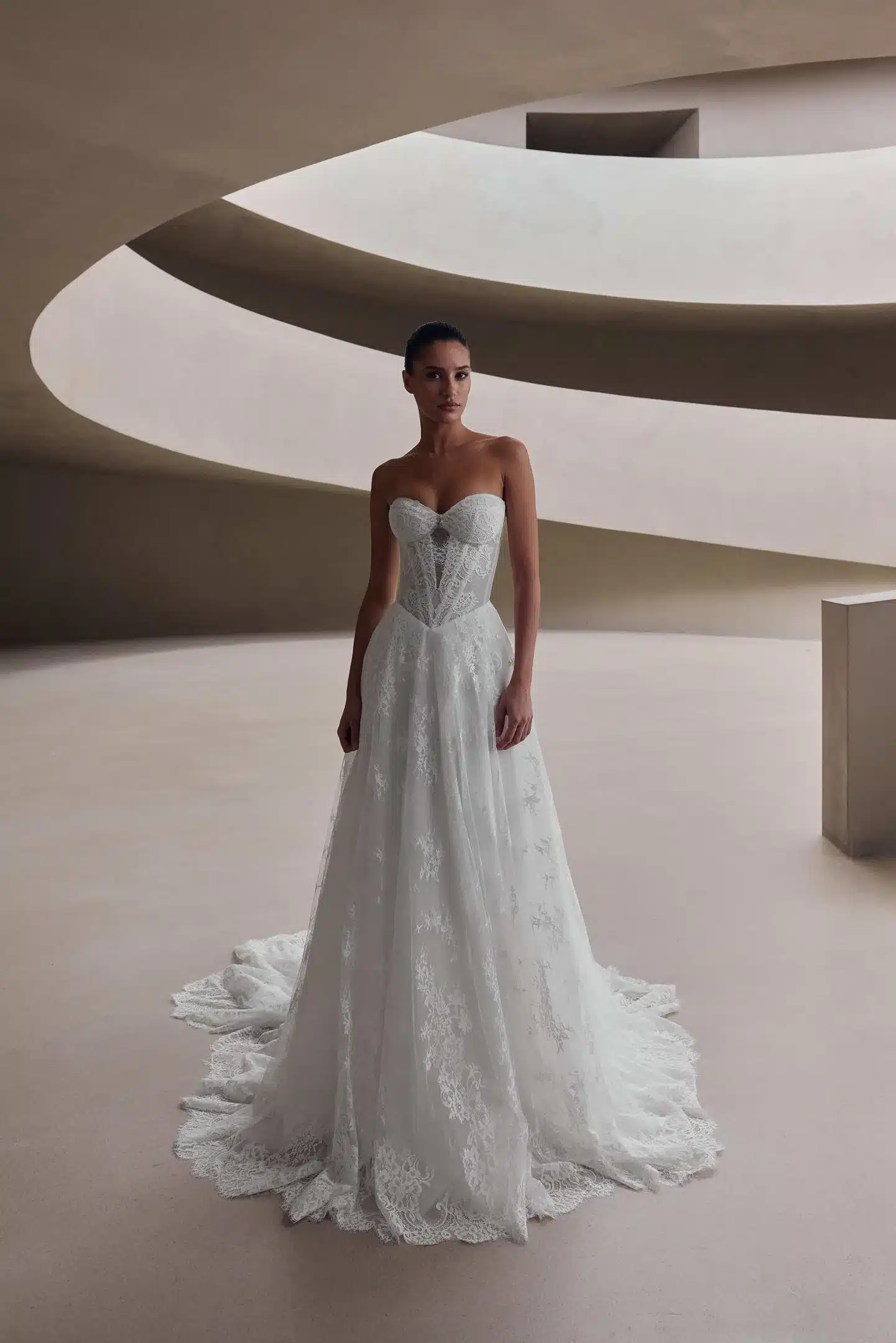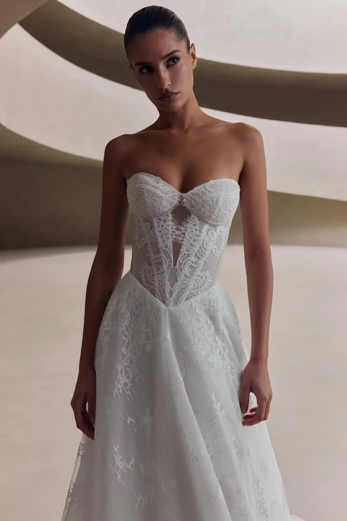 Ärmelloses Brautkleid in A-Linie aus zarter Chantilly-Spitze. Ein strukturiertes Korsettoberteil mit dezentem Illusionsausschnitt betont das Dekolleté und betont die Taille, während der ausgestellte Rock für leichtes Volumen und fließende Bewegung sorgt. Runde den Look mit dem Spitzen-Choker von Elarinne ab, der dem Ganzen Tiefe und einen romantischen Touch verleiht.